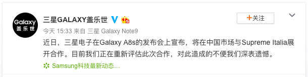 Samsung ha ritrattato la collaborazione con Supreme Italia Sull'account weibo della multinazionale è appena apparso un messaggio di scuse