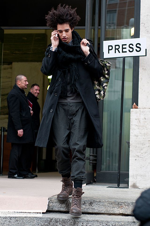 Segue Emporio Armani alle ore 10.30. Metropolitano, calato in una realtà cittadina in cui muoversi con abiti e capi fluidi che permettano libertà di movimenti. L'uomo Emporio Armani per la prossima stagione fredda evoca una realtà urbana in cui sfoggiare cappotti, a volte doppiati con gilet, a dare protezione e calore, e a costruire un'immagine completamente nuova. Cappotti dalle spalle non troppo ampie, dalla lunghezza decisa. I pantaloni hanno il bordo di maglia al fondo. Tra gli accessori tracolle, borse e scarpe, che come sempre riprendono e sottolineano le caratteristiche della collezione.