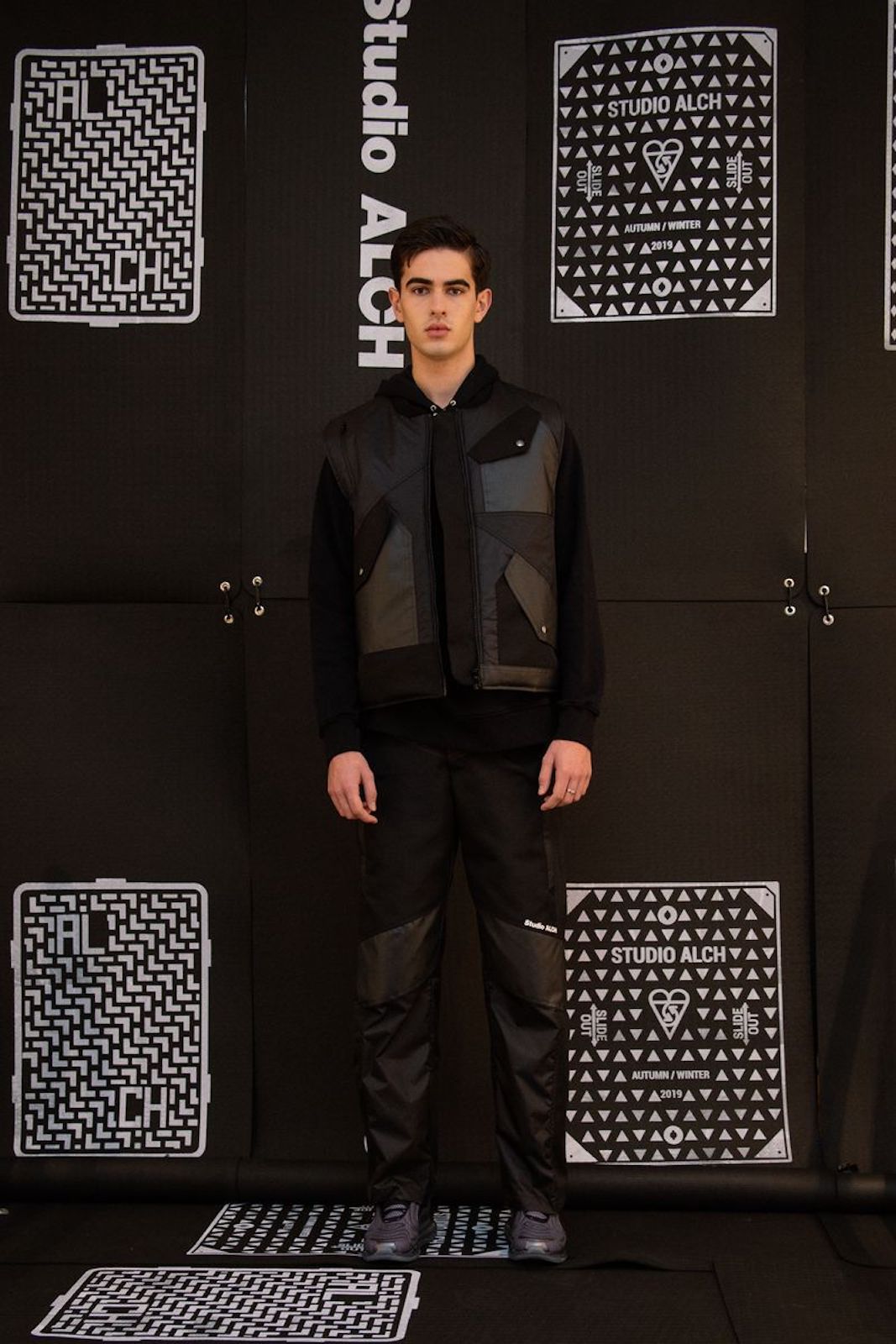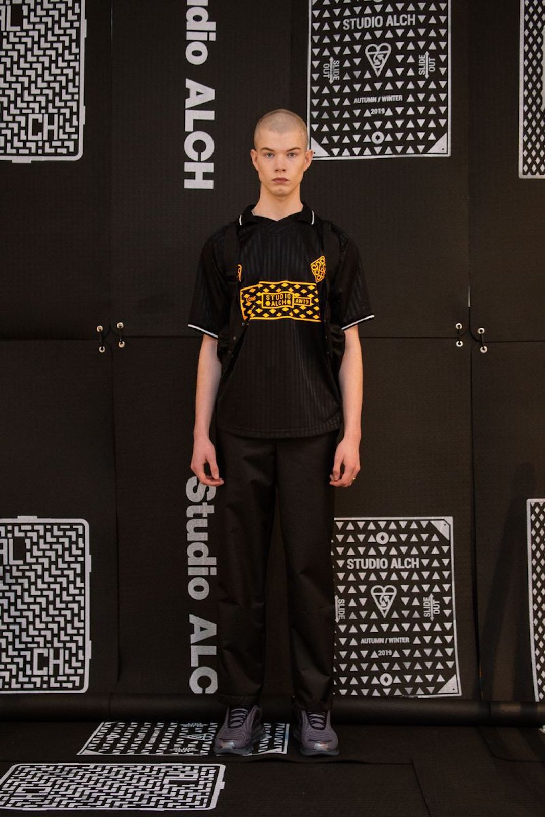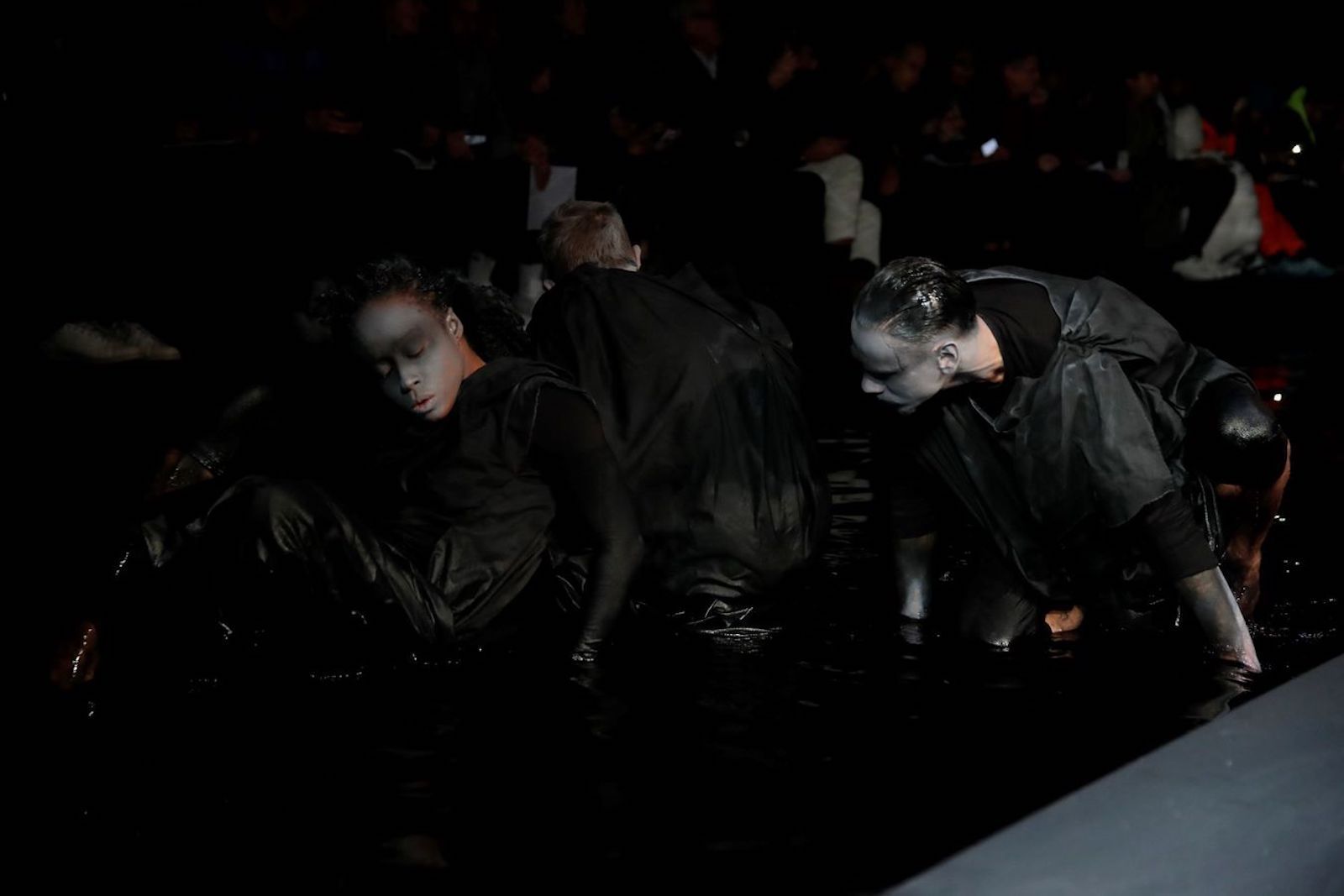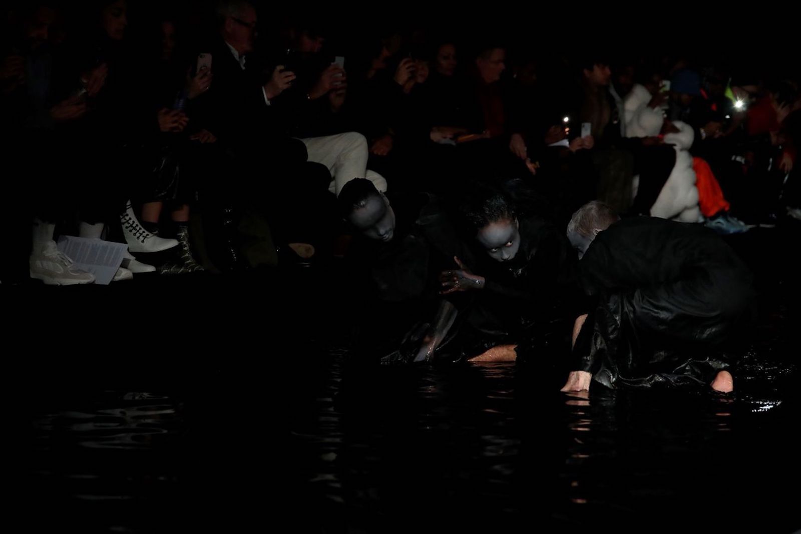 Ai lati della passerella sulla quale ha sfilato la F/W 19 di Samuel Ross è stata allestito uno specchio d'acqua, completamente nell'ombra, dentro al quale tre personaggi vestiti di nero e con il volto colorato di nero si muovevano, creando una sorta di coreografia allo show che tutti stavamo aspettando al varco in questa Fashion Week.