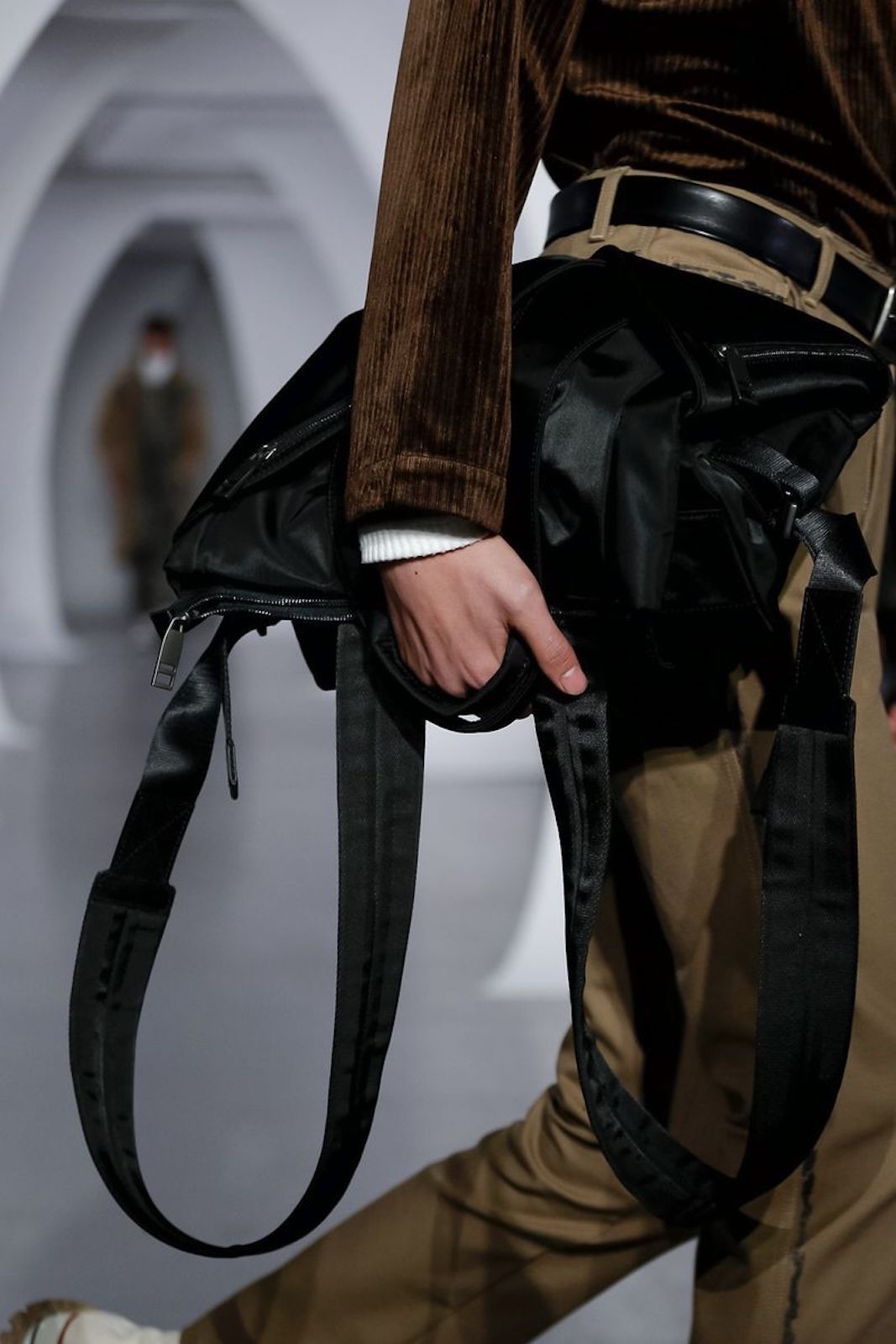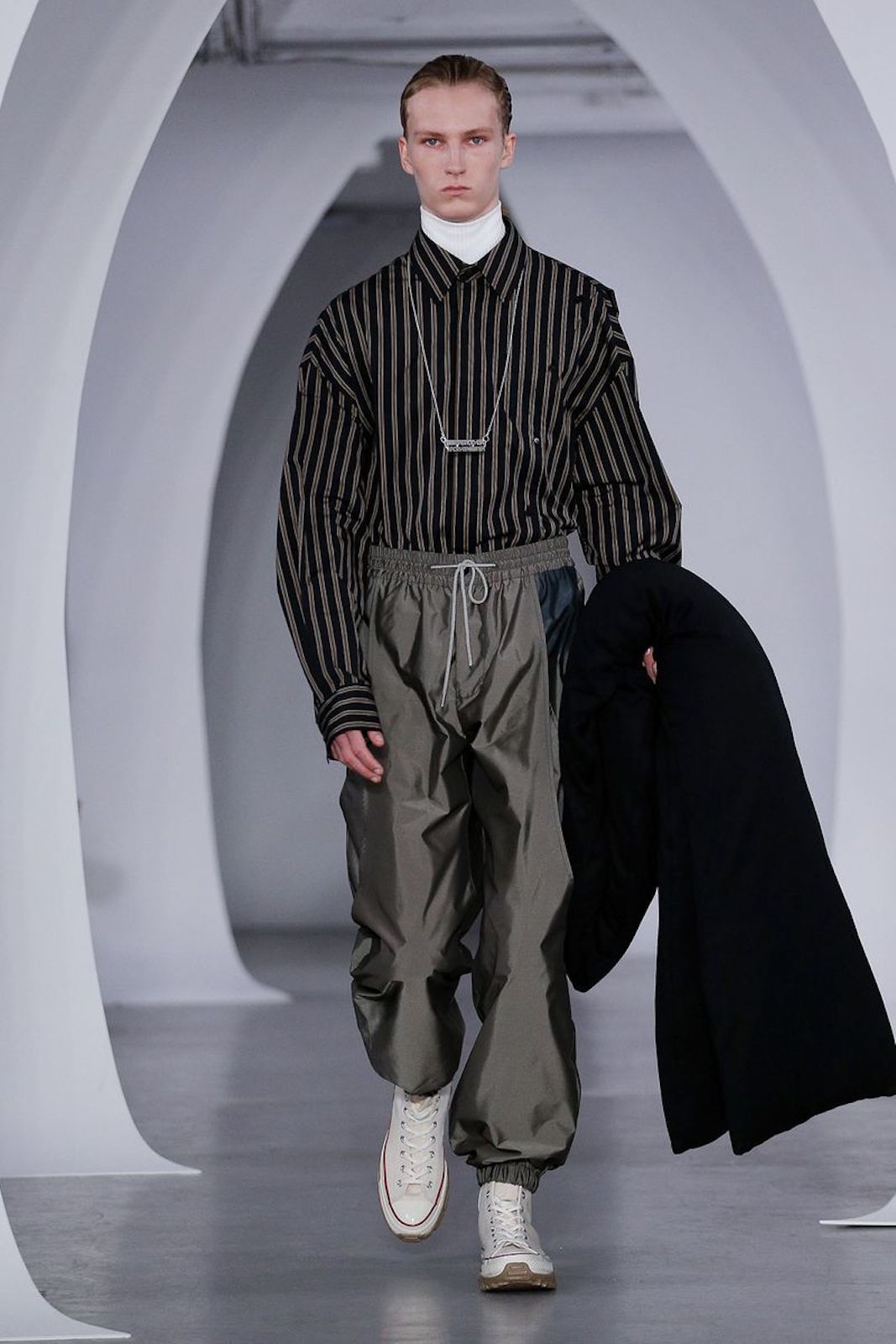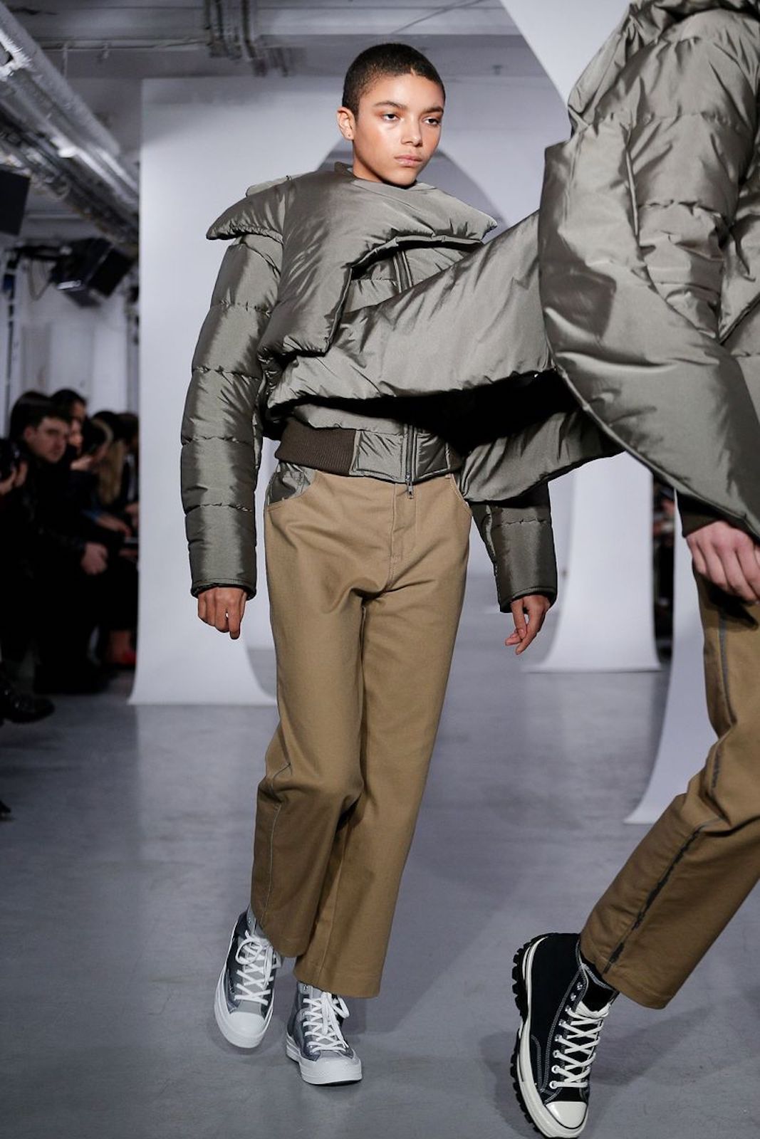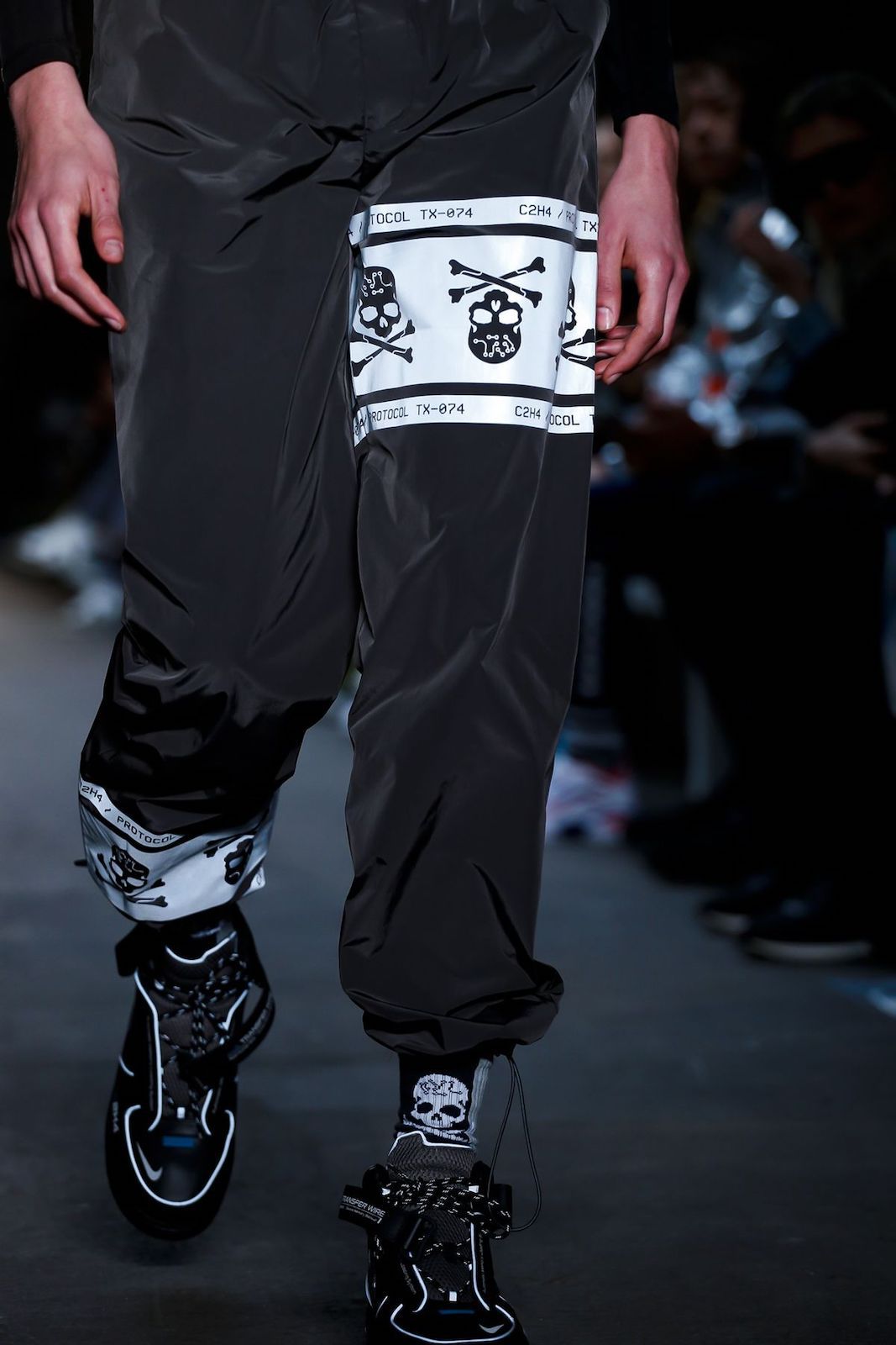Ai lati della passerella sulla quale ha sfilato la F/W 19 di Samuel Ross è stata allestito uno specchio d'acqua, completamente nell'ombra, dentro al quale tre personaggi vestiti di nero e con il volto colorato di nero si muovevano, creando una sorta di coreografia allo show che tutti stavamo aspettando al varco in questa Fashion Week.