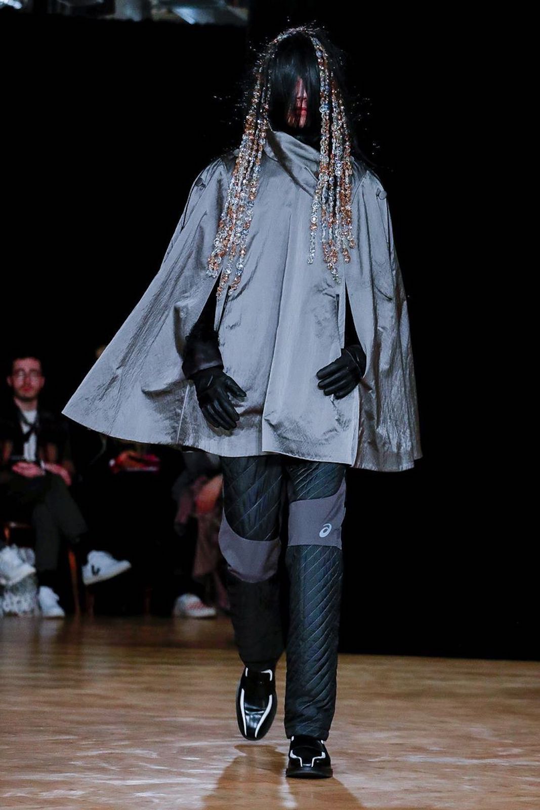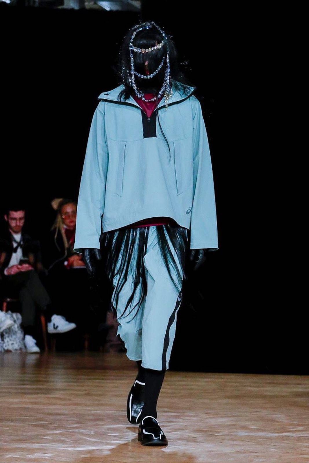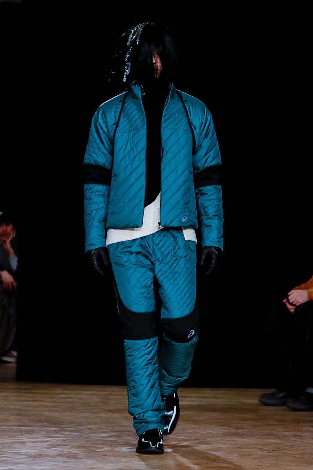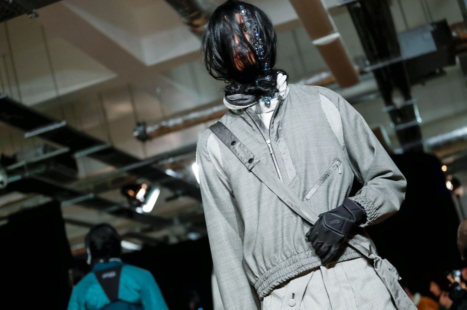 Durante lo show del designer bulgaro, molto atteso alla vigilia, è stata confermata una nuova collezione con Asics, dopo la sneaker rilasciata nei mesi scorsi. La collaborazione con il marchio di sportswear giapponese è sembrata perfettamente coerente con lo stile di Kiko Kostadinov e resa viva da modelli dal volto completamente coperto da capelli.