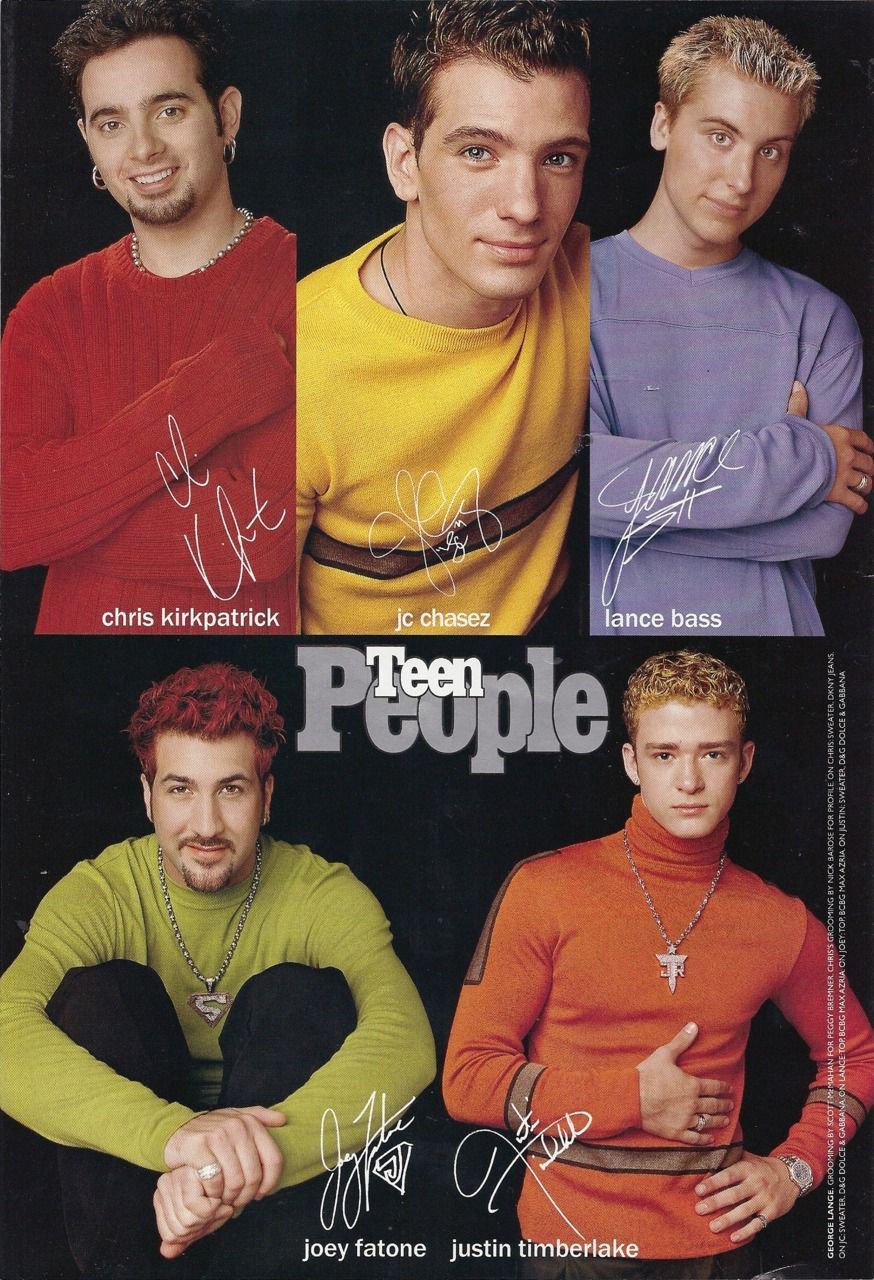 I 'N Sync posano per Teen People con indosso 5 varianti pop color imbarazzanti. Dolcevita aderente arancio bocciato.