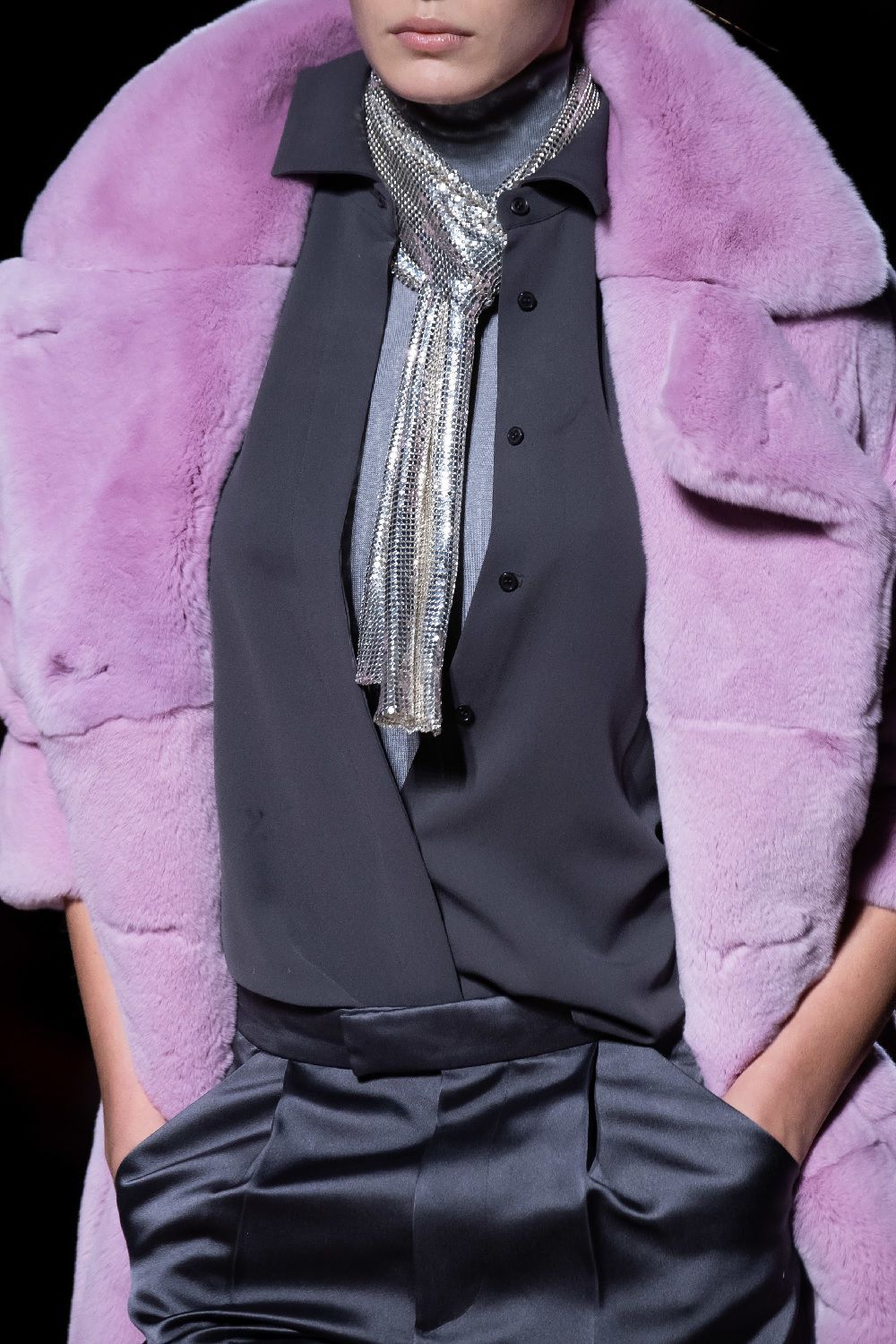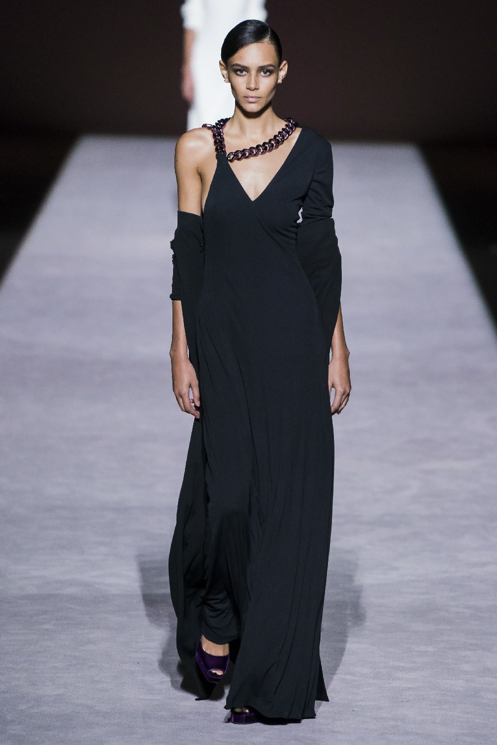 La preoccupazione per tutto quello che sta succedendo nel mondo ha spinto Tom Ford a realizzare una collezione sartoriale, misurata, basata sui codici dell’eleganza degli anni ’90, gli stesso che hanno reso famoso il designer quando lavorava da Gucci. È un guardaroba fatto di ampi e avvolgenti coat, long dress dalle profonde scollature decorate da catene, ma, soprattutto, da raffinati tailleur pantalone di ispirazione maschile, resi sensuali dalle camicie sbottonate e dal raso e il velluto. Look monocromatici resi ancora più speciali da una palette che alterna rosso, viola, nero, toni boschivi, sfumature di grigio e azzurro pastello. Quando si dice la classe non è acqua.