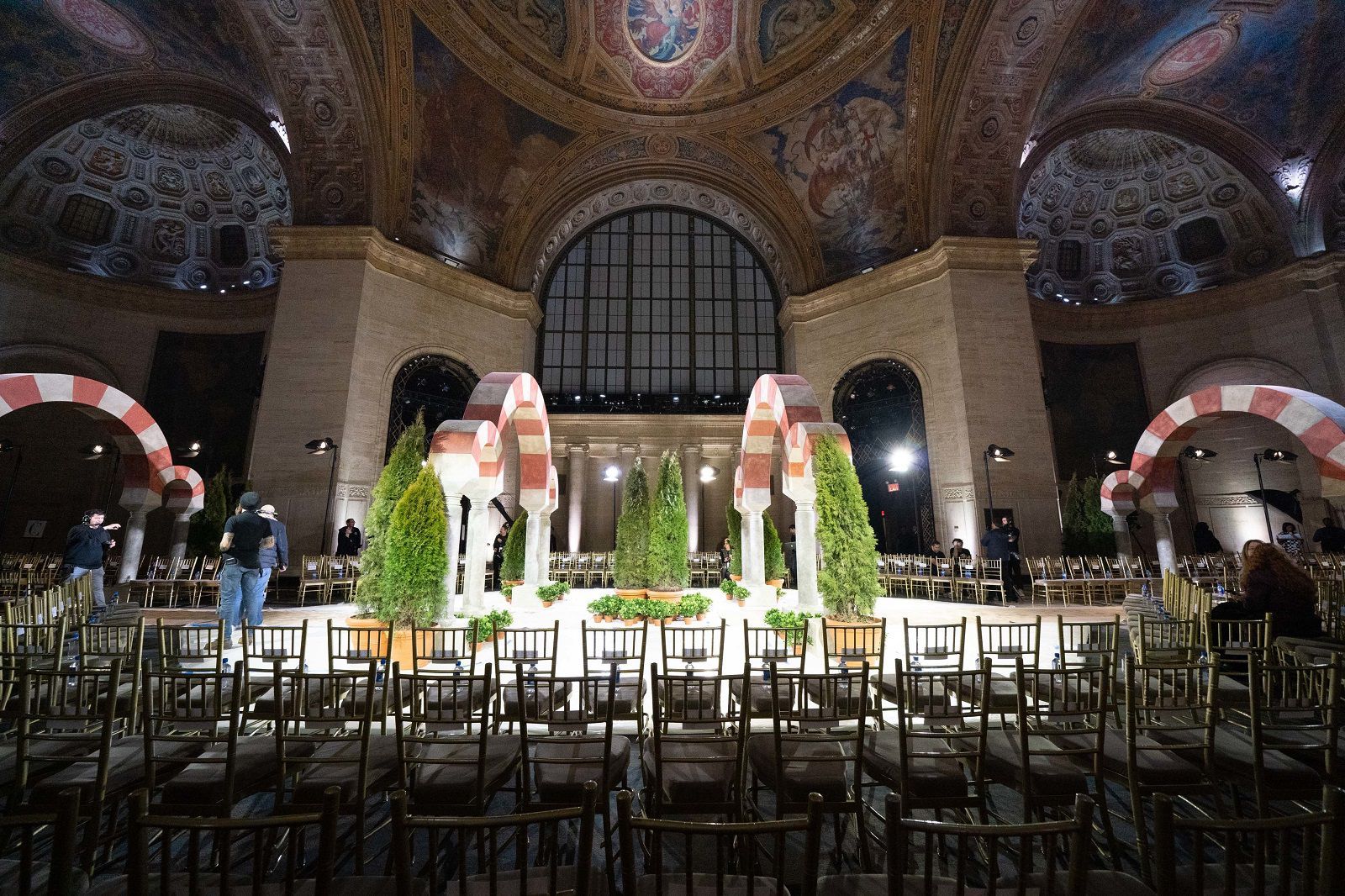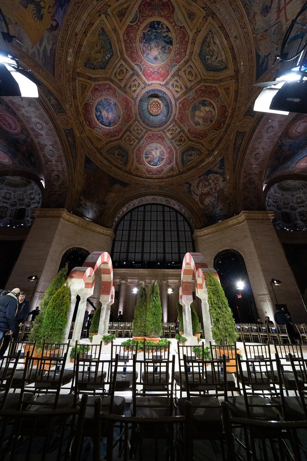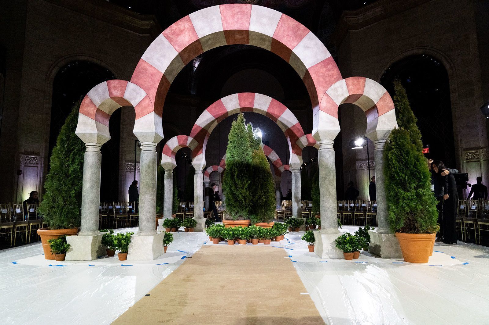 All'interno di un giardino ricco di piante, fiori e colori, sfilano le modelle lasciandosi alle spalle una incantevole chiesa, imponente e romantica, proprio come la collezione FW19.
