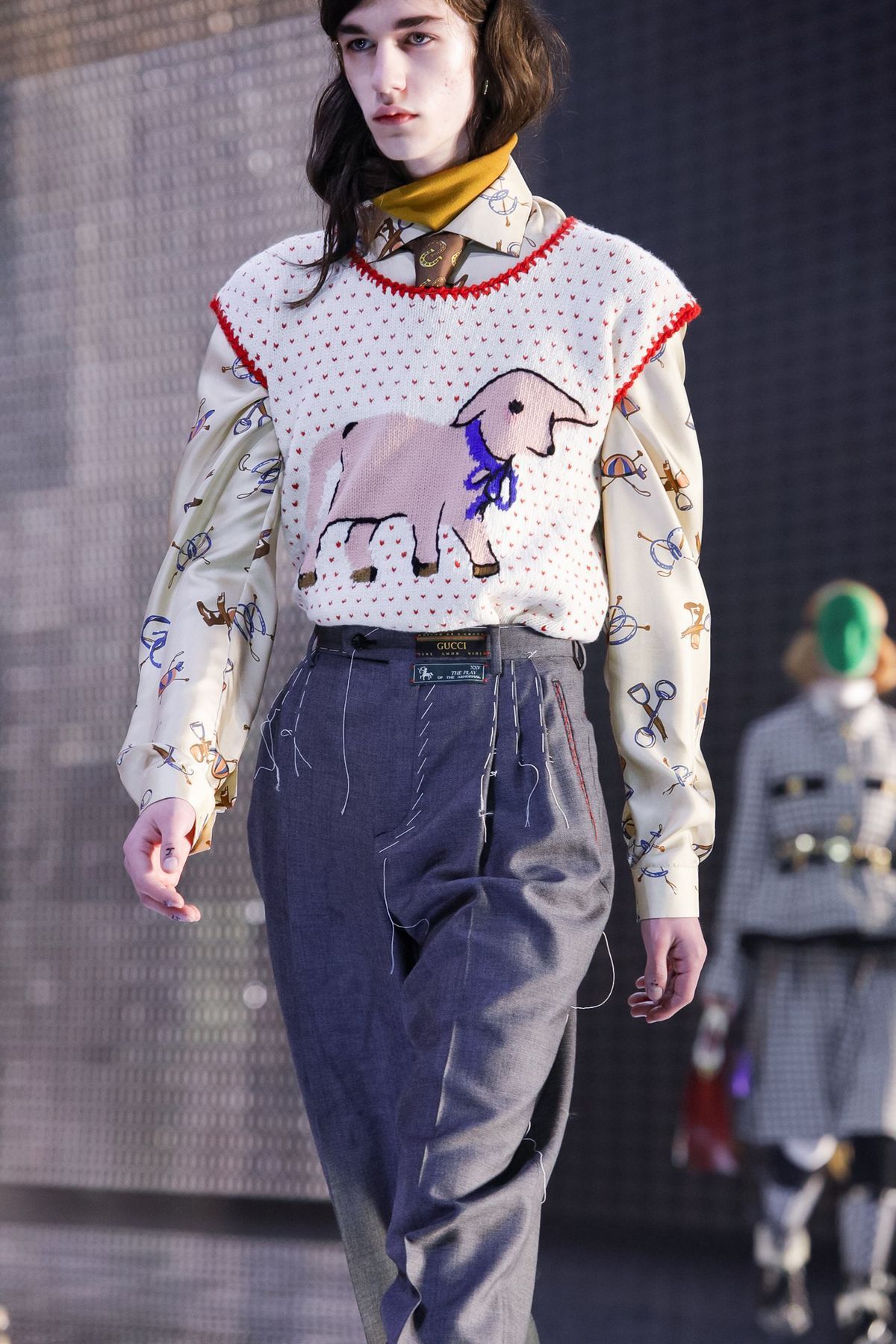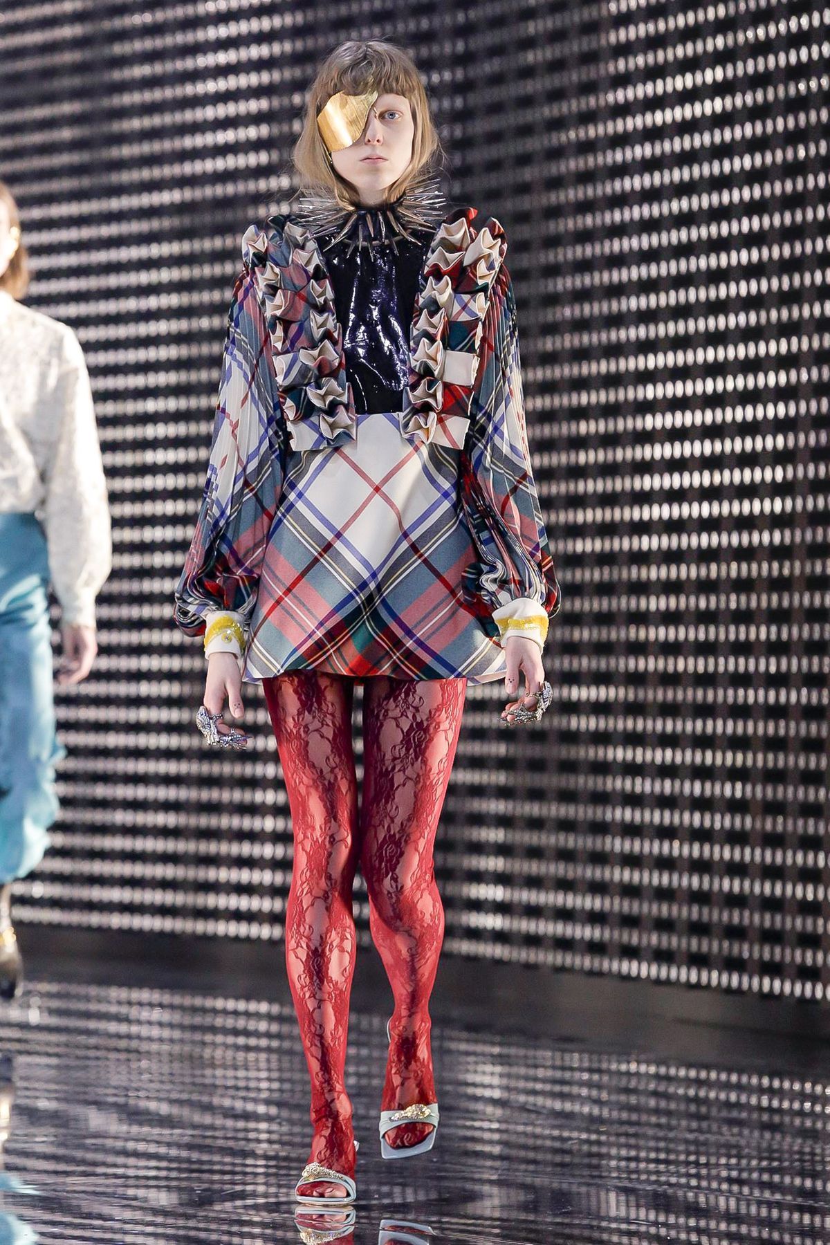 I look si susseguono rapidamente uno dopo l'altro, fin da subito Alessandro Michele decide di far vedere che dietro tutto questo c'è lui, il suo touch chic-nerd, la sua passione per l'esagerazione, lui. Cravatte e collant ricamate per le donne, borchie appuntite e doppio petto per lui. Gucci mescola le sue mille personalità, mettendole tutte in scena: ci sono look sofisticati e romantici fatti di voilant e merletti ma anche provocatori e strong fatti di leather jackets e gioielli gold. Impossibile non notare il profondo lavoro che c'è dietro ogni singolo look, materiali diversi mescolati grazie a un profondo lavoro di styling. Trame floreali che incontrano il tartan, look oversize anni '70 alternati da rock garments. Gucci mette in scena Gucci, confermando la sua filosofia anticonformista ma deludendo un po' le aspettative del pubblico italiano che attendeva, per il suo grande ritorno a Milano, una rivoluzione dopo la trilogia francese.