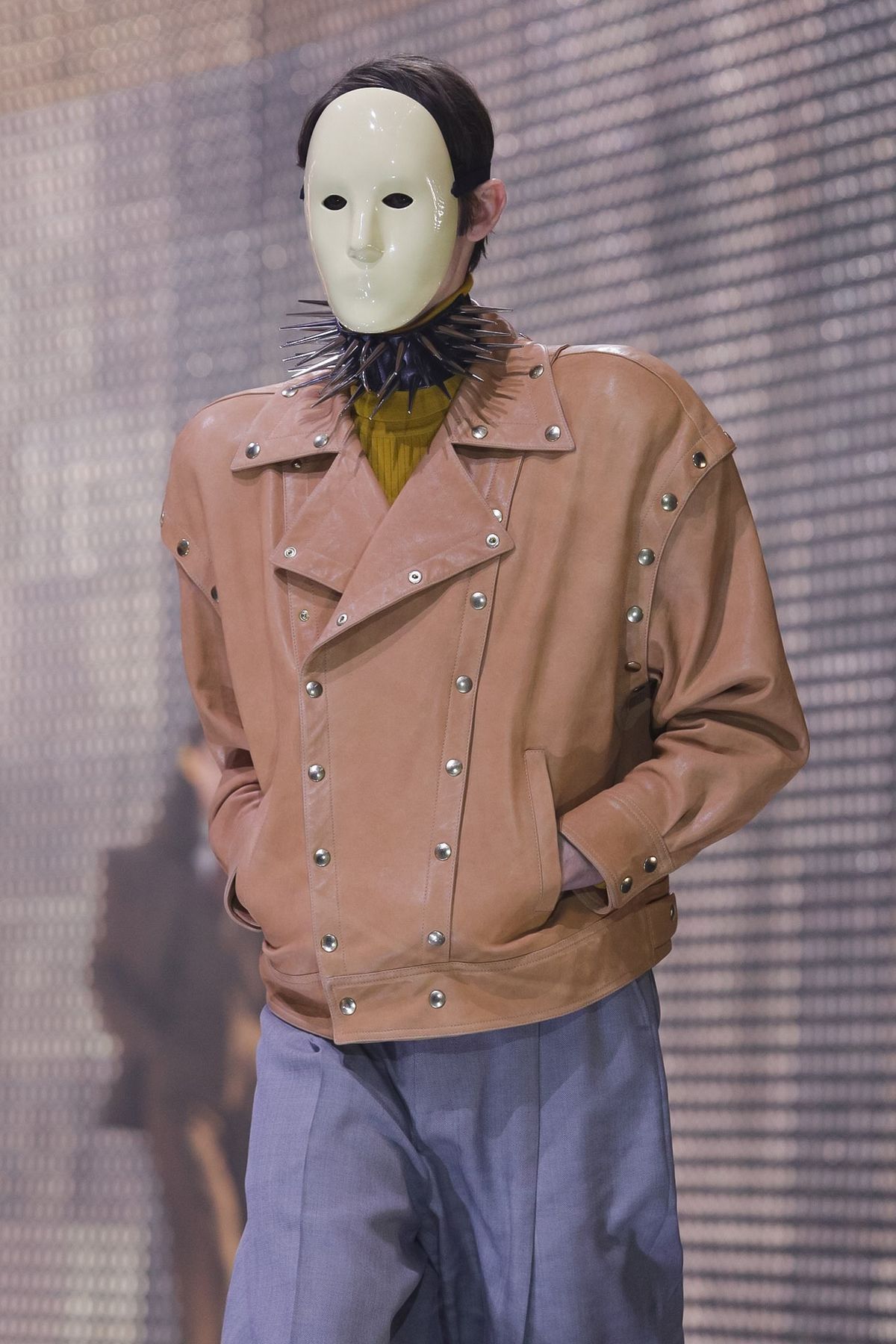 Focus della sfilata, però, sembra esser stata proprio la maschera - tematica anticipata dallo stesso invito - indossata dai modelli in differenti varianti, colori e forme. Volti coperti da questo accessorio che sembra voler incrementare l'atmosfera di mistero: identità celate che sembrano sussurrare una sottile protesta, un messaggio anticonvenzionale in puro stile Michele. In questo caso però la maschera non è sinonimo di alienazione, di falsità, ma diventa elemento che consente all'uomo di essere chi desidera essere veramente, gli permette di interpretare un ruolo come meglio crede e svelare di sé quella parte che egli vuole comunicare, preservando invece quanto desidera resti nascosto.