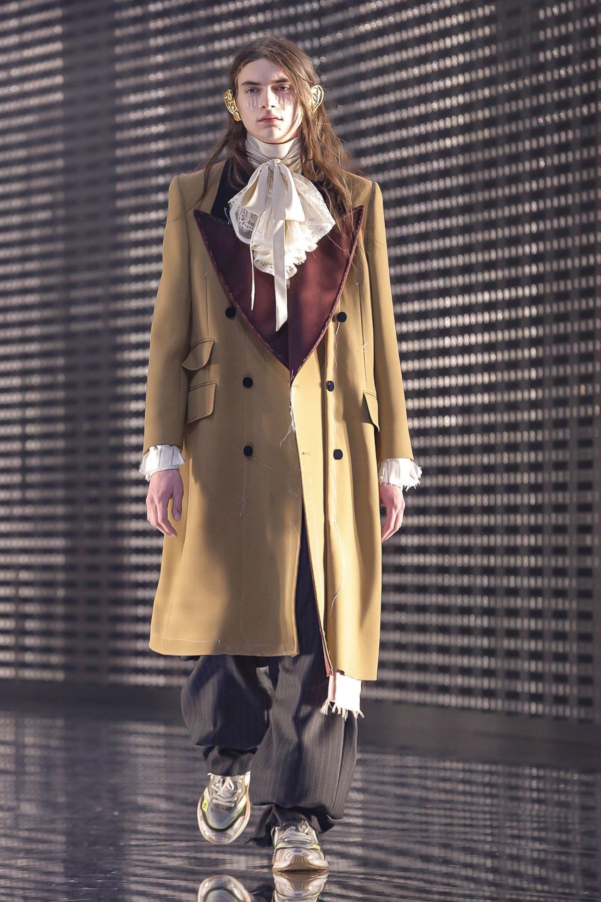 La generale atmosfera di inquietudine tipica di Michele sembra essere brevemente interrotta solo dall'arrivo in passerella di piccoli riferimenti all'abbigliamento sportivo: parastinchi gold, ginocchiere indossate su collant ricamate e un paio di sneaker intraviste fra le mani di un modello.