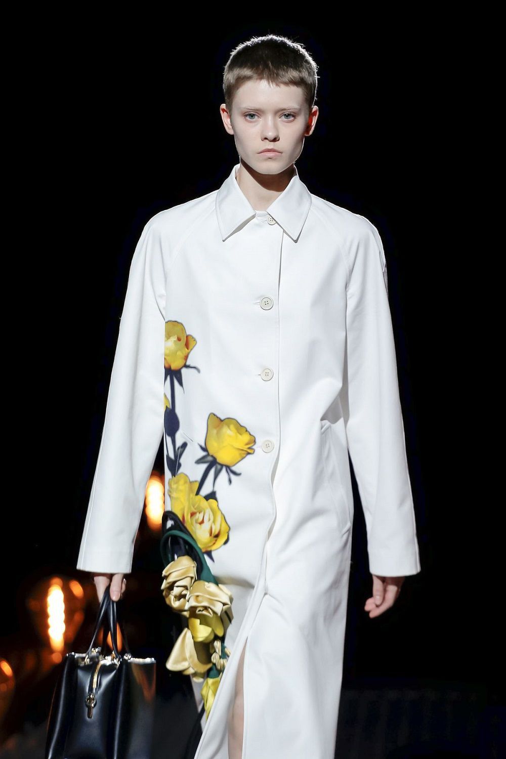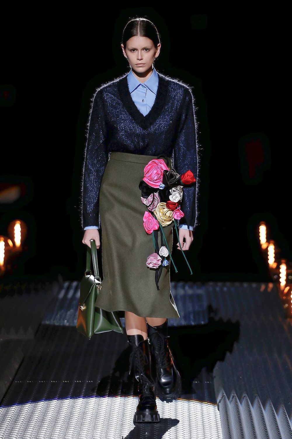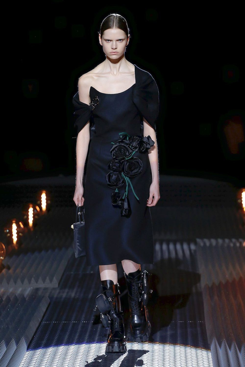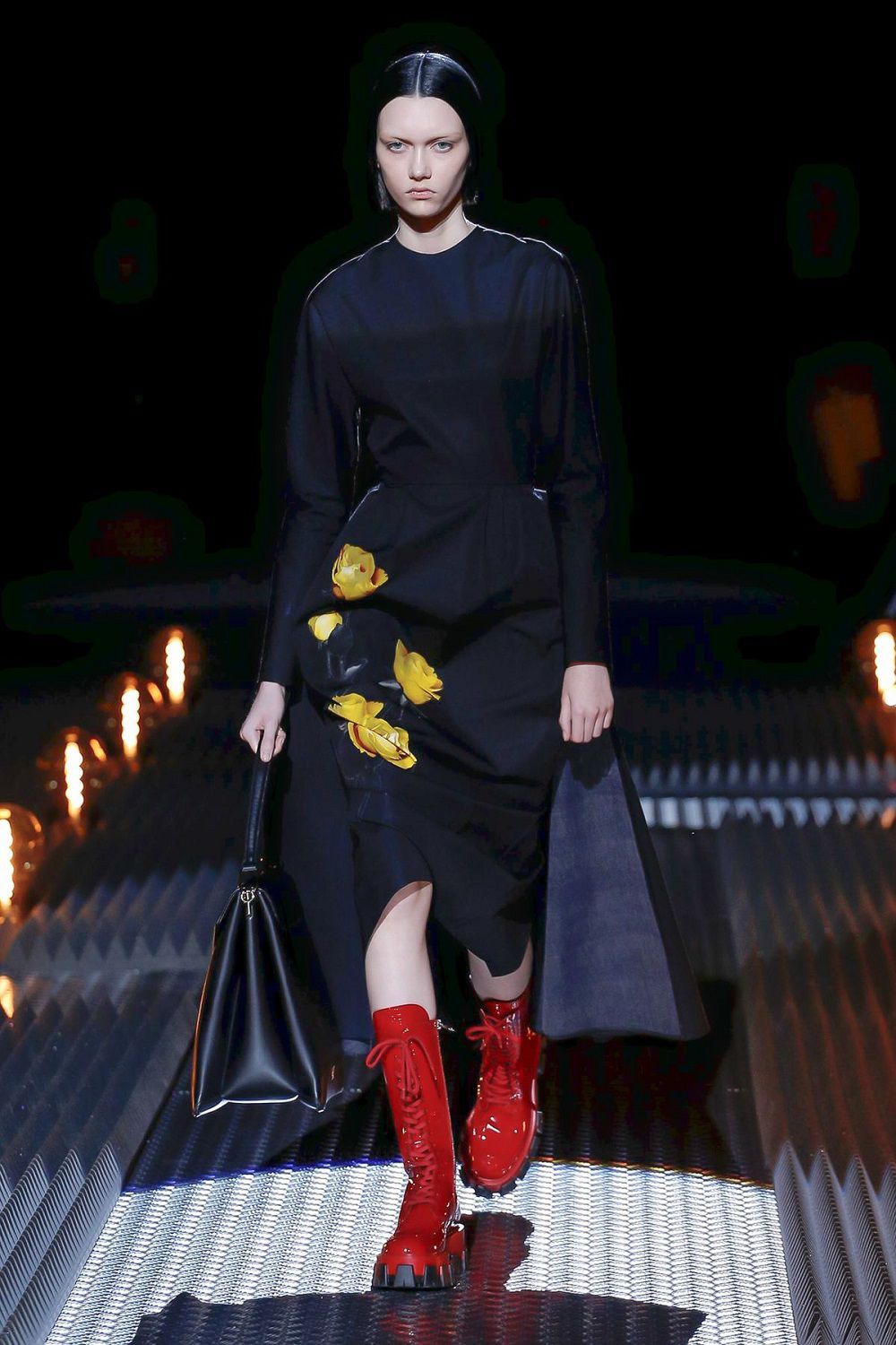 La donna Prada di questa stagione è ricca di contraddizioni. Si parte con i look neri più austeri, lunghi cappotti ingentiliti in vita da fibbie argentate ma abbinati ad anfibi dall'animo punk decorati da mini bag. Si passa poi al tema dei fiori, rose ricamate in rilievo su abiti midi dalla silhouette tipica di Prada. Il pizzo è portato con giacche dal taglio militare, una rediviva Cara Delevigne fa il suo ritorno in passerella con un abito con stampa Frankenstein portato sopra ad un top in pizzo nero.