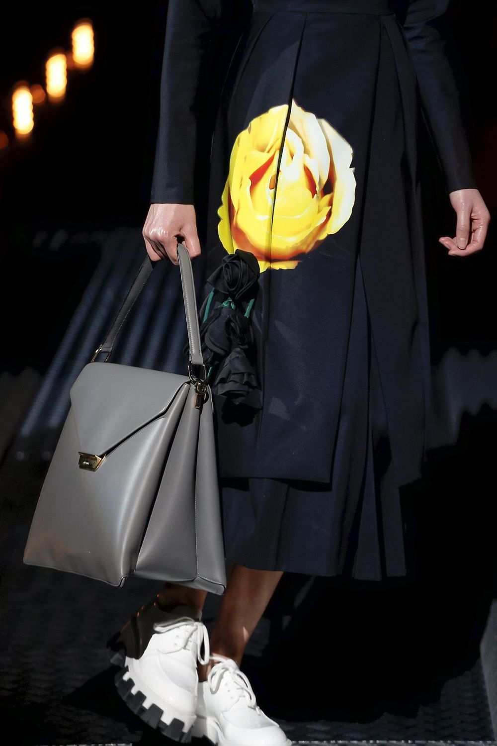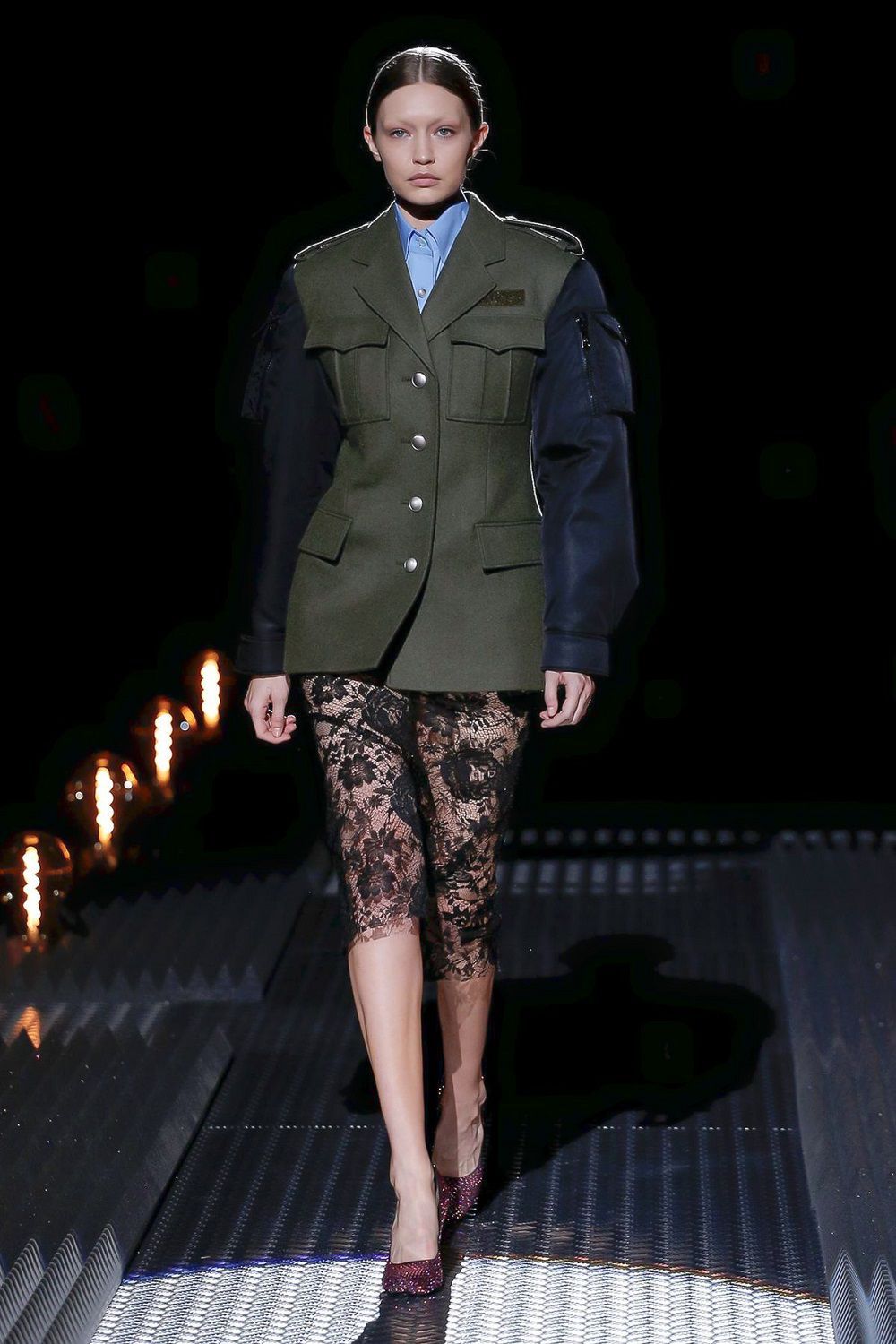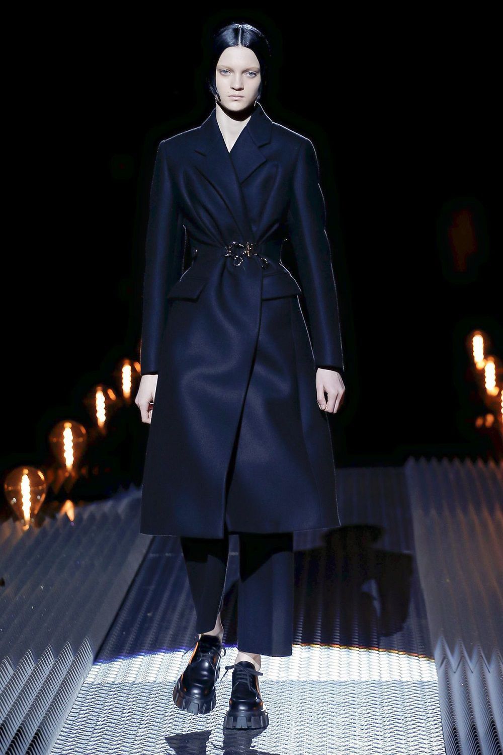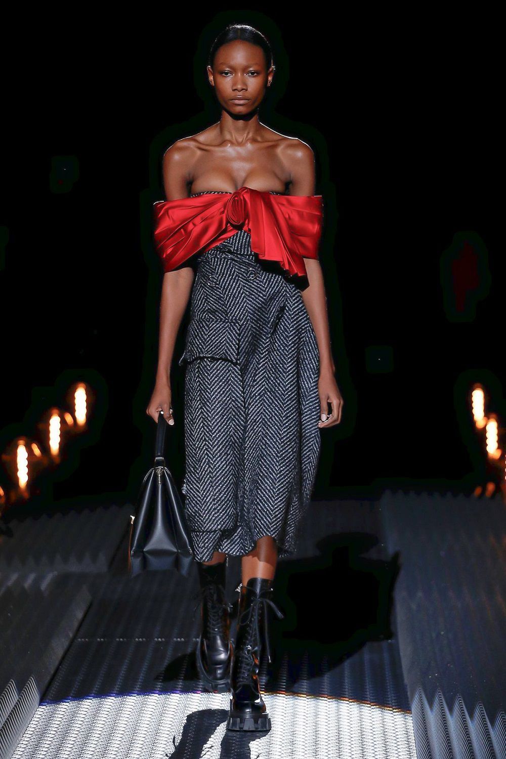La donna Prada di questa stagione è ricca di contraddizioni. Si parte con i look neri più austeri, lunghi cappotti ingentiliti in vita da fibbie argentate ma abbinati ad anfibi dall'animo punk decorati da mini bag. Si passa poi al tema dei fiori, rose ricamate in rilievo su abiti midi dalla silhouette tipica di Prada. Il pizzo è portato con giacche dal taglio militare, una rediviva Cara Delevigne fa il suo ritorno in passerella con un abito con stampa Frankenstein portato sopra ad un top in pizzo nero.