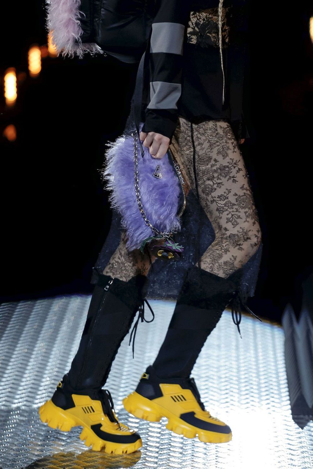 Gli accessori variano dai boot più audaci, alle sneaker, fino ai sandali con tacco glitterati, una silhouette molto simile ad una scarpa di Miu Miu di qualche anno fa. Le borse sono classiche, in pregiata pelle o in nylon, con il logo tradizionale della casa di moda milanese.
