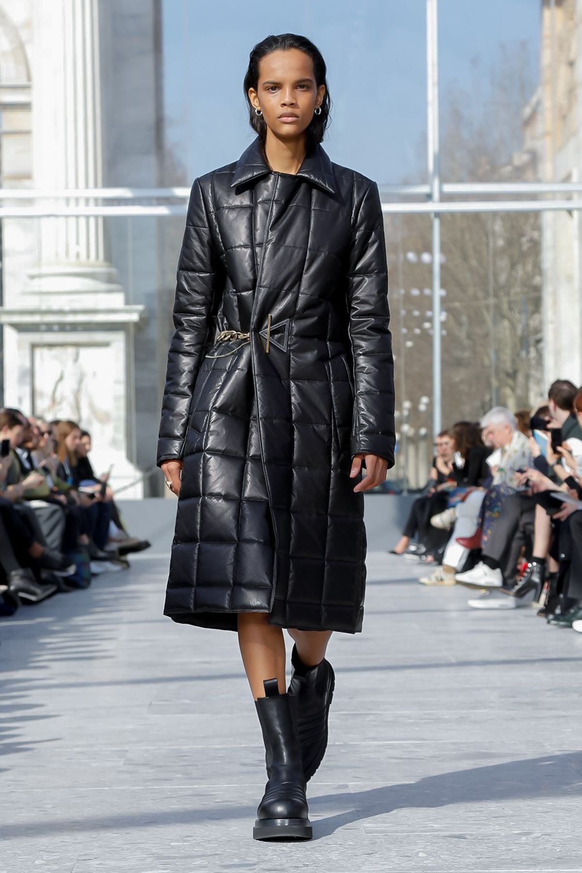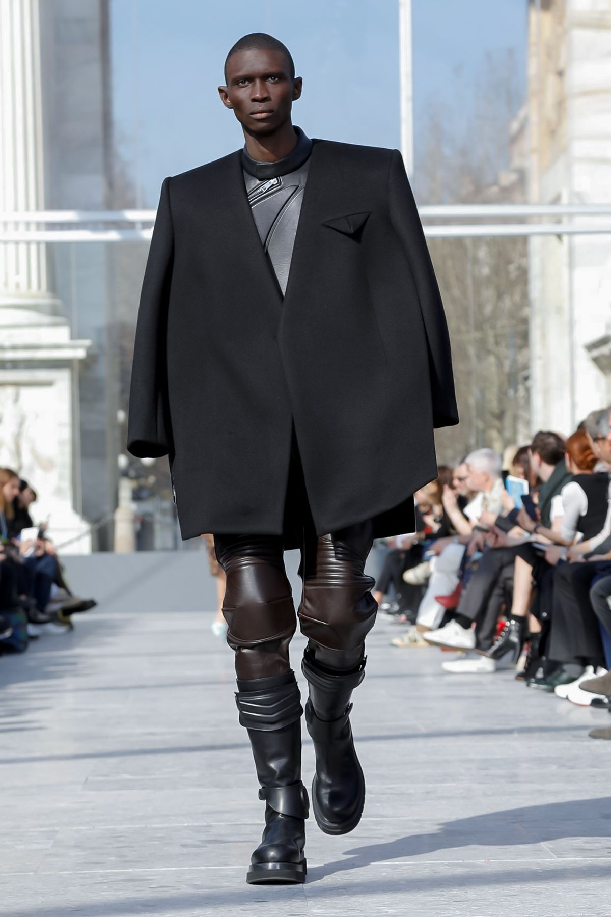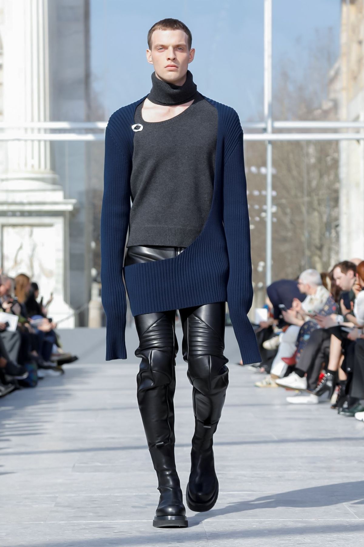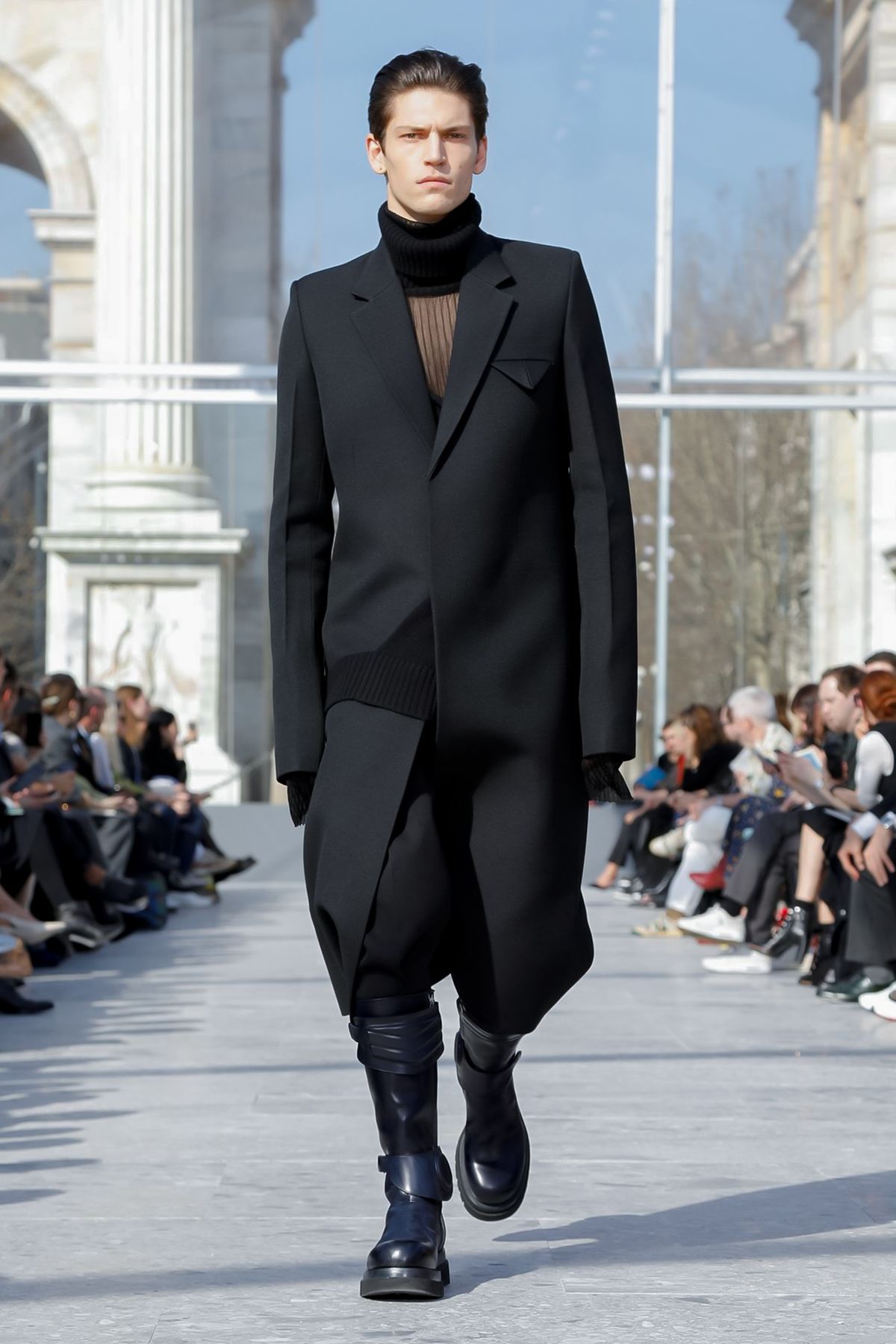 Forse meno potente la proposta per l'uomo, costituita per lo più da cappotti doppiopetto rigorosi, maglioni a collo alto, dolcevita trasparenti, pantaloni biker in pelle e raincoat in pelle spalmata.