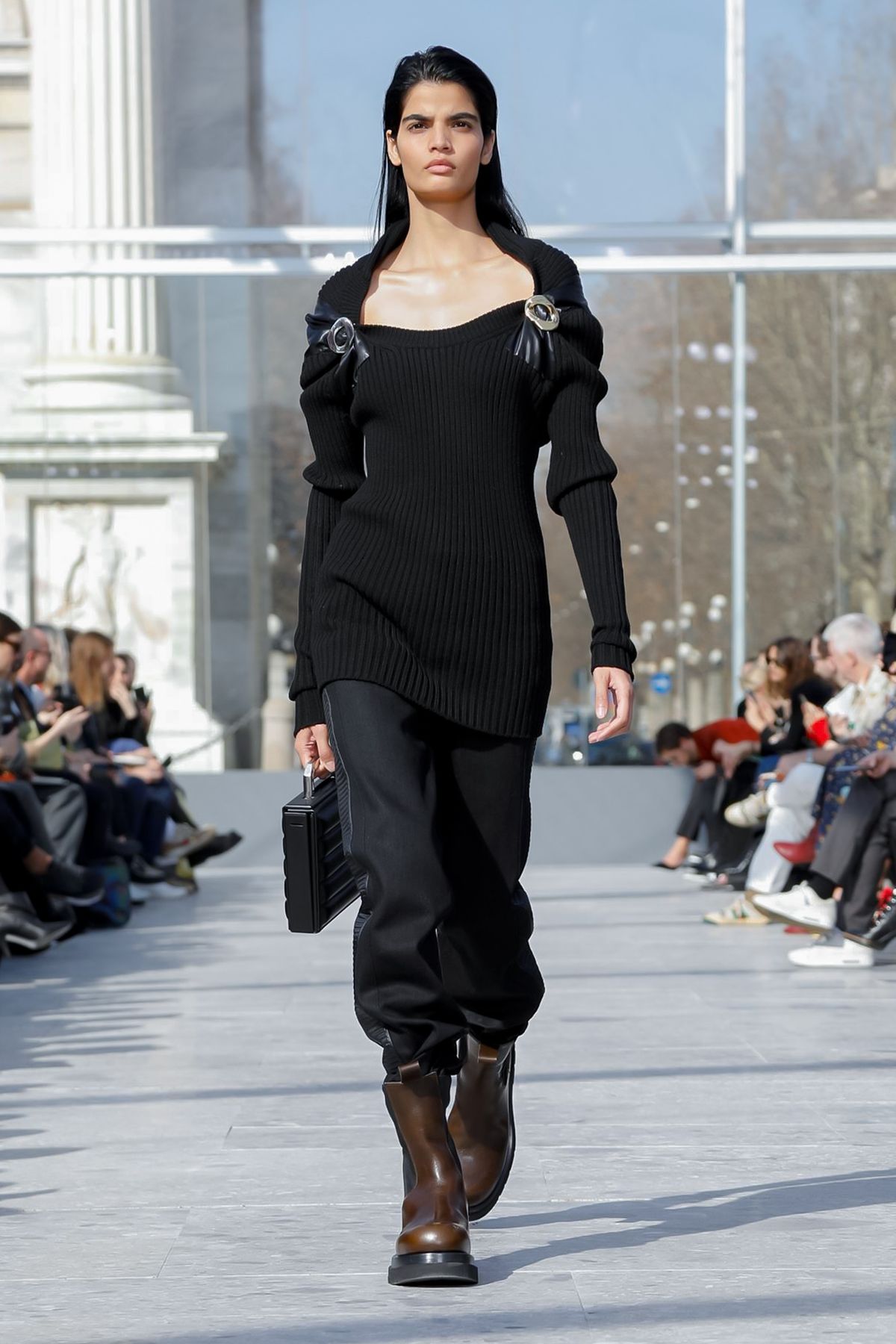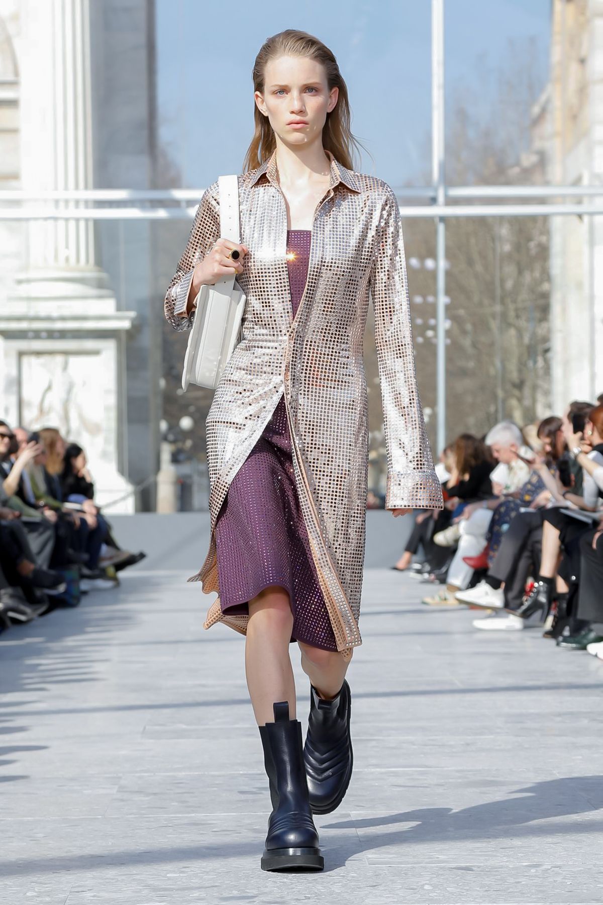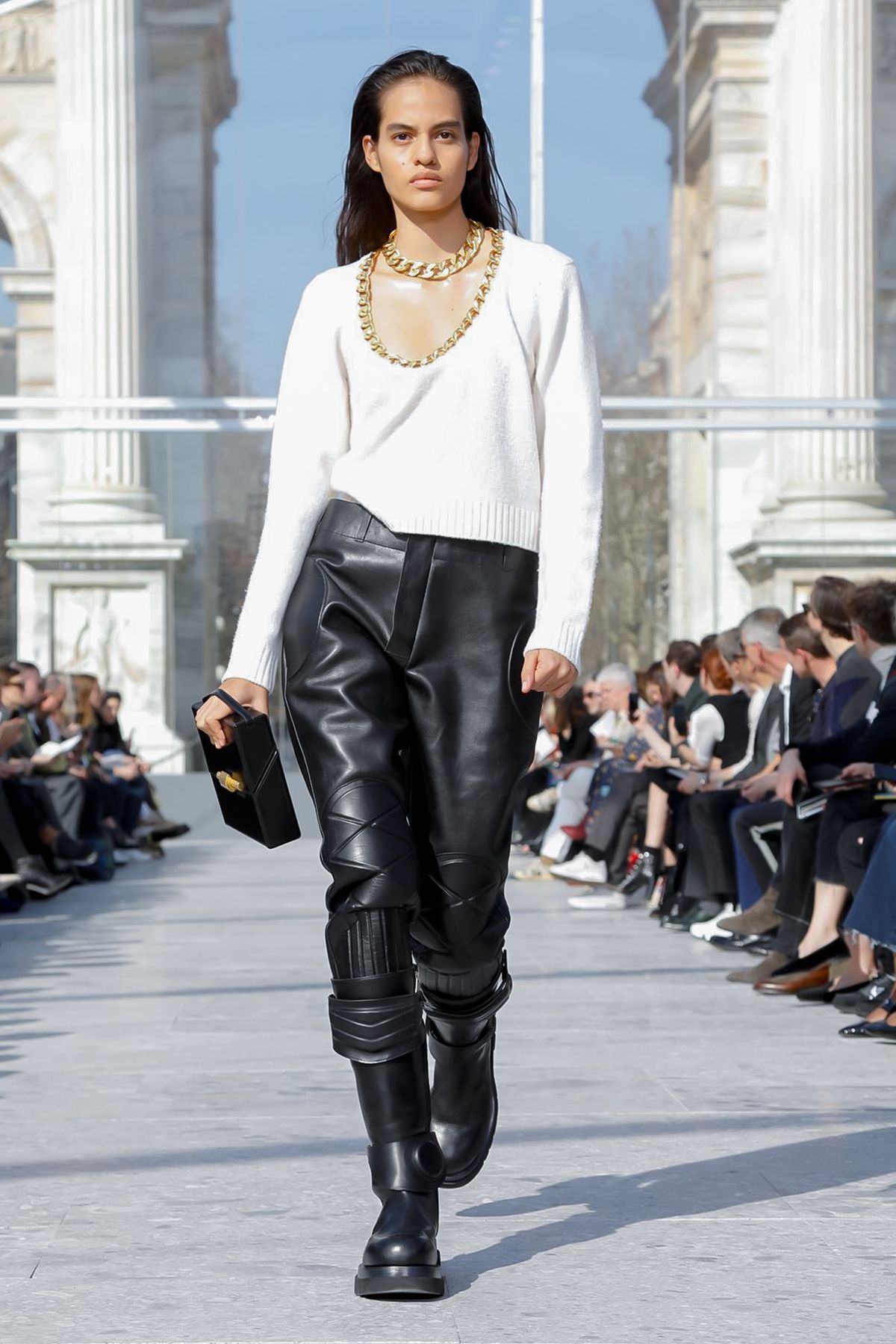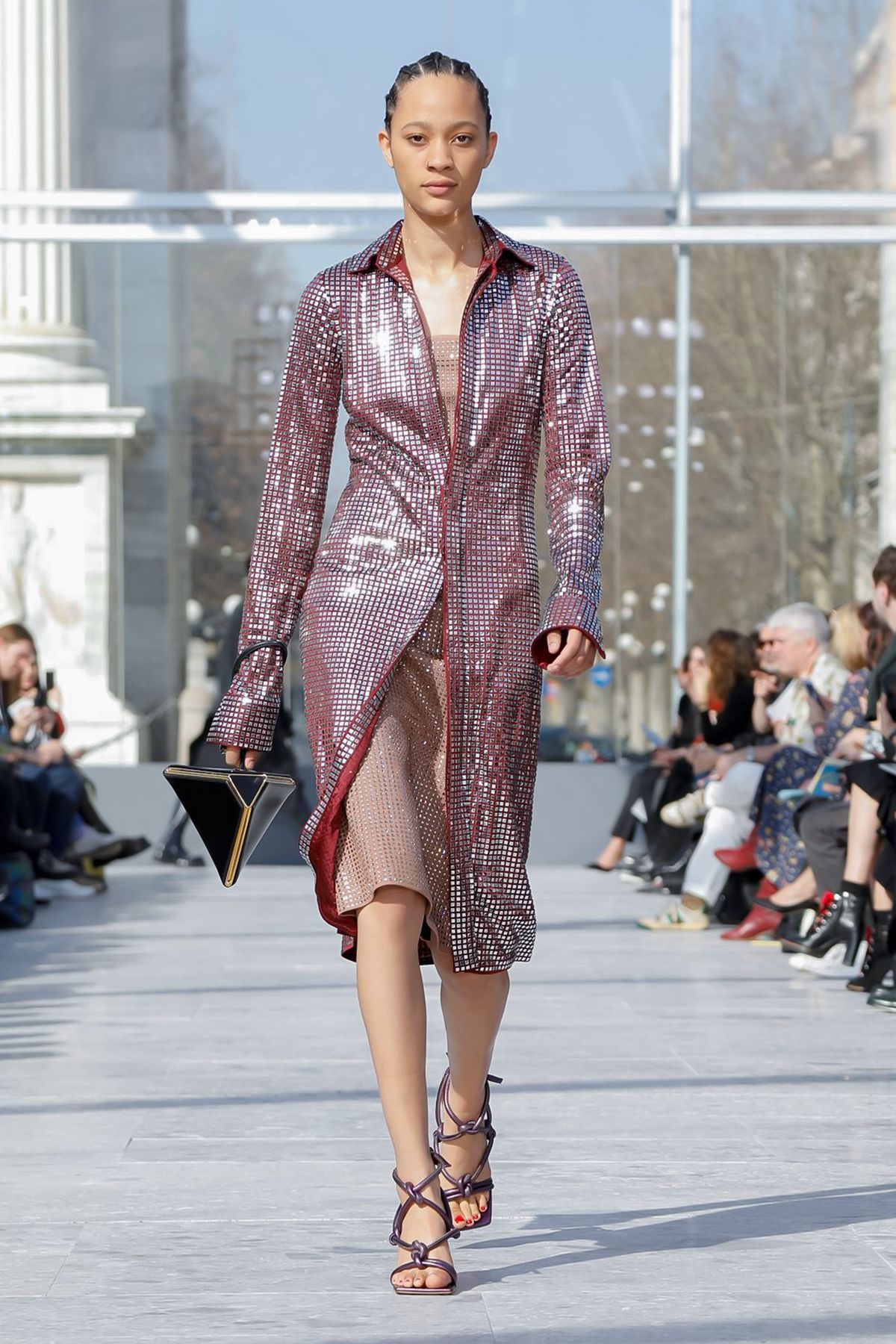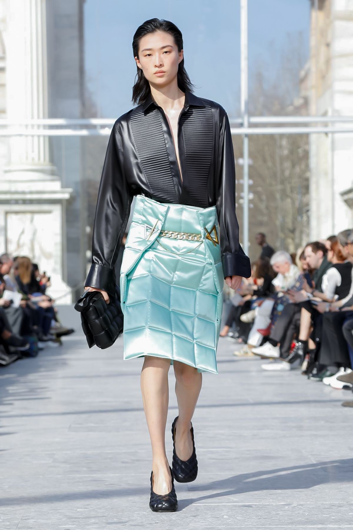 Lo schivo designer, però, è riuscito a non farsi ingabbiare in definizioni e stereotipi, e, compito ancora più arduo, è riuscito a dialogare con la ricca storia di Bottega Veneta in maniera inedita, fresca e contemporanea. Fin dalla prima uscita in passerella a dominare è la pelle, materiale fondamentale per l'estetica della maison italiana. Vestiti midi con scollo arrotondato, pantaloni larghi, veri e propri completi da biker, camicie che sembrano di seta: la pelle diventa un tessuto duttile e versatile, sinonimo di un'eleganza sofisticata ed audace. La pelle intrecciata e il motivo a nodo, due altri grandi leitmotiv di Bottega Veneta, sono riproposti nelle gonne sotto al ginocchio, negli spolverini, nei blazer stretti in vita dalle spalle ampissime, nelle décolleté con kitten heel in colori diversi. La gamma cromatica varia dal nero, dominante, al bianco più puro, fino al rosso, al blu, spesso con dettagli dorati. I due spolverini ricoperti di paillette nei toni del rosa e del viola aggiungono un tocco propriamente fashion ad una collezione composta e coerente.