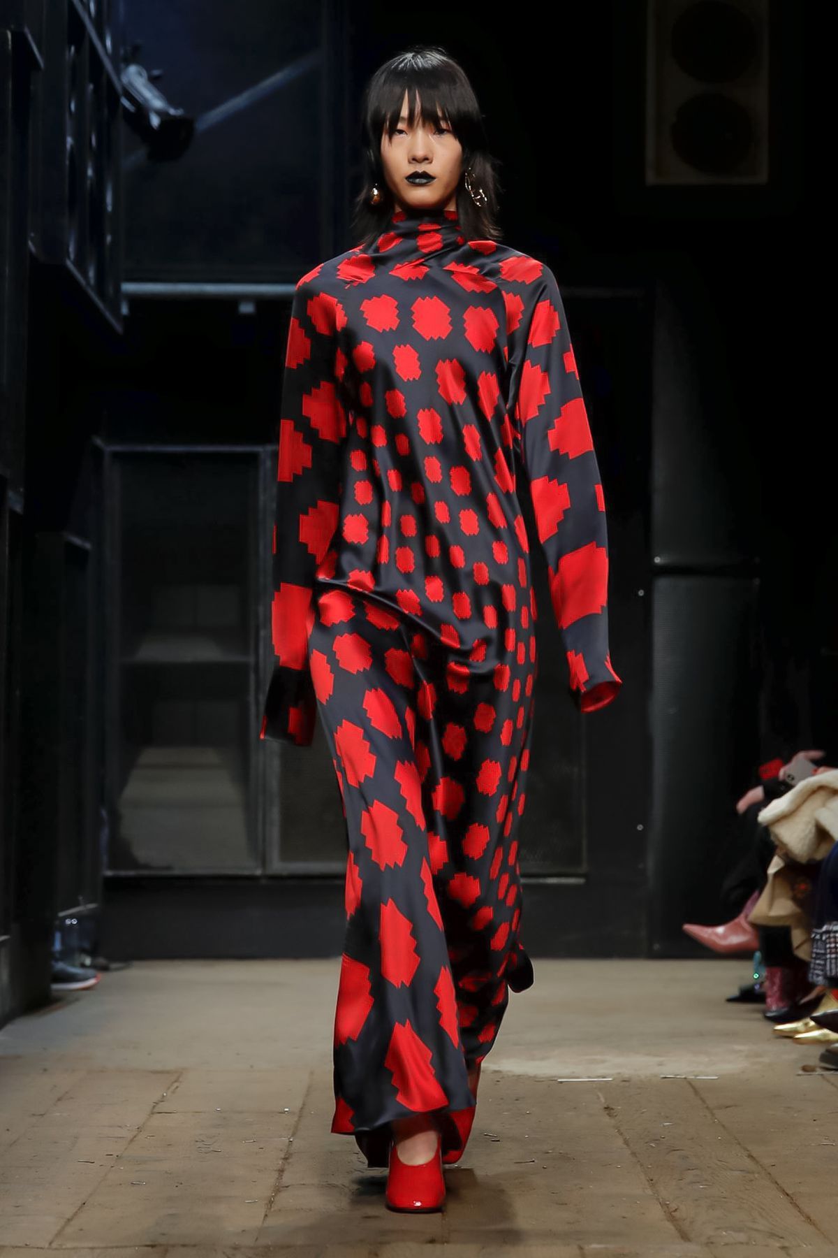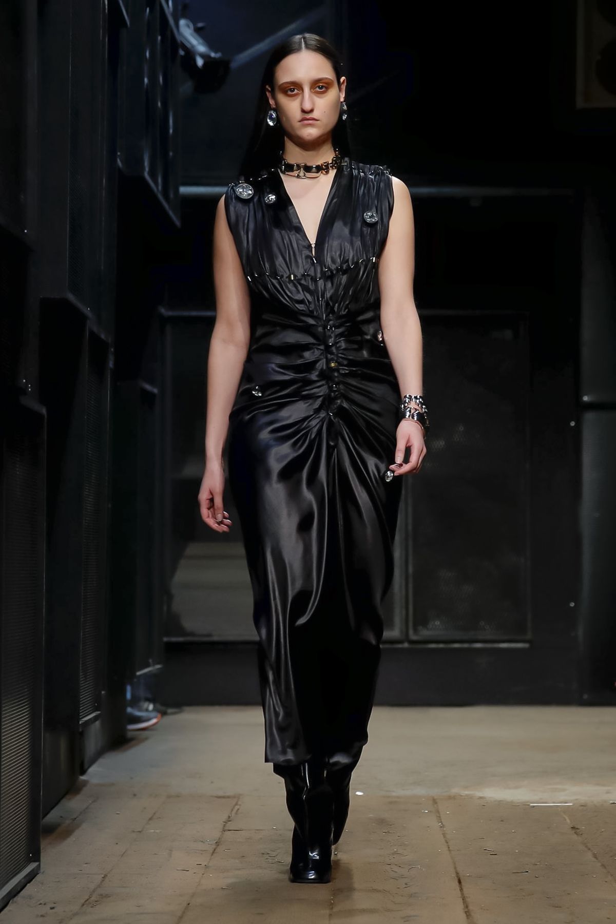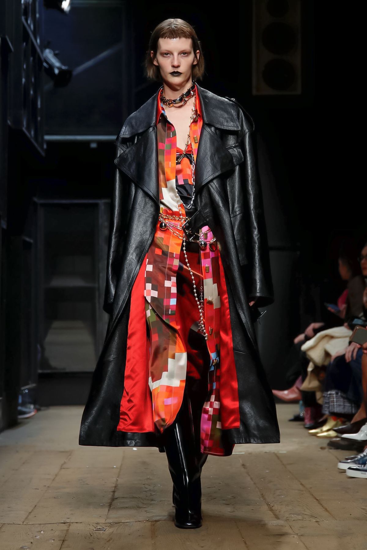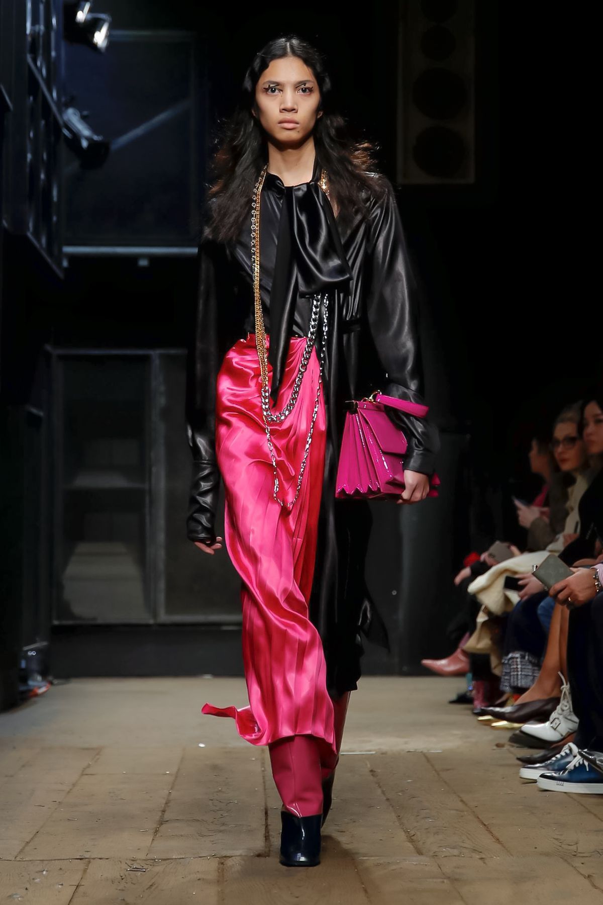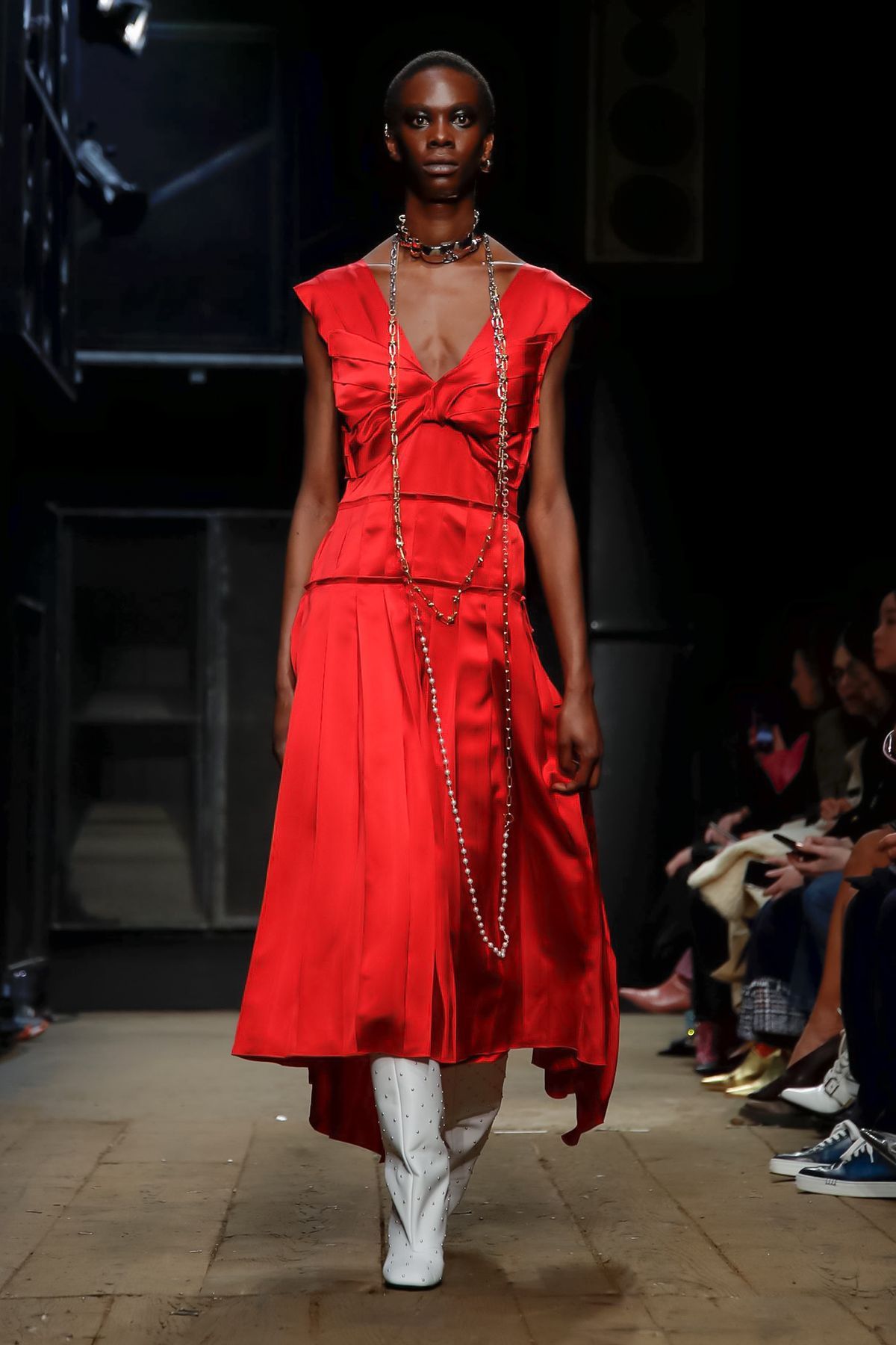 Gli ospiti sono stati accolti nello stesso spazio in cui lo show maschile è stato allestito solo poche settimane fa, in una stanza piena di altoparlanti come pareti e luci scure multicolore. La collezione è stata vista come un divertente gioco erotico sul linguaggio del corpo e sulla sensualità. Racconta una storia di preliminari ed erotismo attraverso tagli e pieghe, abiti e gonne formati da due inserti diversi, e abiti tagliati intorno al collo. Le catene apparivano come collane composte avvolte attorno al collo e attraverso i corpi. Stivali e stivaletti con alti plateau hanno contribuito alla sensualità generale della collezione. Questa collezione era semplicemente un'altra dimostrazione della destrezza e della fluida immaginazione di Risso, che a tratti sta cercando di reimmaginare il marchio da zero. Una palette di rossi, neri, arancioni, grigi, tra gli altri, sono stati immersi nella collezione sulle giacche da uomo mezzo taglio, gonne a pieghe e sciarpe e abiti con gli strass. La collezione era in qualche modo una celebrazione dei diritti della libertà nella scelta di essere sessuali come si può essere senza giudizio o presunzioni. Ogni pezzo è stato realizzato con attenzione ai dettagli del corpo senza essere troppo sgargianti o volgari.