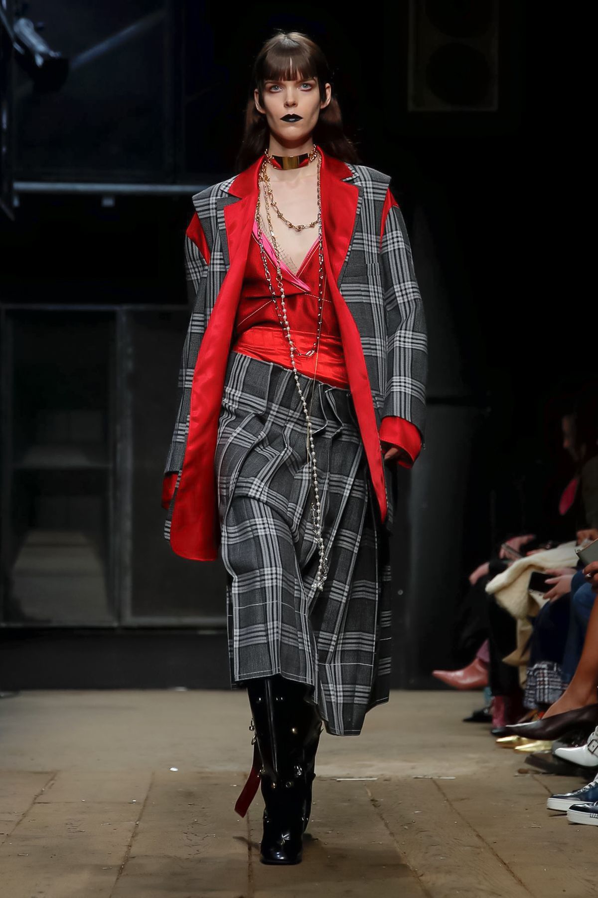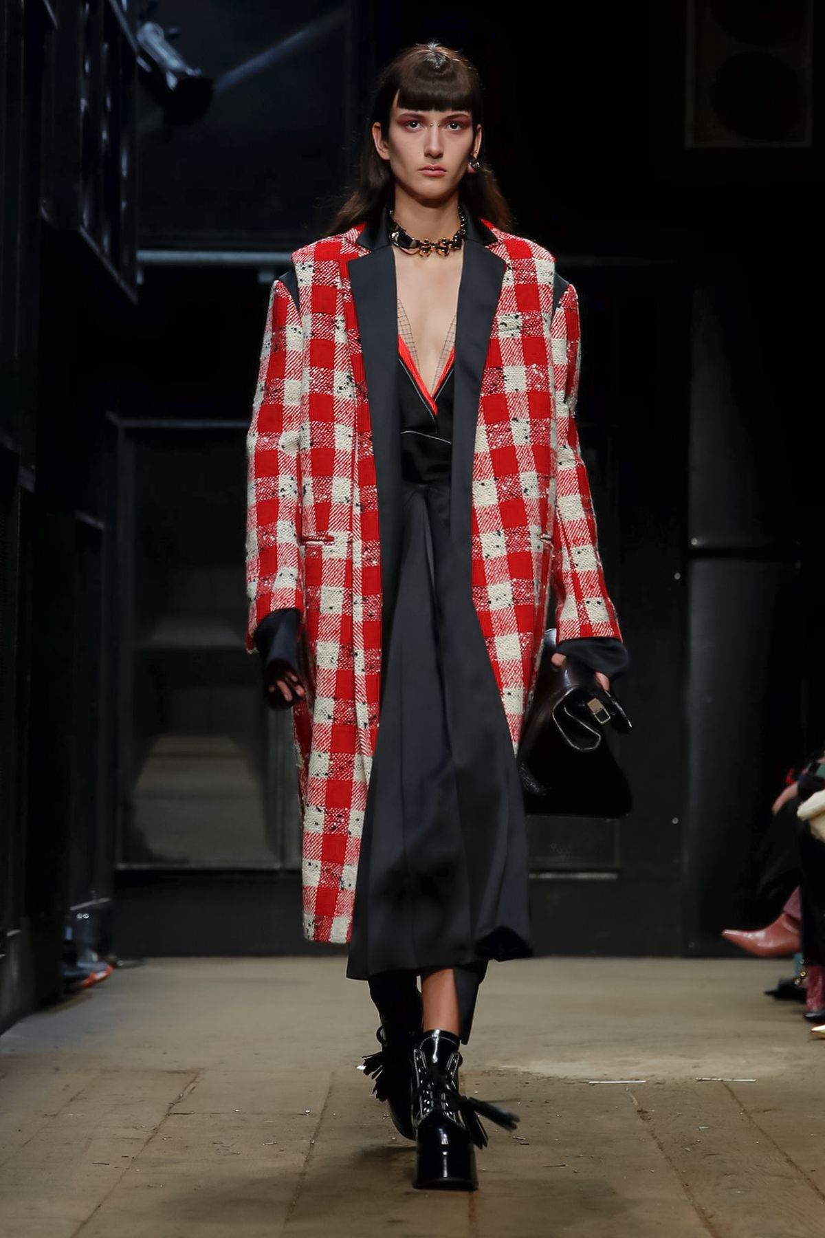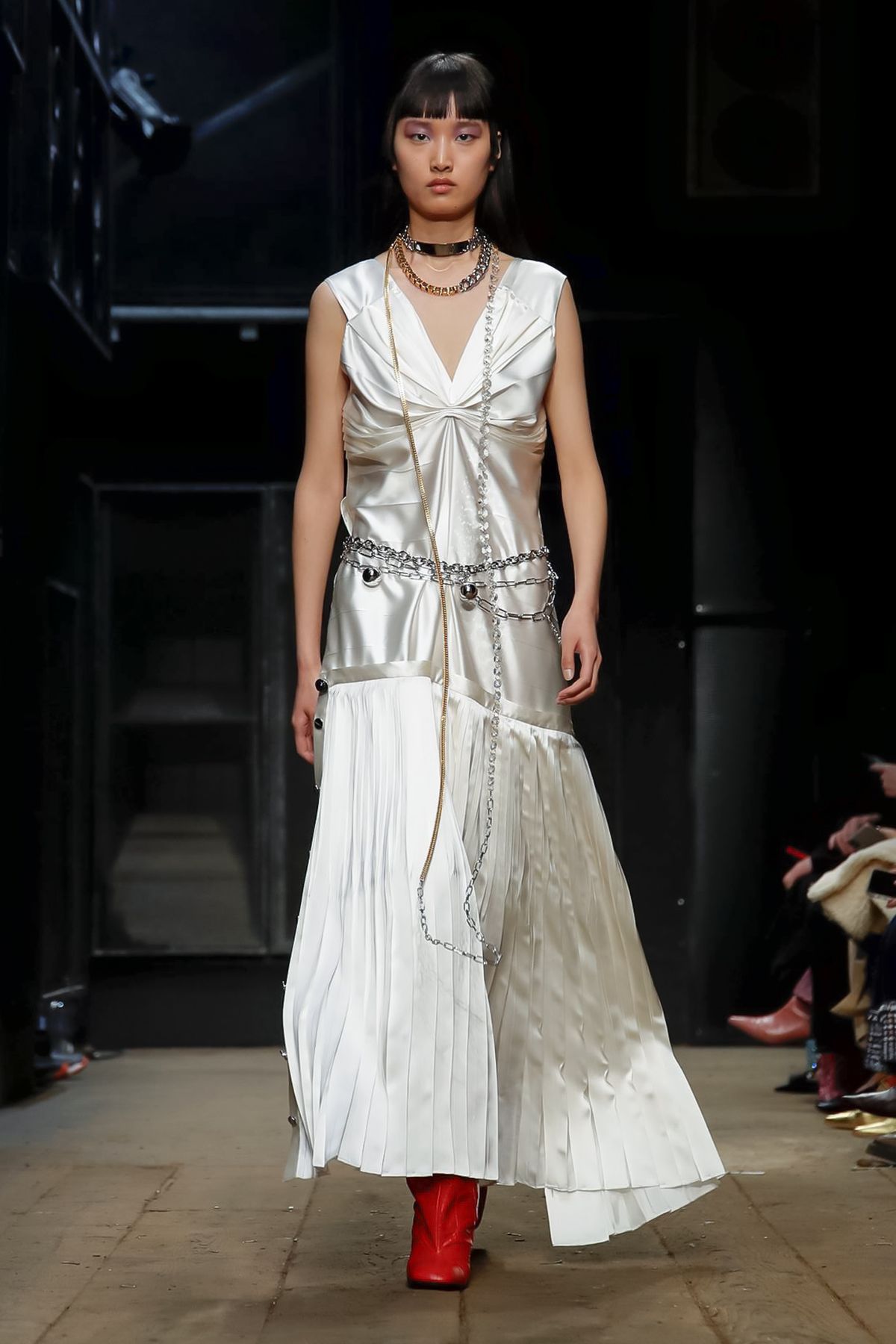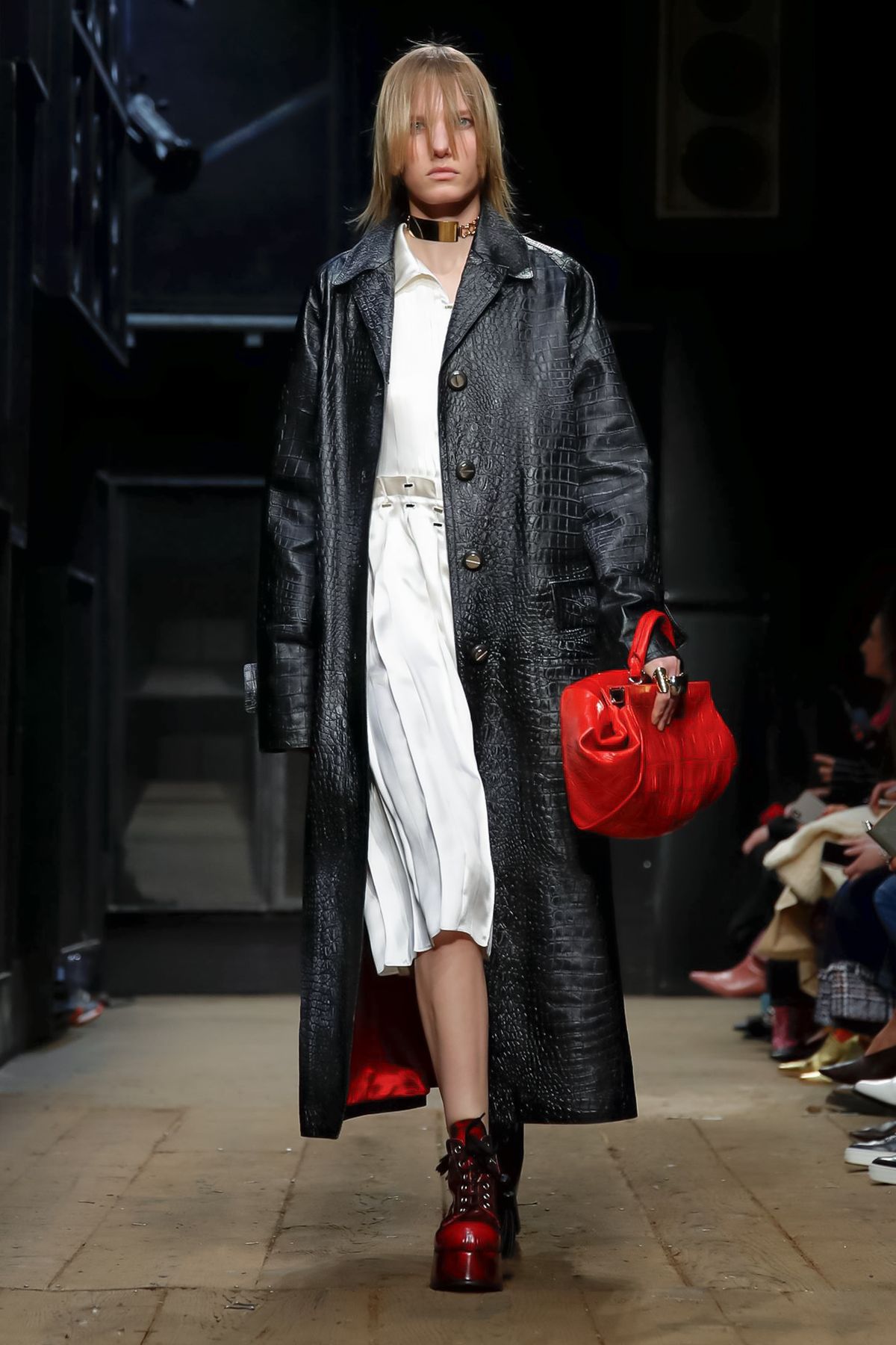 Gli ospiti sono stati accolti nello stesso spazio in cui lo show maschile è stato allestito solo poche settimane fa, in una stanza piena di altoparlanti come pareti e luci scure multicolore. La collezione è stata vista come un divertente gioco erotico sul linguaggio del corpo e sulla sensualità. Racconta una storia di preliminari ed erotismo attraverso tagli e pieghe, abiti e gonne formati da due inserti diversi, e abiti tagliati intorno al collo. Le catene apparivano come collane composte avvolte attorno al collo e attraverso i corpi. Stivali e stivaletti con alti plateau hanno contribuito alla sensualità generale della collezione. Questa collezione era semplicemente un'altra dimostrazione della destrezza e della fluida immaginazione di Risso, che a tratti sta cercando di reimmaginare il marchio da zero. Una palette di rossi, neri, arancioni, grigi, tra gli altri, sono stati immersi nella collezione sulle giacche da uomo mezzo taglio, gonne a pieghe e sciarpe e abiti con gli strass. La collezione era in qualche modo una celebrazione dei diritti della libertà nella scelta di essere sessuali come si può essere senza giudizio o presunzioni. Ogni pezzo è stato realizzato con attenzione ai dettagli del corpo senza essere troppo sgargianti o volgari.