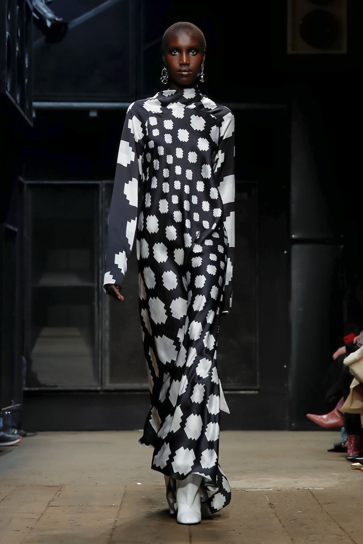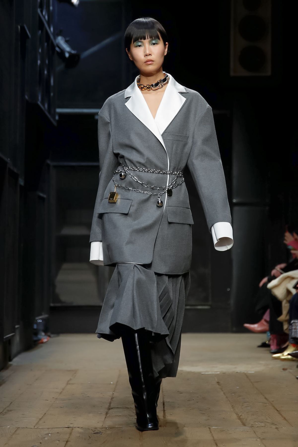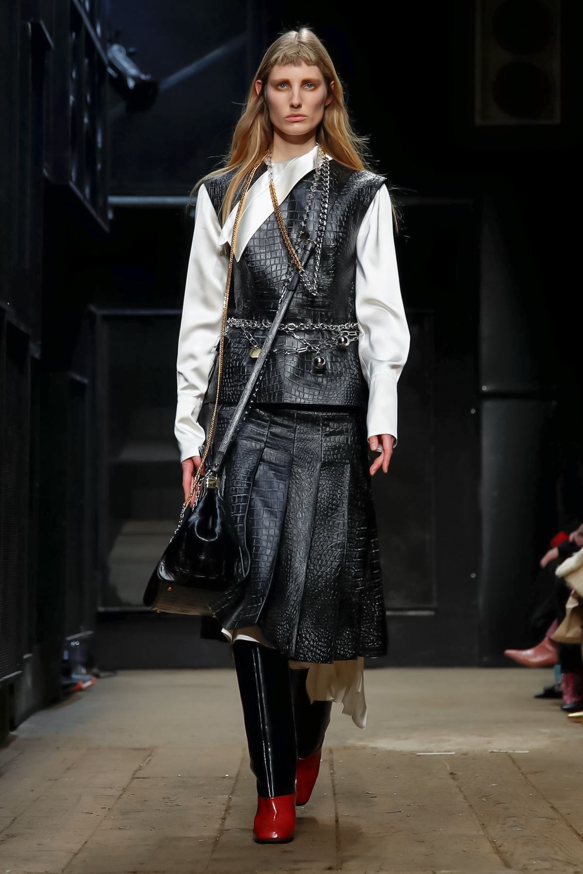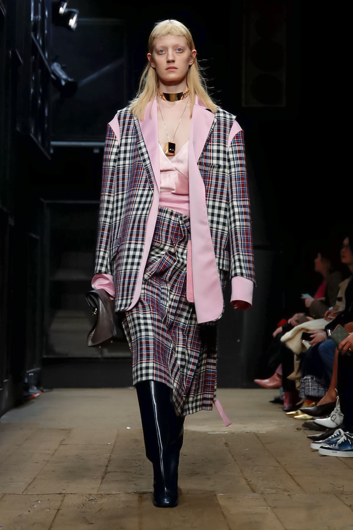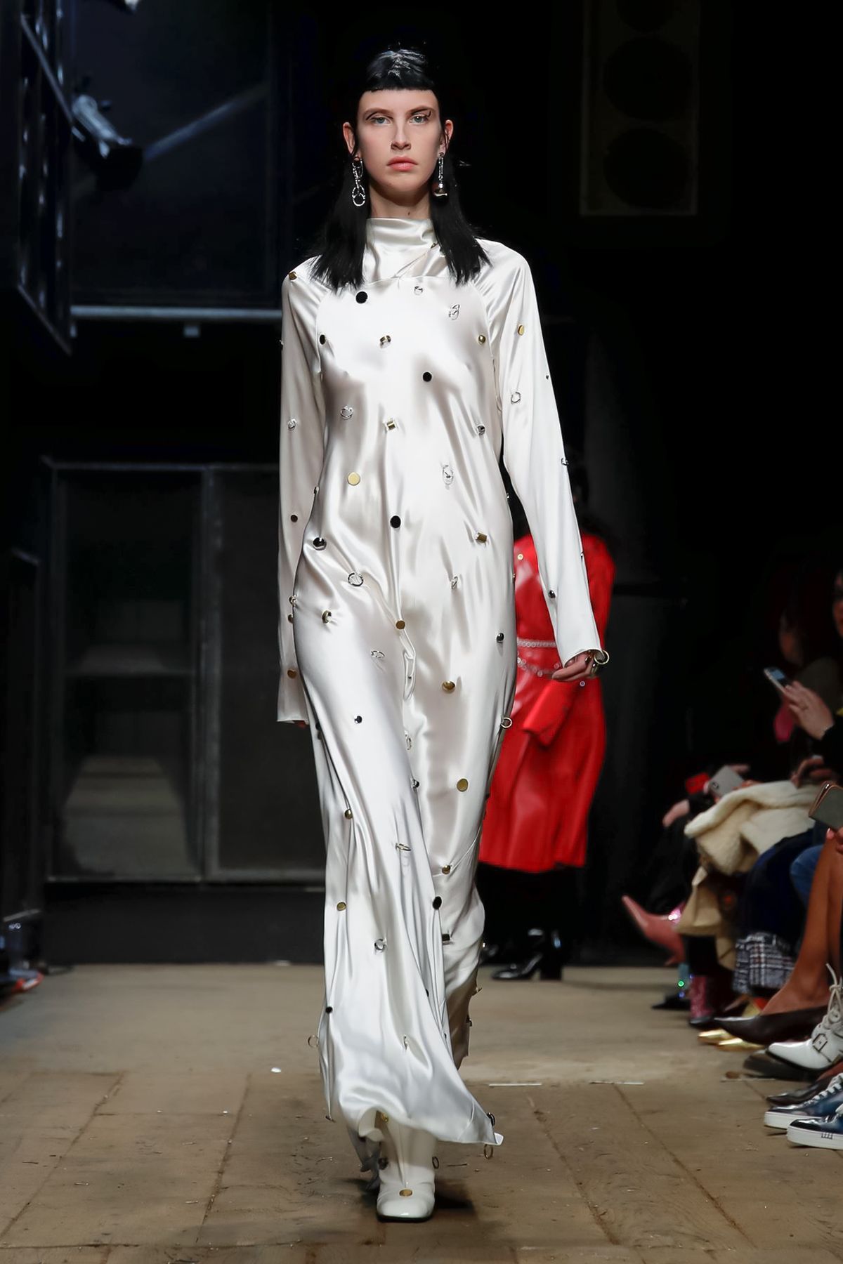 Gli ospiti sono stati accolti nello stesso spazio in cui lo show maschile è stato allestito solo poche settimane fa, in una stanza piena di altoparlanti come pareti e luci scure multicolore. La collezione è stata vista come un divertente gioco erotico sul linguaggio del corpo e sulla sensualità. Racconta una storia di preliminari ed erotismo attraverso tagli e pieghe, abiti e gonne formati da due inserti diversi, e abiti tagliati intorno al collo. Le catene apparivano come collane composte avvolte attorno al collo e attraverso i corpi. Stivali e stivaletti con alti plateau hanno contribuito alla sensualità generale della collezione. Questa collezione era semplicemente un'altra dimostrazione della destrezza e della fluida immaginazione di Risso, che a tratti sta cercando di reimmaginare il marchio da zero. Una palette di rossi, neri, arancioni, grigi, tra gli altri, sono stati immersi nella collezione sulle giacche da uomo mezzo taglio, gonne a pieghe e sciarpe e abiti con gli strass. La collezione era in qualche modo una celebrazione dei diritti della libertà nella scelta di essere sessuali come si può essere senza giudizio o presunzioni. Ogni pezzo è stato realizzato con attenzione ai dettagli del corpo senza essere troppo sgargianti o volgari.