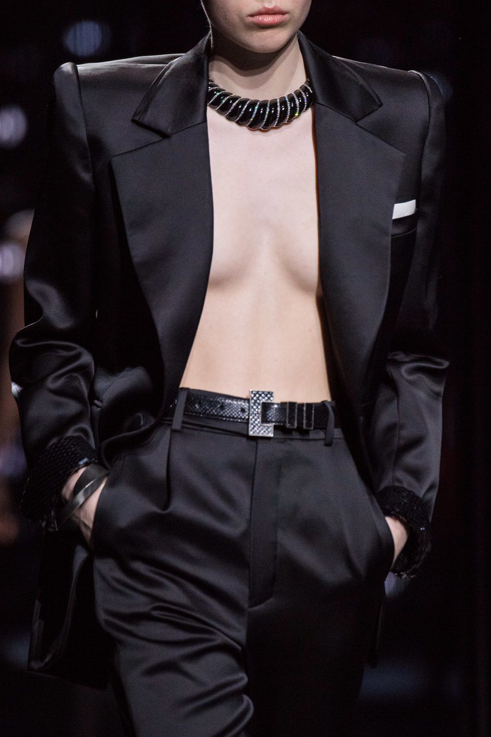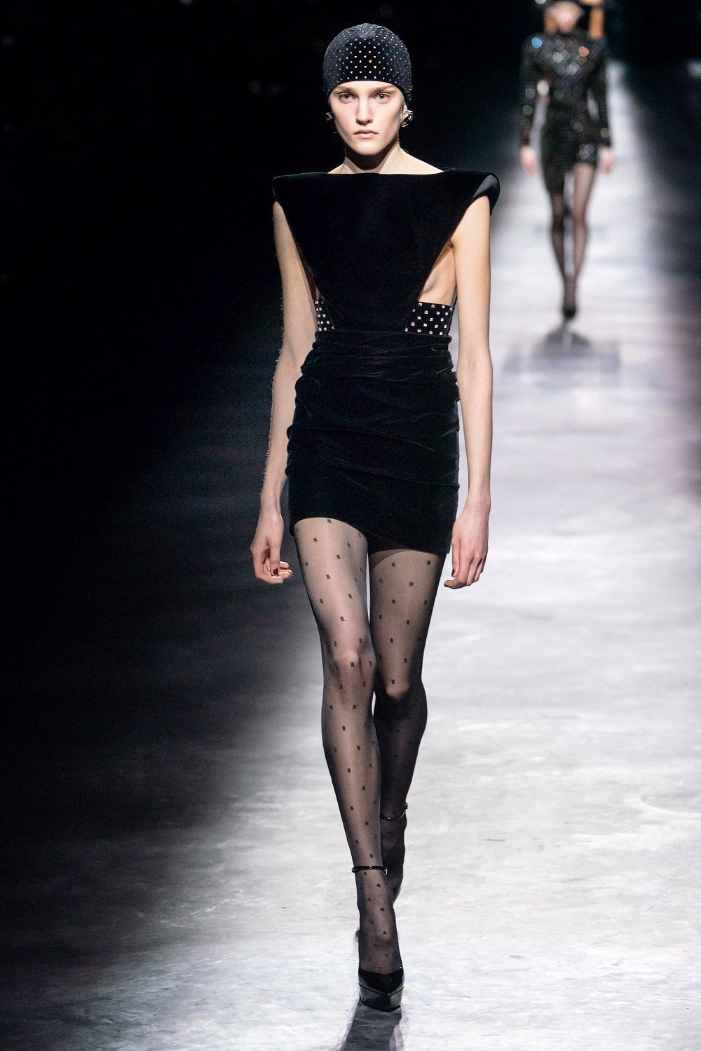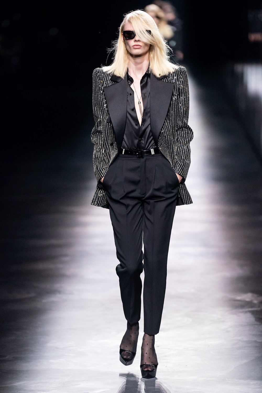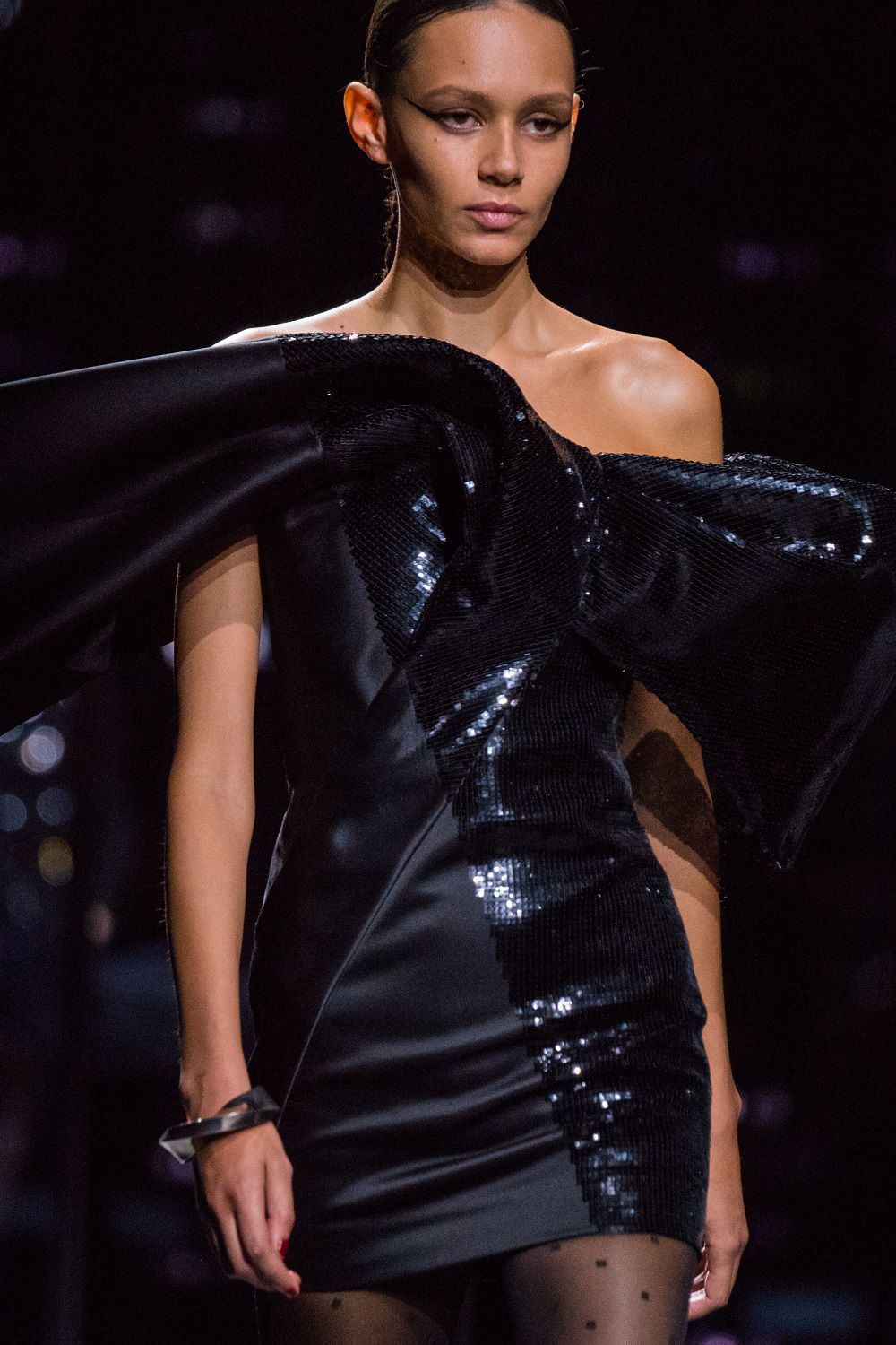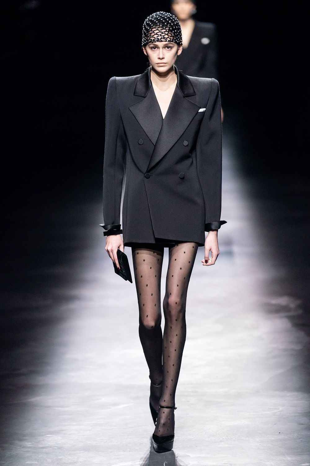 In una notte illuminata ad hoc, la passerella si riempie di cloni di Betty Catroux, Bianca Jagger e Catherine Deneuve, donne forti e consapevoli del propri fascino che si vestono per loro stesse e per nessun altro. Scelgono silhouette dalle linee scultoree, dal sapore Eighties, con le spalle in primo piano che mettono in risalto i capispalla e i minidress scultorei. Giocano col menswear, con i cappotti sartoriali e i completi portati sulla pelle nuda (impossibile non citare il suit bianco che ricorda quello iconico di Bianca Jagger), ma urlano la loro femminilità con micro-shorts, bluse in seta trasparente, top in rete, abiti iper sexy, blazer in vinile, pantaloni dal taglio affilato e una pioggia di cristalli, maxi ruches, paillettes, fiocchi.