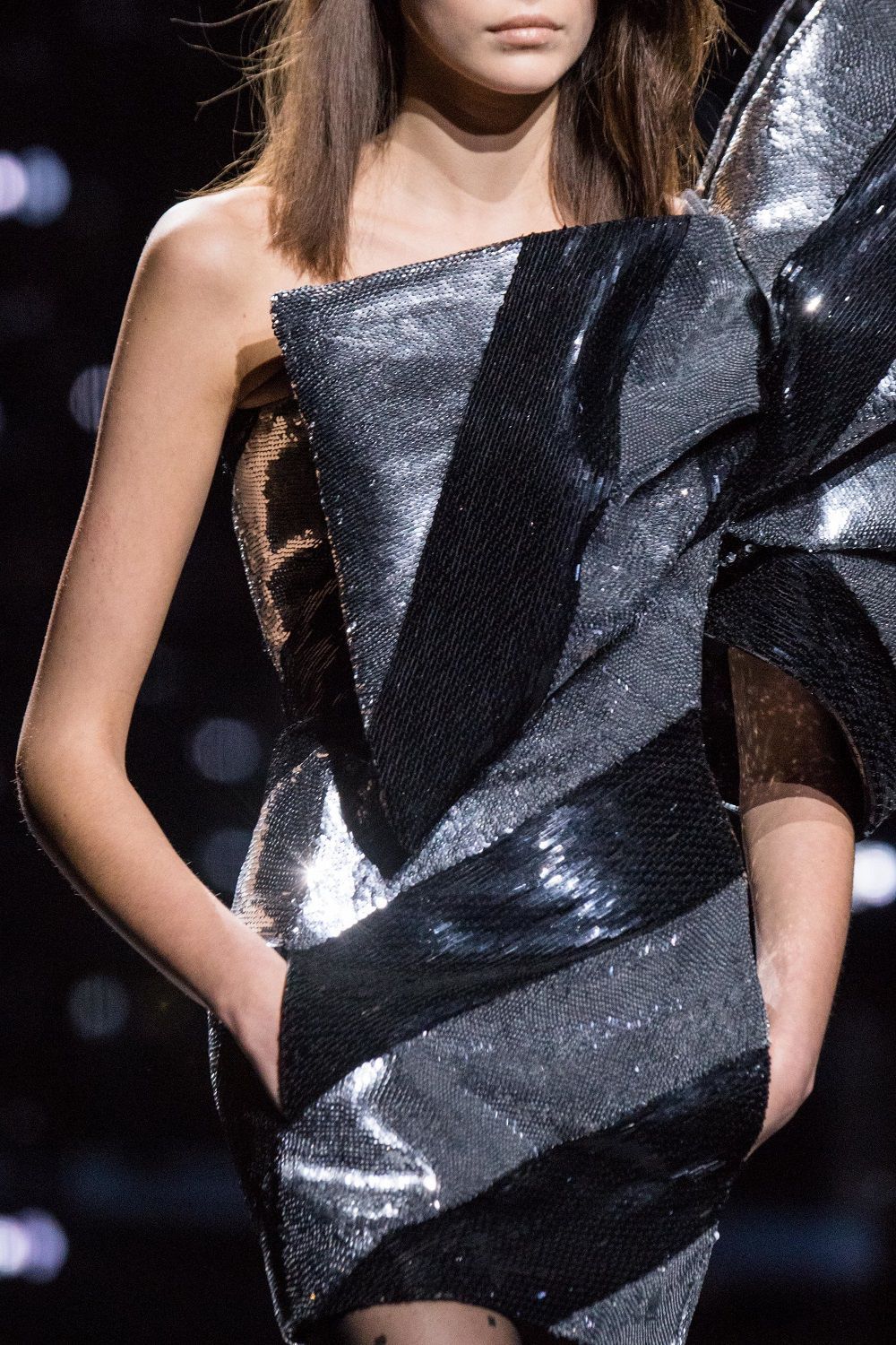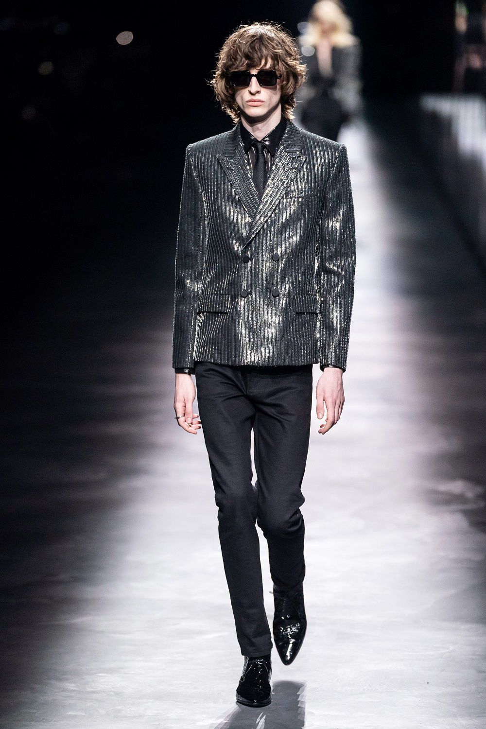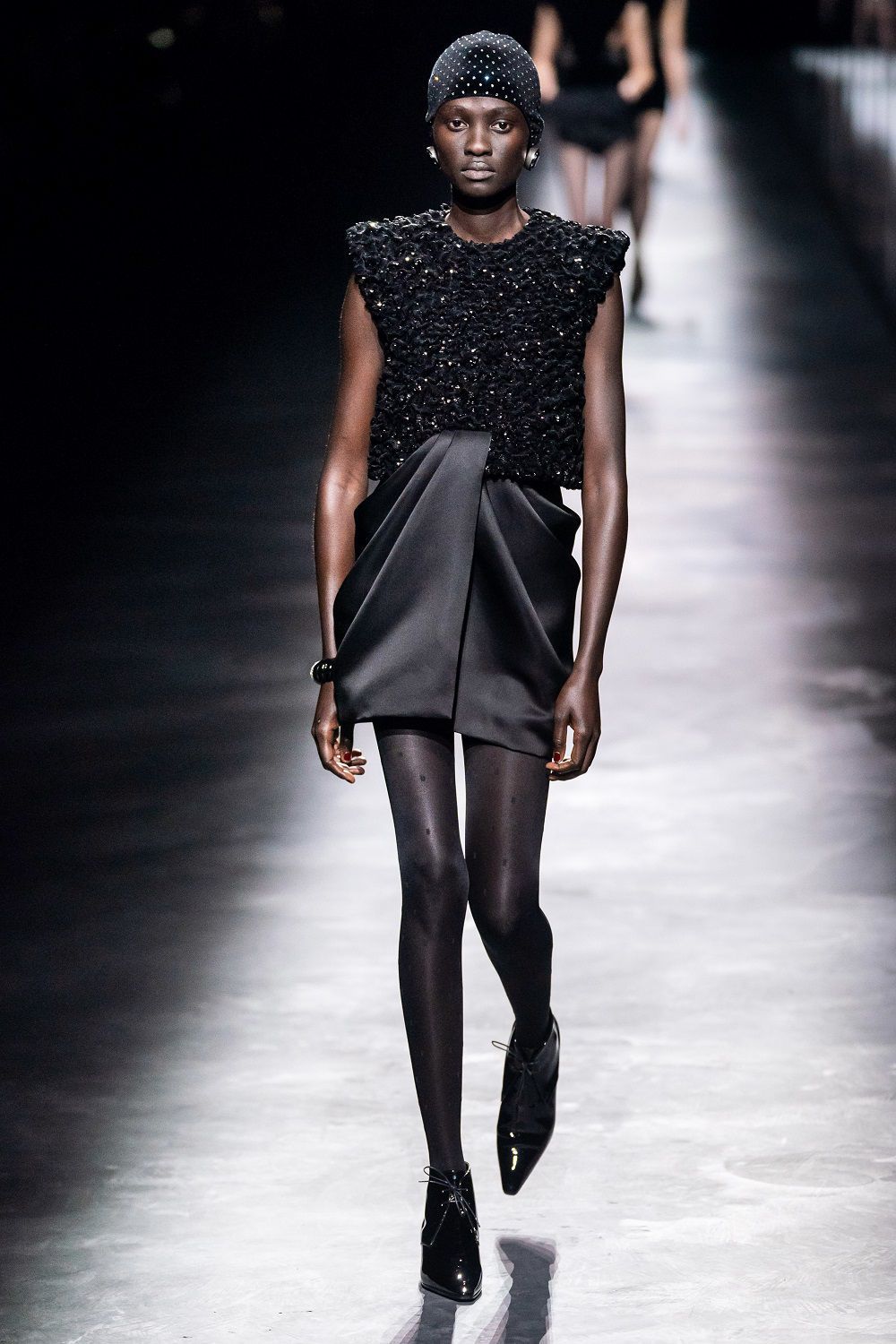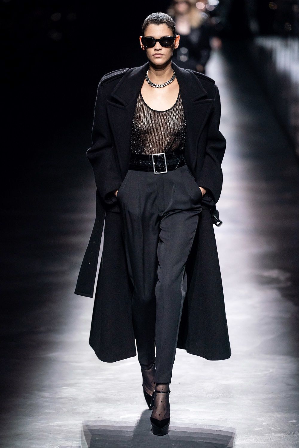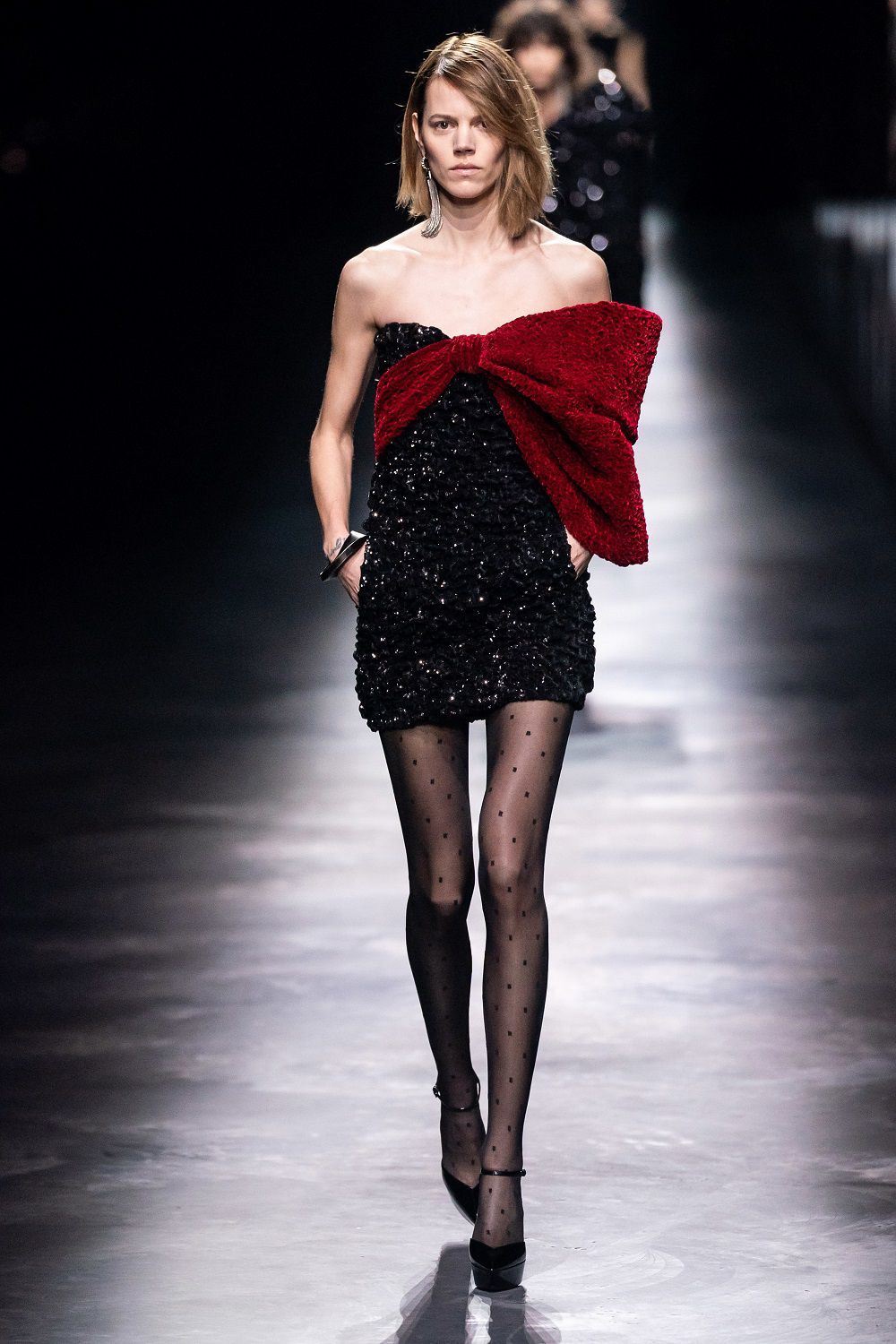 In una notte illuminata ad hoc, la passerella si riempie di cloni di Betty Catroux, Bianca Jagger e Catherine Deneuve, donne forti e consapevoli del propri fascino che si vestono per loro stesse e per nessun altro. Scelgono silhouette dalle linee scultoree, dal sapore Eighties, con le spalle in primo piano che mettono in risalto i capispalla e i minidress scultorei. Giocano col menswear, con i cappotti sartoriali e i completi portati sulla pelle nuda (impossibile non citare il suit bianco che ricorda quello iconico di Bianca Jagger), ma urlano la loro femminilità con micro-shorts, bluse in seta trasparente, top in rete, abiti iper sexy, blazer in vinile, pantaloni dal taglio affilato e una pioggia di cristalli, maxi ruches, paillettes, fiocchi.