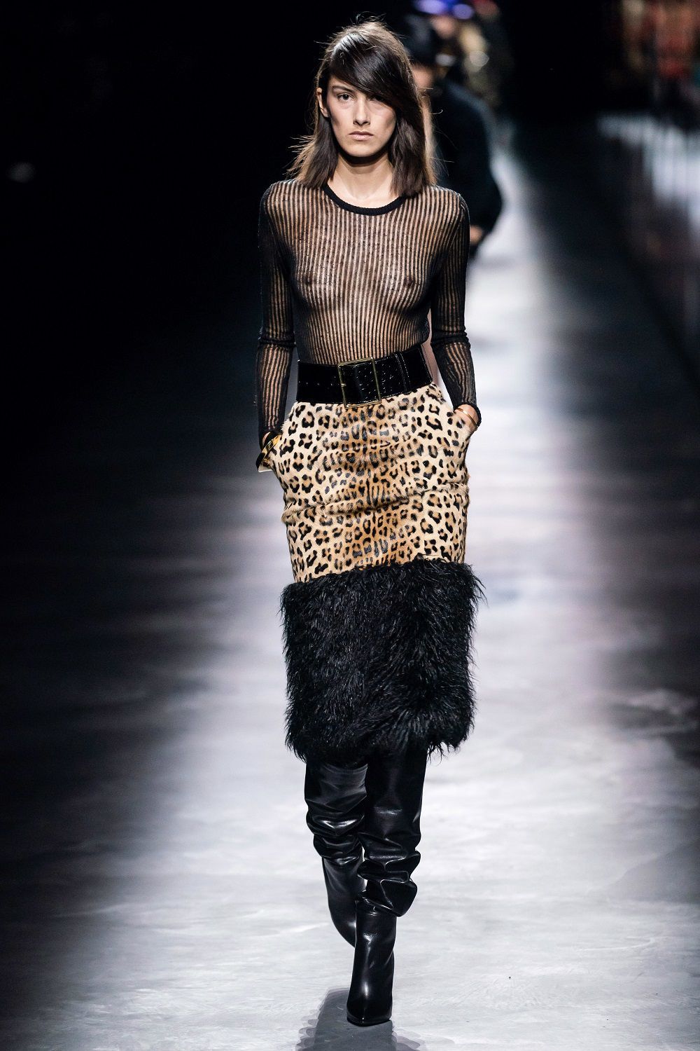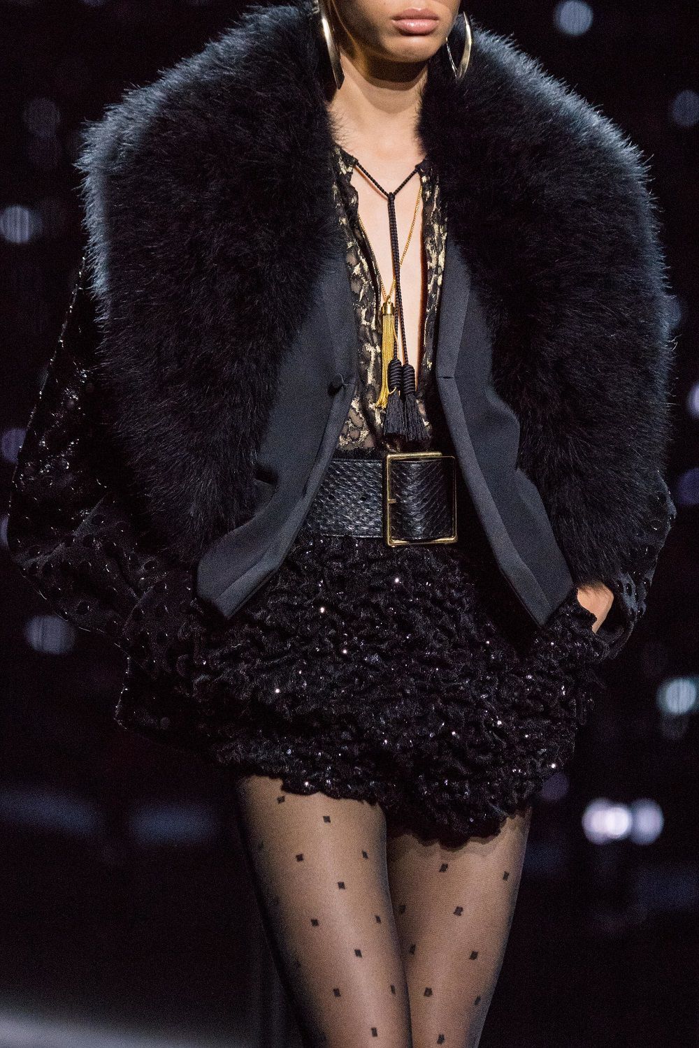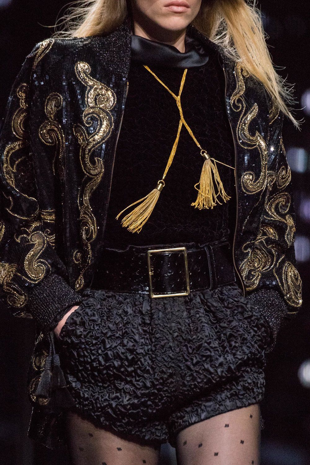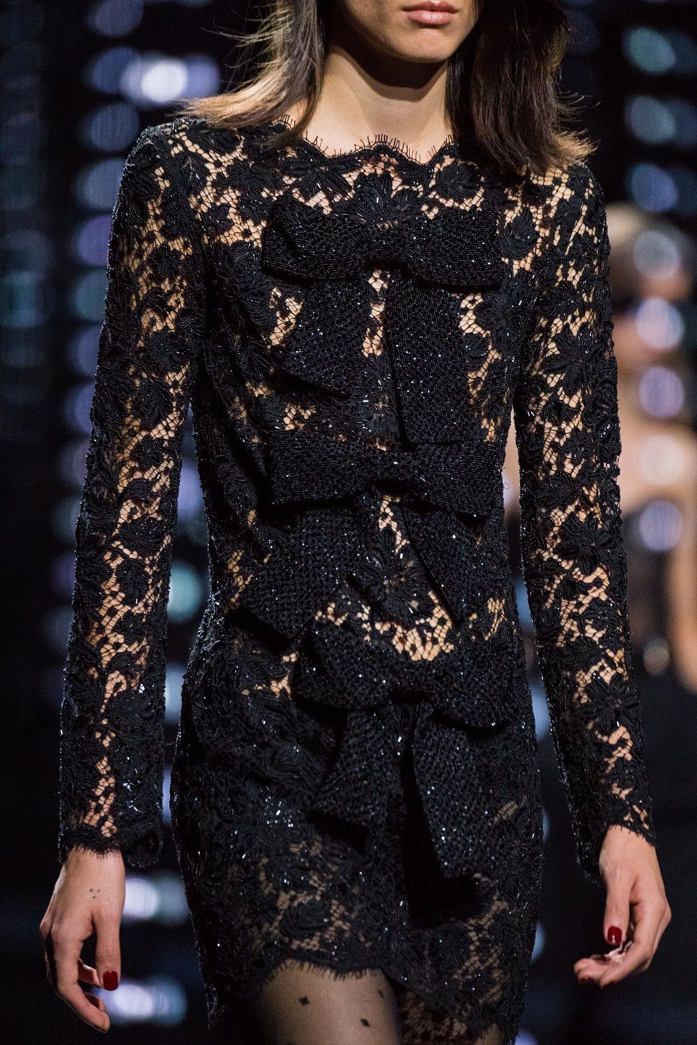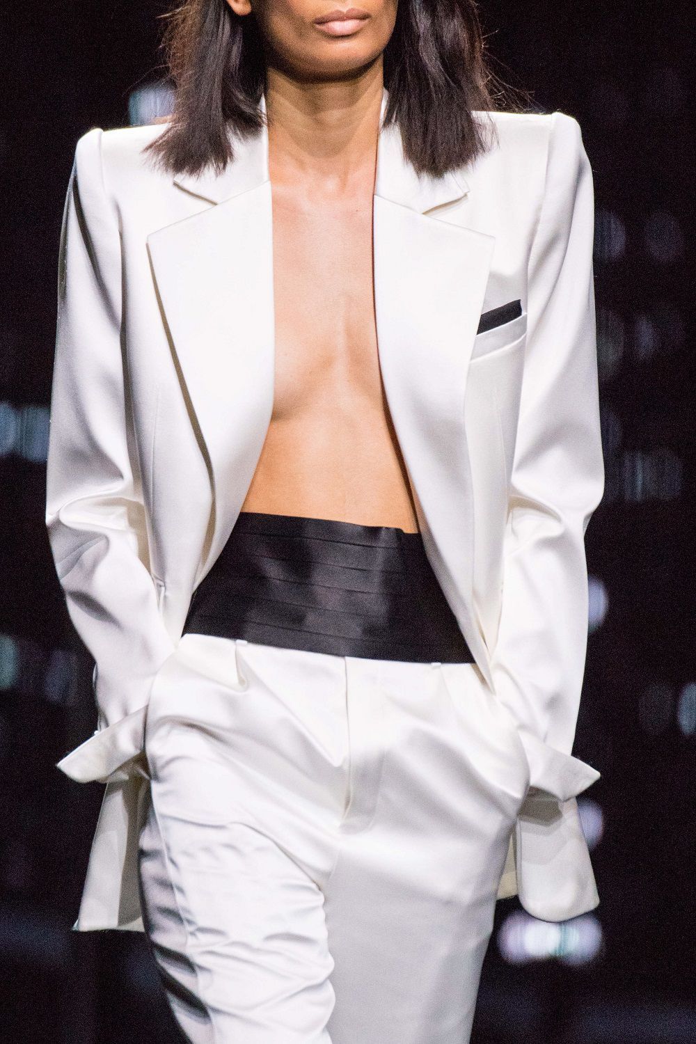 In una notte illuminata ad hoc, la passerella si riempie di cloni di Betty Catroux, Bianca Jagger e Catherine Deneuve, donne forti e consapevoli del propri fascino che si vestono per loro stesse e per nessun altro. Scelgono silhouette dalle linee scultoree, dal sapore Eighties, con le spalle in primo piano che mettono in risalto i capispalla e i minidress scultorei. Giocano col menswear, con i cappotti sartoriali e i completi portati sulla pelle nuda (impossibile non citare il suit bianco che ricorda quello iconico di Bianca Jagger), ma urlano la loro femminilità con micro-shorts, bluse in seta trasparente, top in rete, abiti iper sexy, blazer in vinile, pantaloni dal taglio affilato e una pioggia di cristalli, maxi ruches, paillettes, fiocchi.