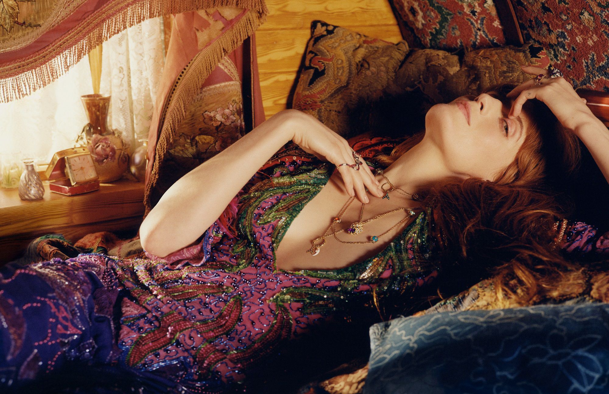 Florence, da tempo ambasciatrice della collezione gioielli di Gucci, torna ora a posare per la leggendaria casa di moda in una campagna dal sapore bohémien: Welch è ritratta all'interno di una carrozza in legno di ispirazione rétro, traboccante di coloratissimi elementi d’arredo e oggetti vari. La cantante inglese indossa anelli, bracciali e collane appartenenti alle collezioni di gioielli Le Marché des Merveilles, Gucci Ouroboros, Gucci Flora e Dionysus, oltre che alla collezione di gioielli in argento della Maison.