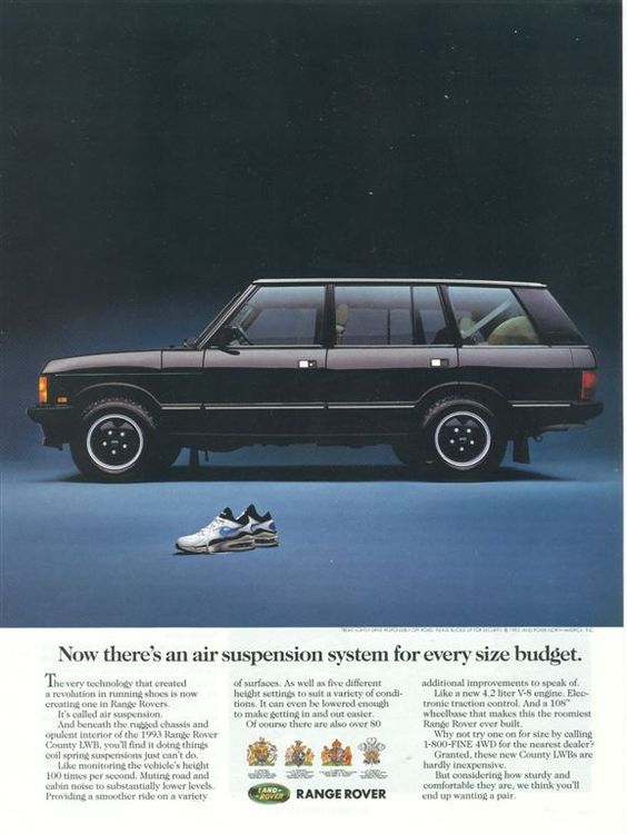 Un'operazione di Cross-Branding unica. Uno dei momenti più memorabili della storia delle Air Max. Questa geniale campagna Range Rover del 1993 metteva insieme la nuova tecnologia delle Air Max 93 e l'ultima novità del modello Range Rover che montava sospensioni ad aria, appunto.