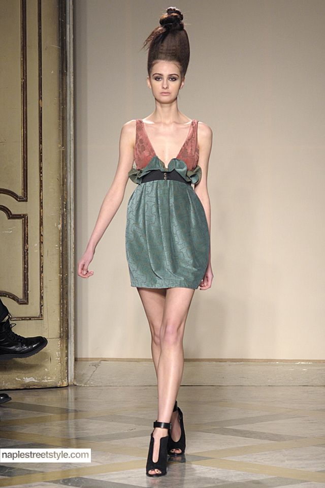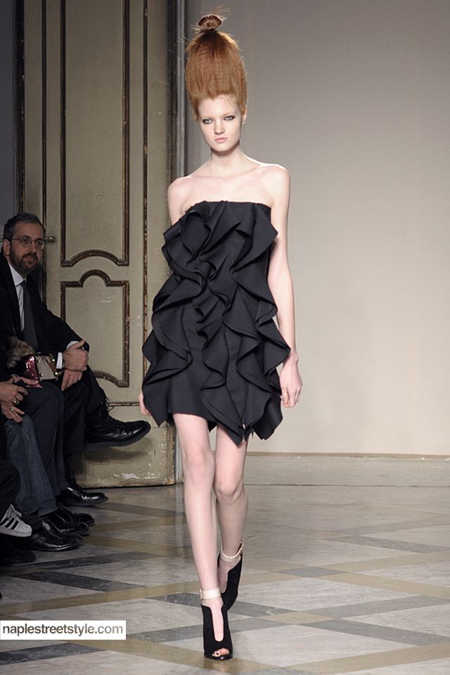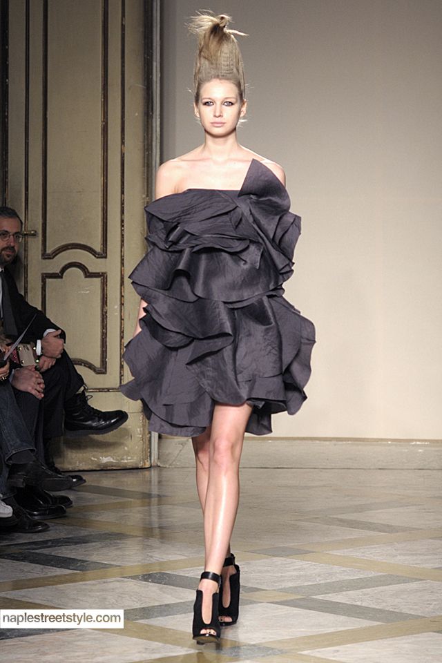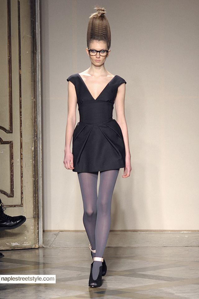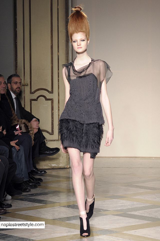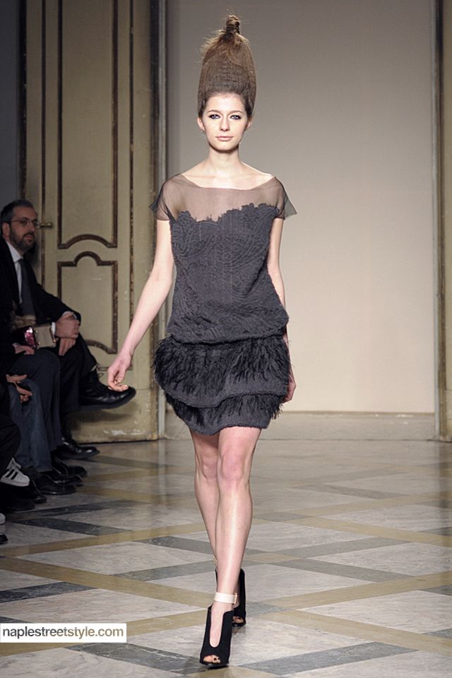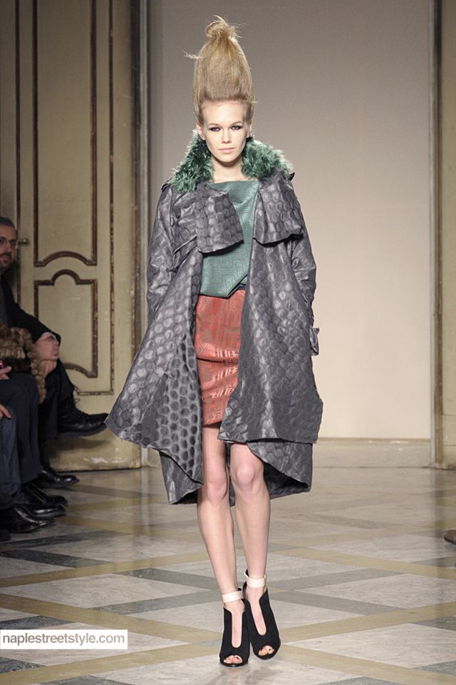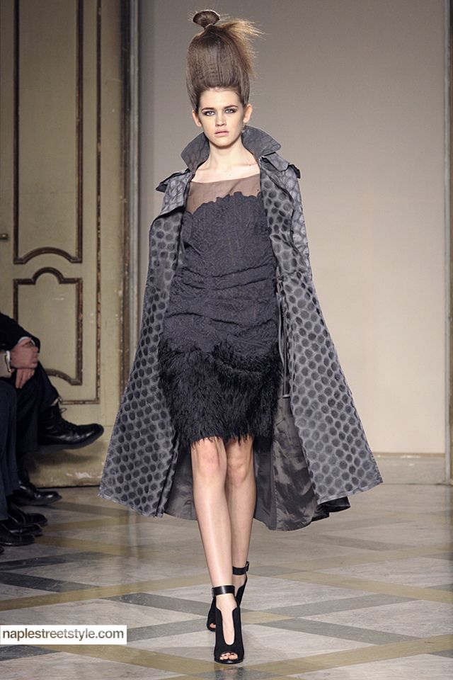 I virtuosismi sartoriali si alternano alle linee morbide anche negli abiti, realizzati in velluto decorato con disegni anni '20 e in preziosi tessuti jacquard fil coupé in organza di seta sfumata con decori in lana mohair. Il tutto in nero e grigio con tocchi di cipria e verde rame.