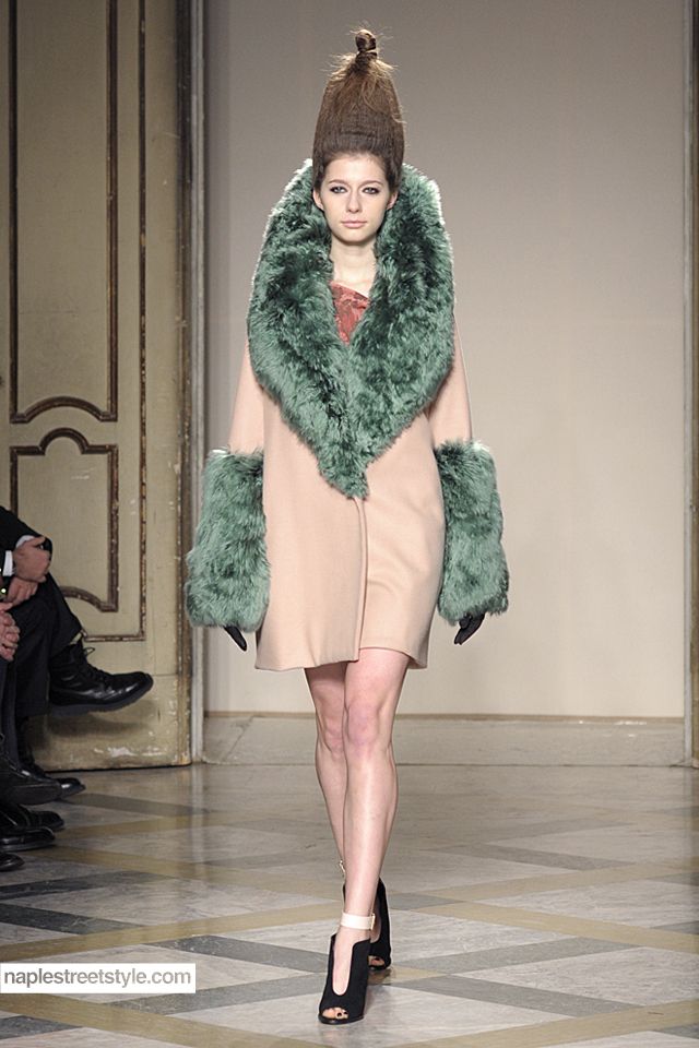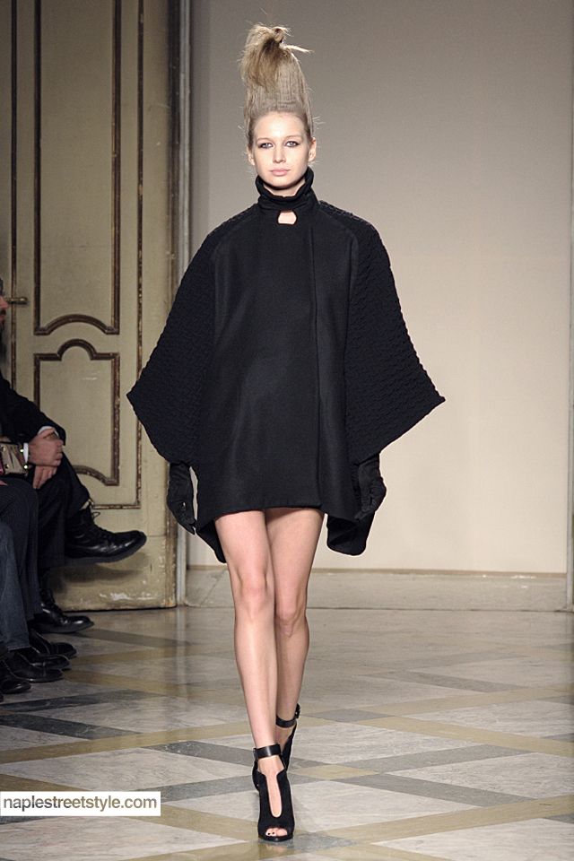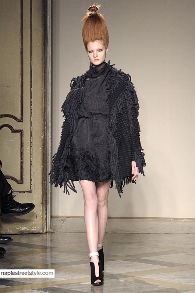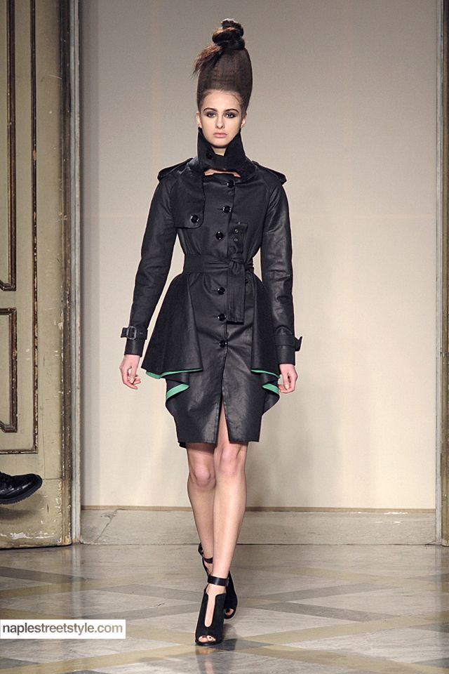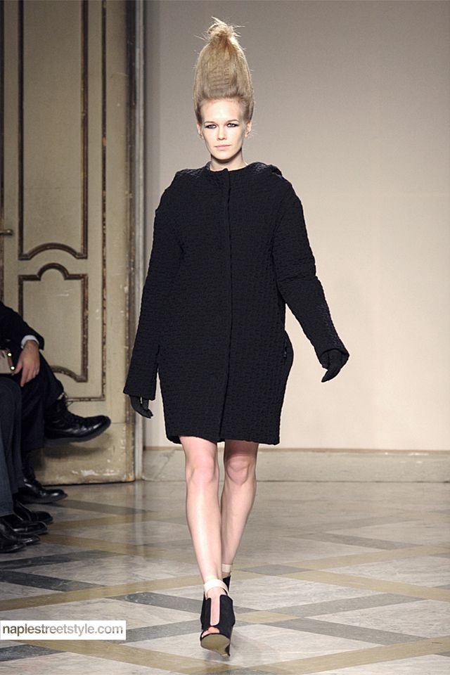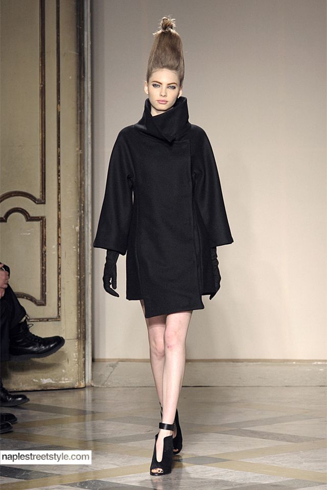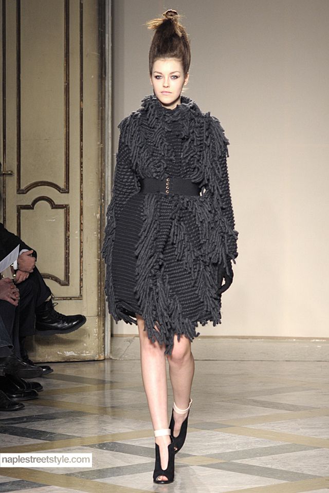 I cappotti couture realizzati in tessuti tecnici, cotoni cinzati e panni di cachemire, si arricchiscono di dettagli tridimensionali che valorizzano il fianco e il dietro. Come nel trench-redingote con volumi e drappeggi e nel caposcala caratterizzato da un intreccio asimmetrico di panno e fili di lana liberi che creano un effetto pelliccia. I trench in taffettà e pelliccia di alpaca diventano oversize e modificabili attraverso giochi di lacci.