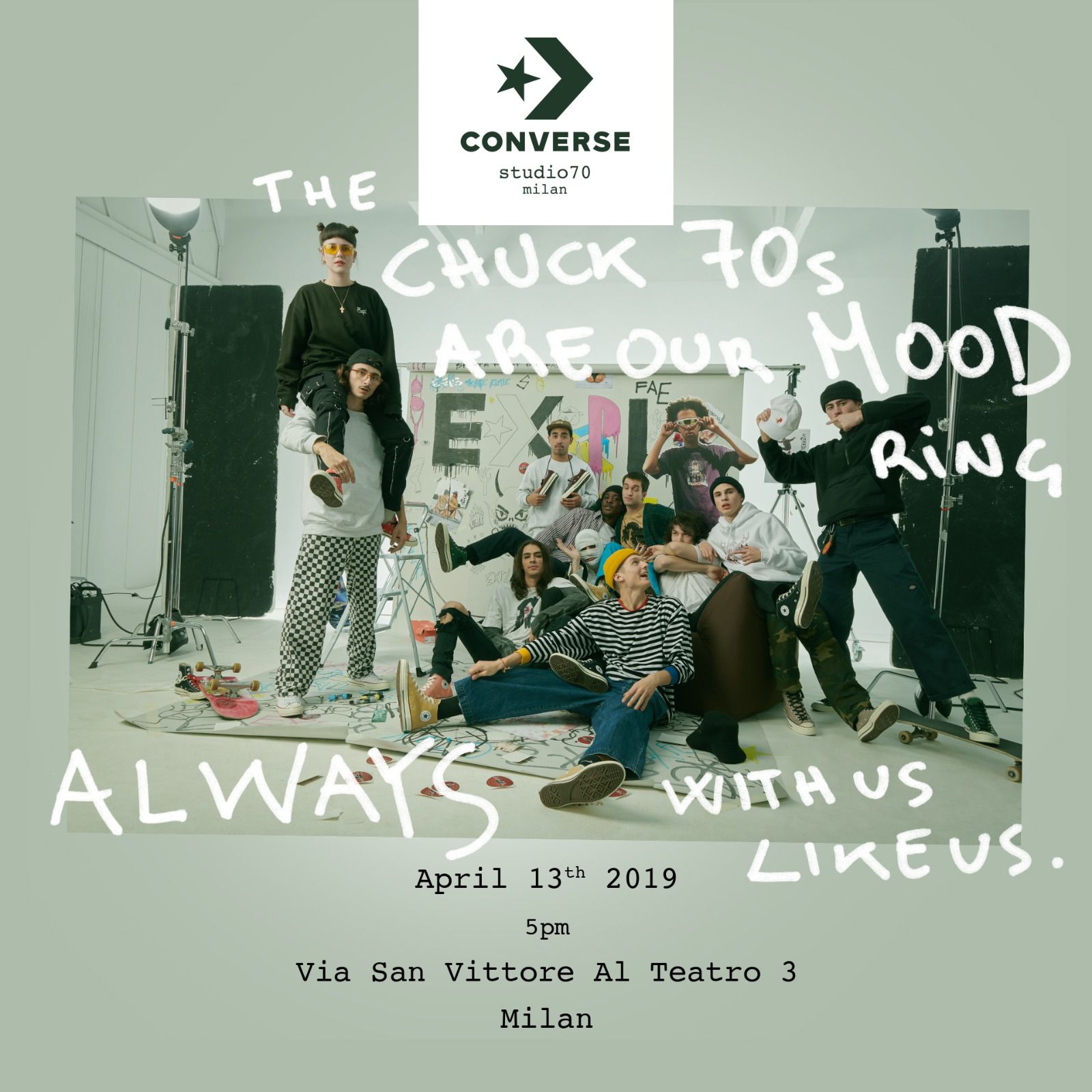Dal 12 al 14 aprile negli spazi di Via San Vittore al Teatro 3, Converse darà vita a Studio 70, un luogo pensato per rappresentare al meglio la visione artistica e l'espressione creativa di cinque diversi talenti, ispirato alle sottoculture, allo stile e all'estetica degli anni Settanta. Lo spazio vedrà l'esclusivo lancio della Converse Chuck 70 Reconstructed, rivisitazione contemporanea della classica silhouette ad opera di Slam Jam, retailer punto di riferimento nel mondo dello streetwear. Studio 70 ospiterà inoltre un pop-up arricchito da una serie di Chuck 70 vintage, sempre a cura di Slam Jam.