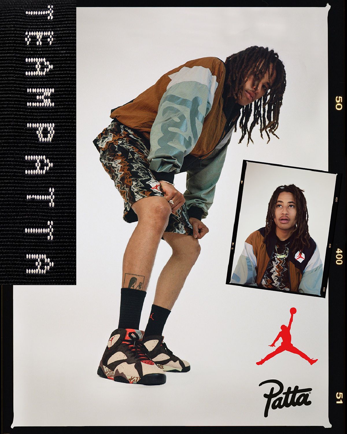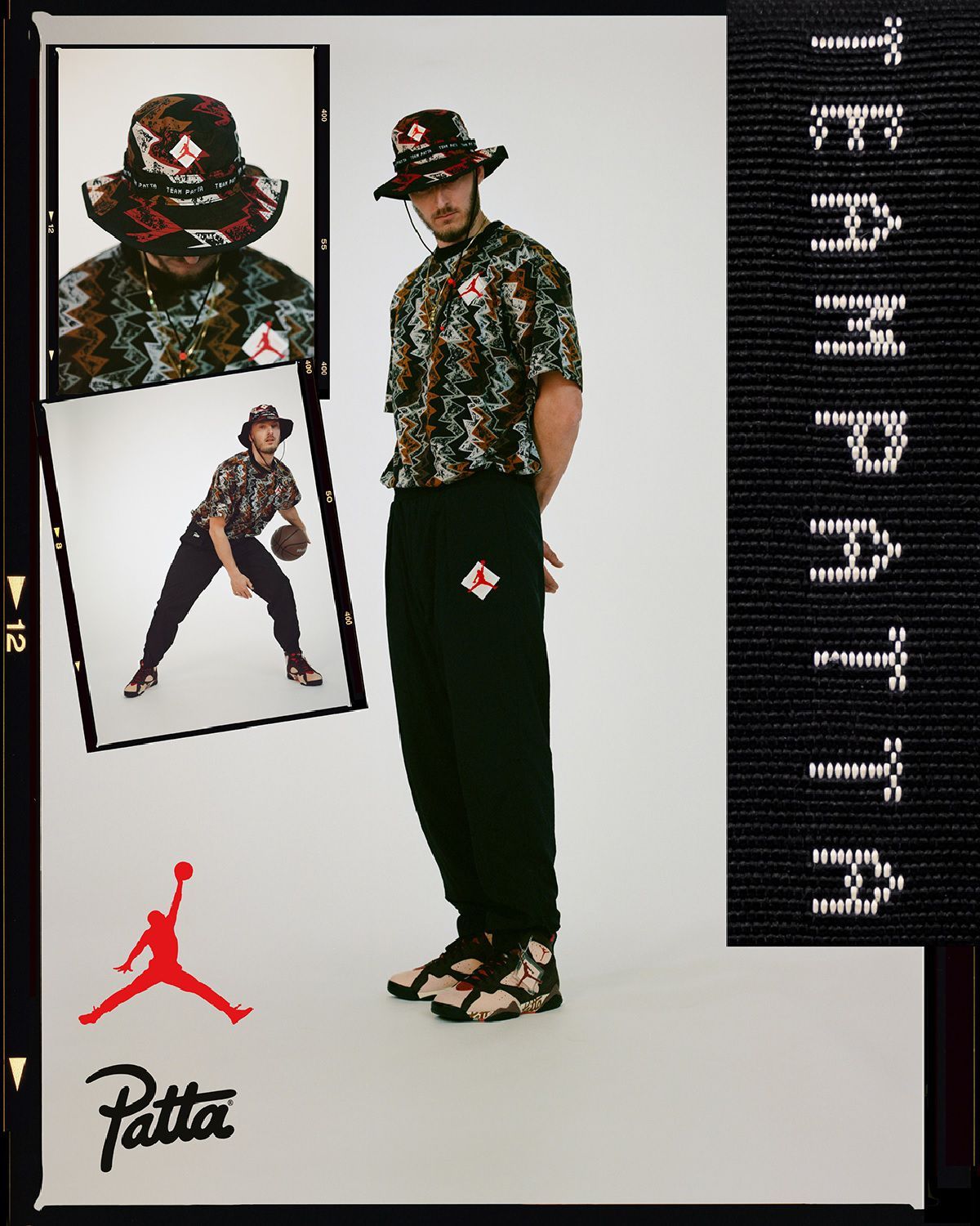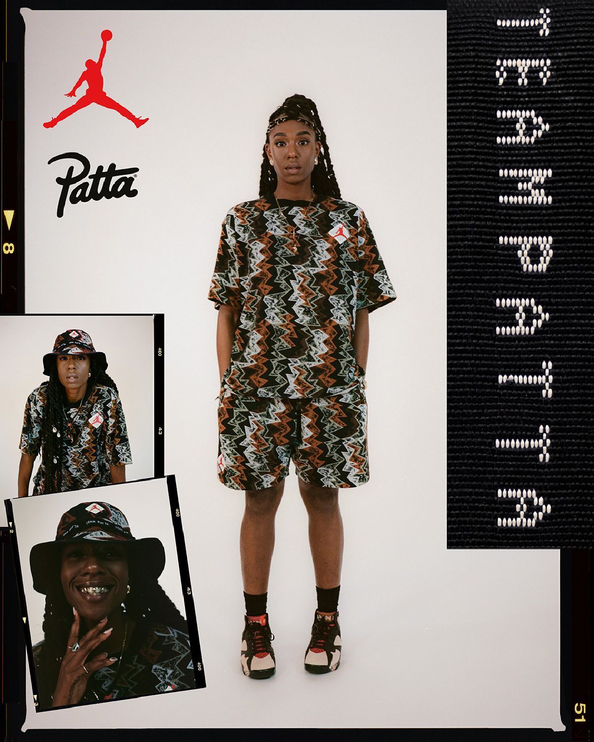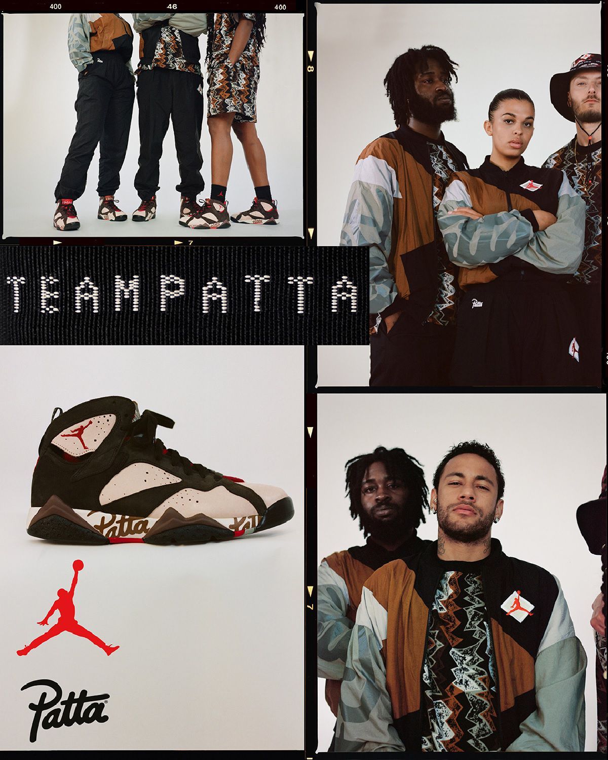 La nuova tomaia color crema è in contrasto con dettagli marroni scuro, Jumpman rosso sotto il collar e il logo di Patta sulla midsole. Gli stessi toni marroni arricchiti da tocchi di grigio rendono vibranti il pattern all over dal mood azteco, ispirato allo stile hip-hop degli anni ’80 e alle stampe d'archivio di JB, che caratterizza i capi della linea di abbigliamento. Protagonista assoluto del lookbook è la star del Paris Saint-Germain Neymar Jr., la collezione include pantaloncini, tuta, T-shirt e cappello boonie, valorizzati dal contrasto tra il nero e i motivi tribali.