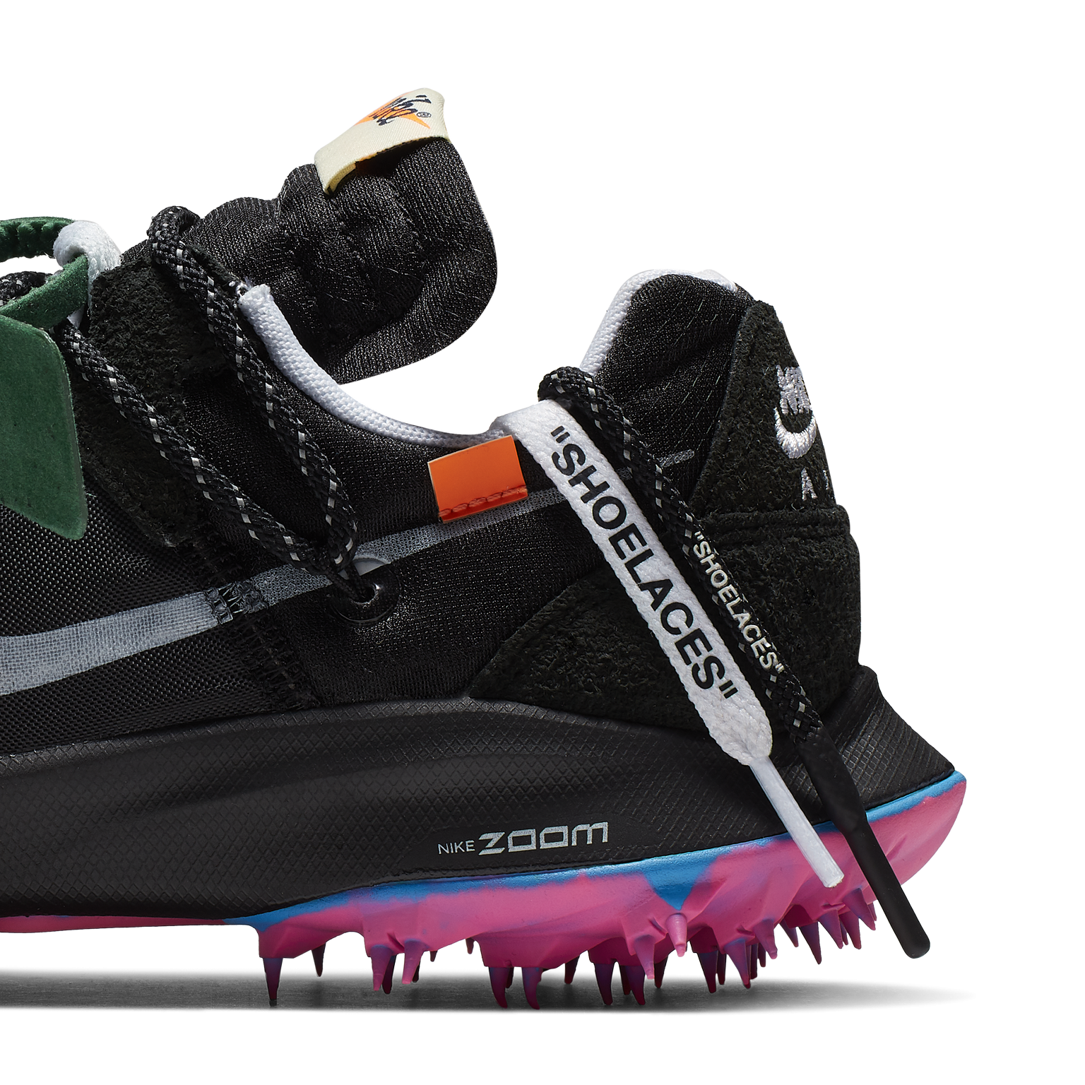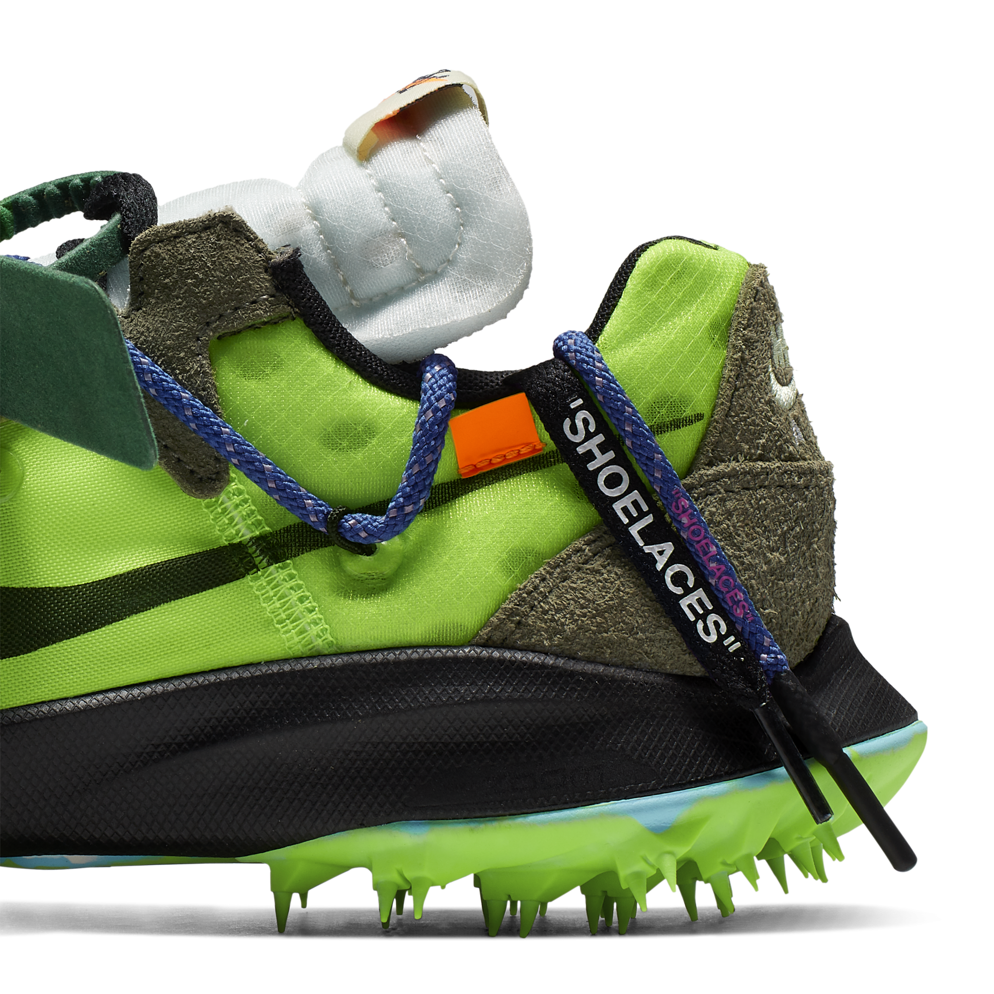 La silhouette da running della sneaker è di chiara ispirazione track&field con suola zoom chiodata e lacci tecnici, il tutto miscelato con gli elementi Off-White ormai diventati un classico: zip-tie in verde e tab arancione sullo Swoosh.