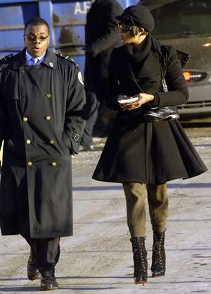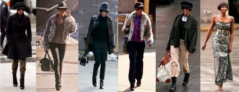 Se il primo giorno la Venere Nera era arrivata con un cappotto con dettagli in pelliccia di Giuliana Teso, nelle giornate successive sceglie un bomber totalmente in pelliccia, una giacca in pelle, sempre con un cappellino abbinato, tacchi rigorosamente altissimi, per concludere il tutto con una borsa Kelly di Hermès di dimensioni epiche. Il giovedì si mette un top di Etro, una pelliccia di Pologeorgis e un capellino dei Knicks - un regalo di Spike Lee.