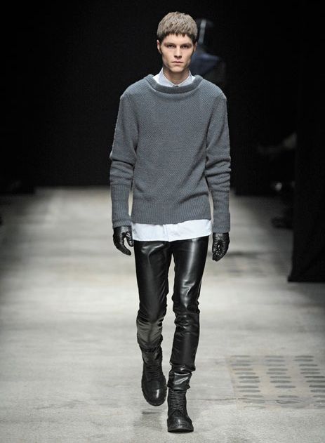 Pantaloni tagliati a laser di shantung leggeri oppure skinny in pelle nera ma sempre rigorosamente dritti da portare calzando anfibi total black caratteristici di questo rebel tailoring.