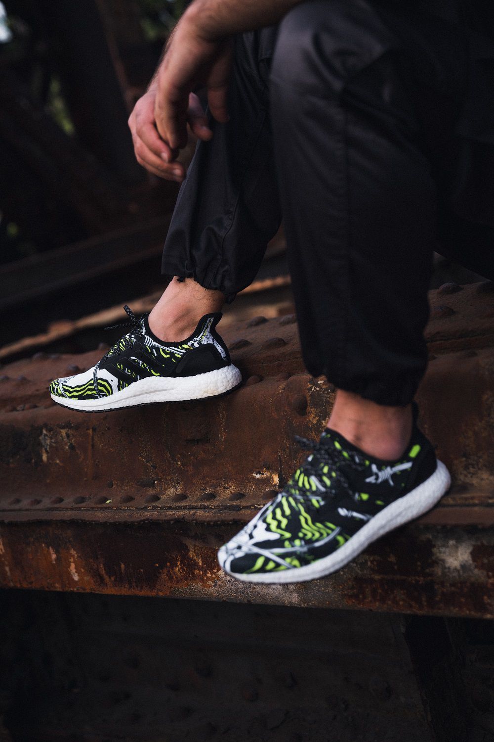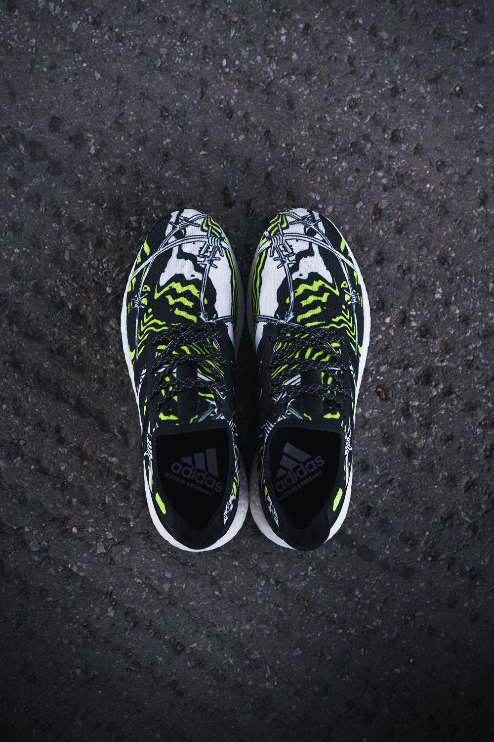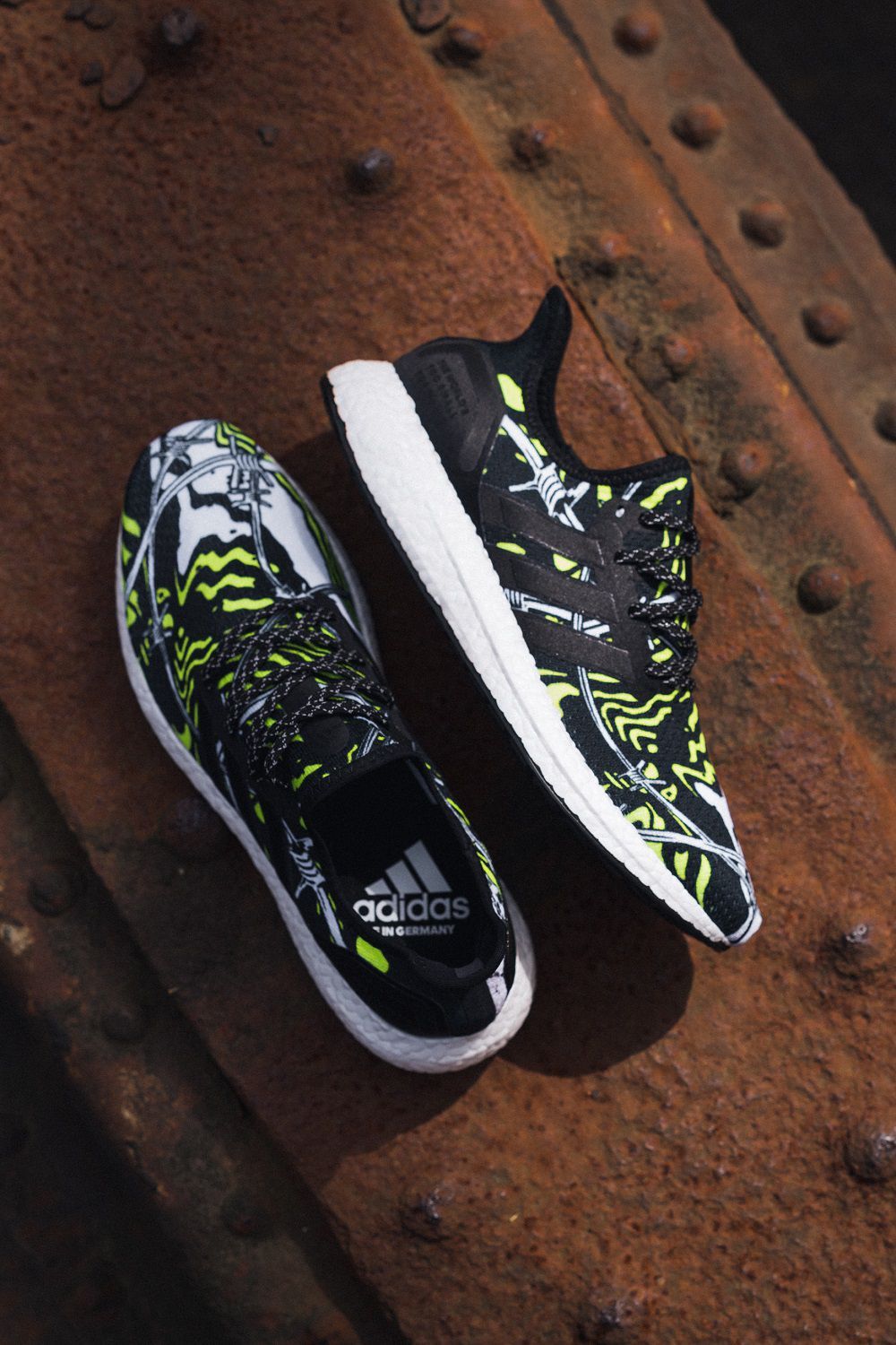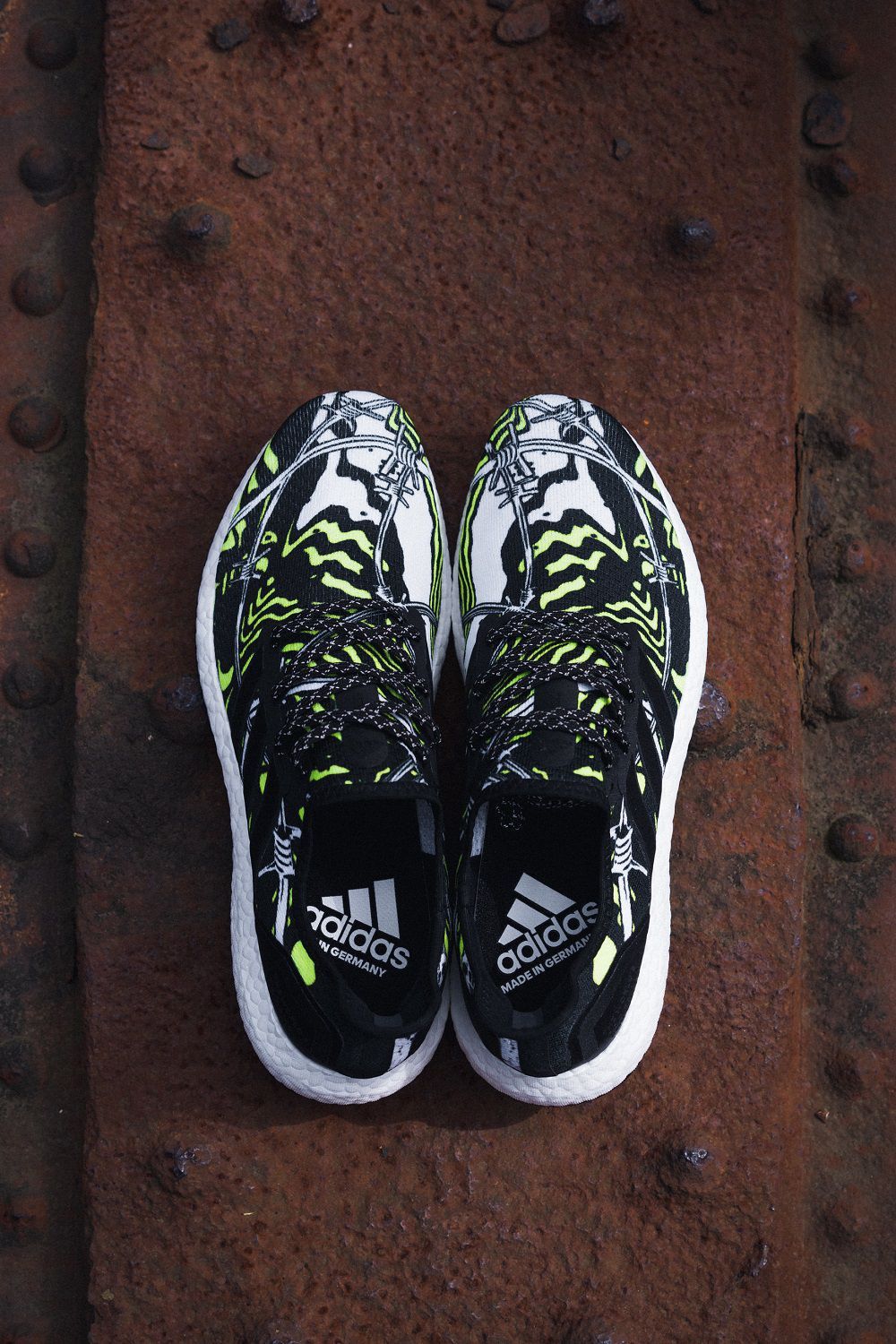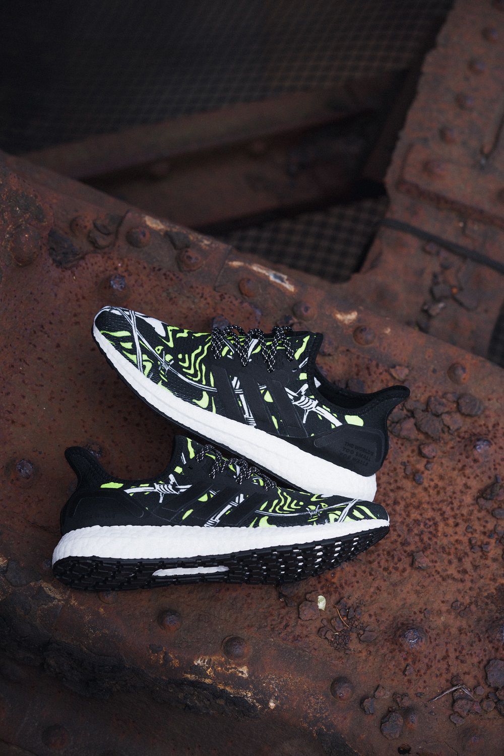 Da queste riflessioni è nata una sneaker caratterizzata da una tomaia bianca, nera e gialla in textile, con una grafica che raffigura fili spinati, muri e linee astratte. Sul tallone si legge l’incisione laser “The World’s Too Small for Walls”.