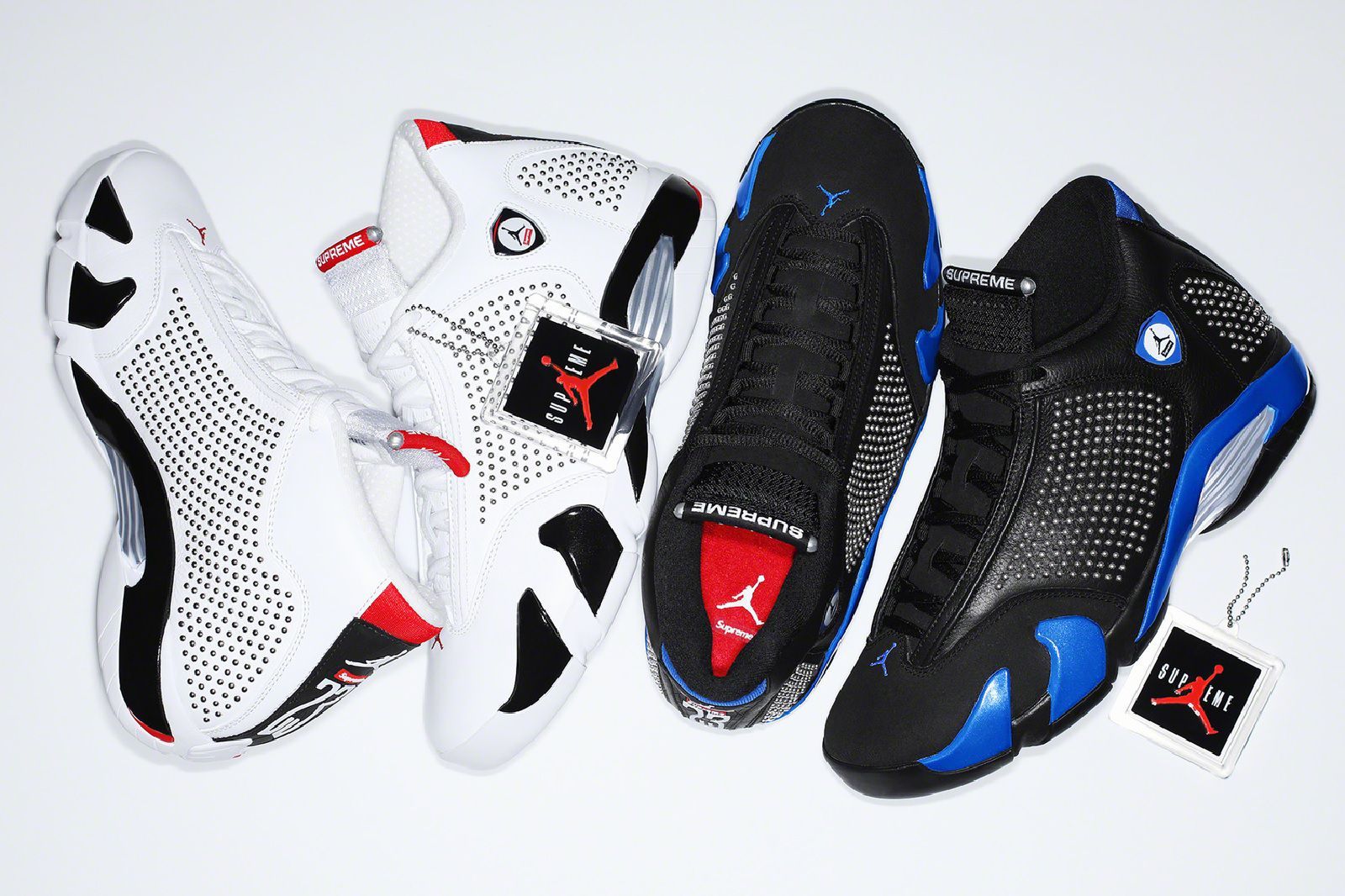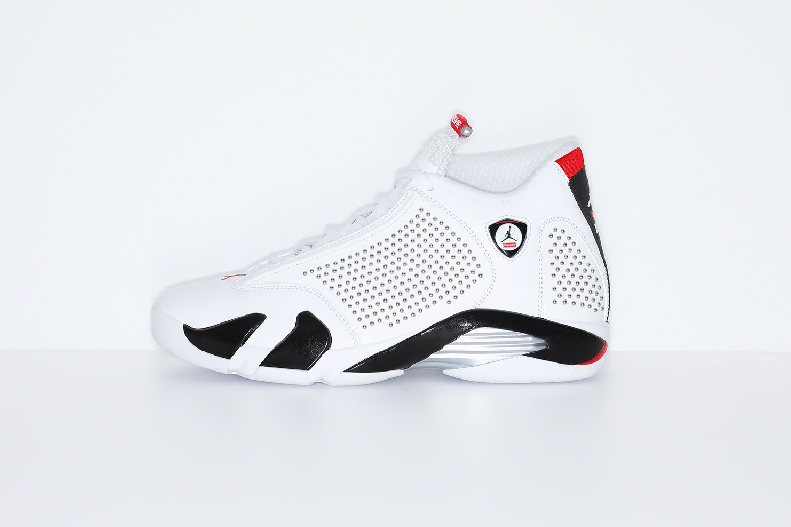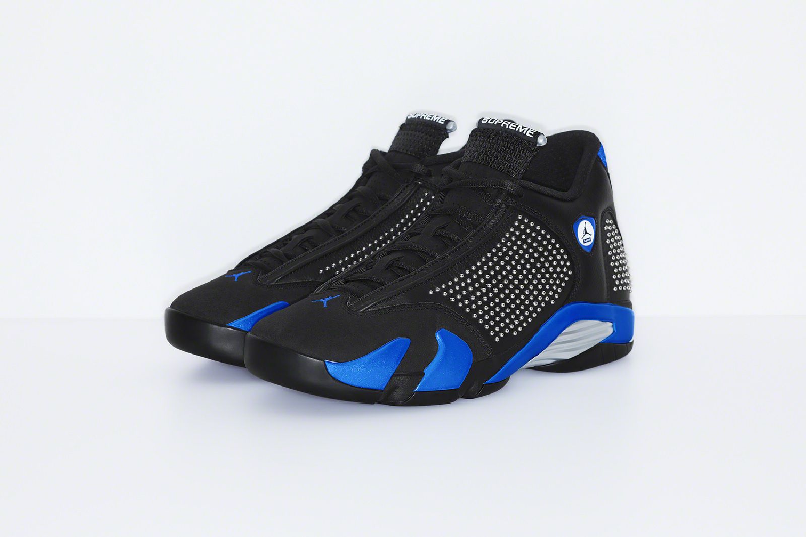 Dopo una prima collaborazione nel 2015, che comprendeva diverse varianti di Jordan V e alcuni capi d’abbigliamento, Supreme NY torna ad unire le forze con Jordan Brand e svela una nuova Air Jordan XIV. La sneaker, un culto da quando l'ha indossata Michael Jordan durante il "Game 6" delle finals NBA del 14 giugno 1998, è ispirata alla passione di MJ per la sua Ferrari 550 Maranello ed ora torna ora con un look ancora più deciso. La tomaia è in pelle e nabuk con borchie metalliche e accenti di rosso; pannelli a contrasto dell'intersuola, linguetta in mesh; co-branding e “23” stampato sul tallone. Realizzata in esclusiva per Supreme NY, l'Air Jordan XIV sarà proposta in due varianti di colore e sarà disponibile nei negozi di New York, Brooklyn, Los Angeles, Londra, Parigi e online il 13 giugno; in Giappone arriverà solamente il 16 giugno. Il prezzo previsto dovrebbe essere circa $248.