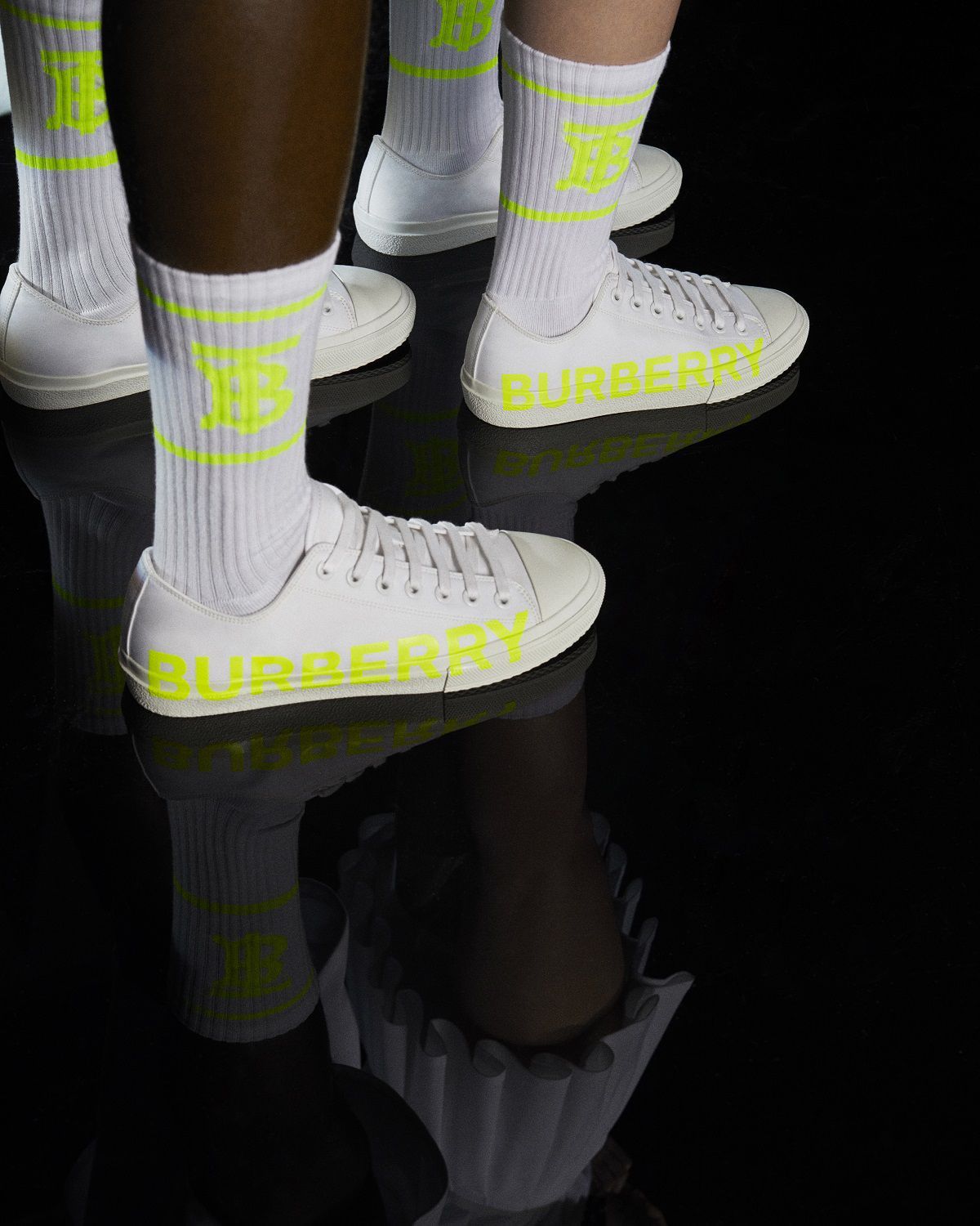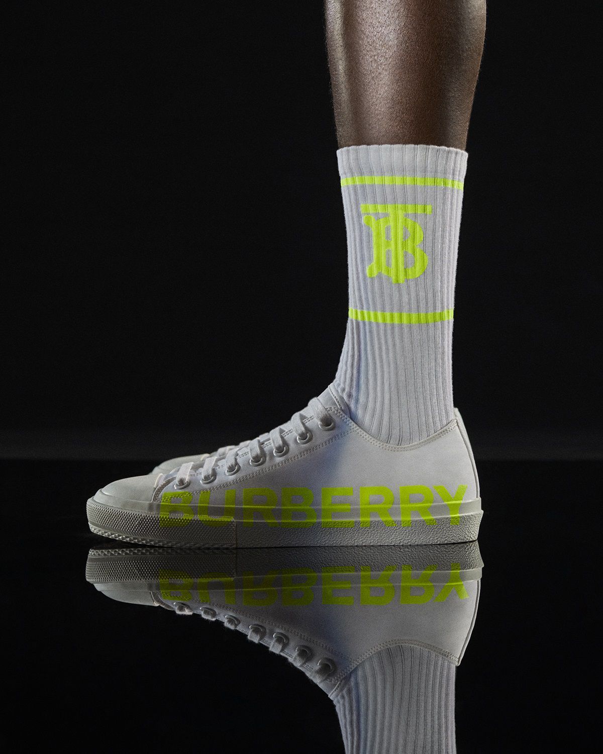 Solo per le prossime ore si potranno infatti acquistare un nuovo paio di calzini e un modello di sneaker basse e in tela. Entrambi gli item sono caratterizzati dal total white e impreziositi dal nuovo logo introdotto proprio dallo stilista italiano lo scorso anno, appena dopo essere approdato alla casa di moda inglese. Il bianco è spezzato da dettagli in neon, come la scritta "BURBERRY" che corre lungo tutta a tomaia laterale.