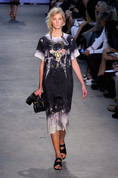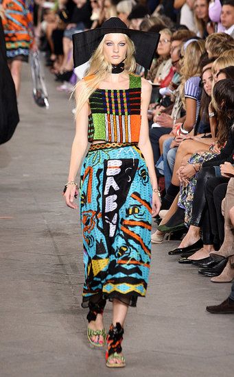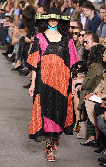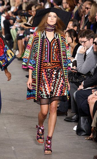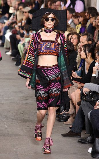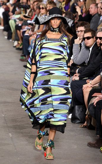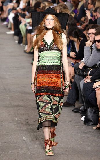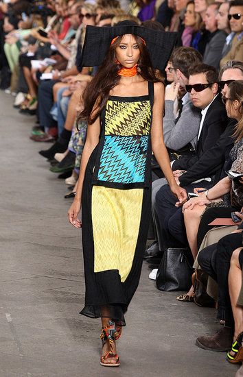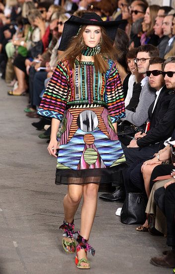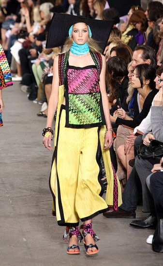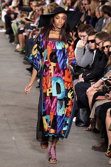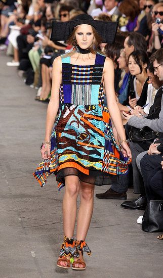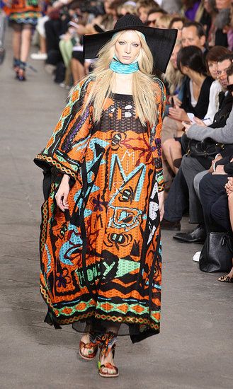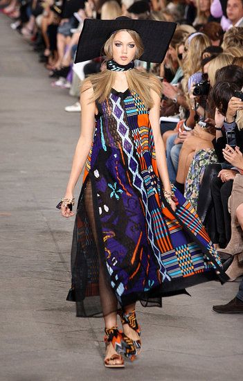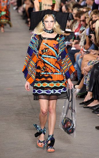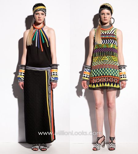 Principesche le sue linea: simboli tribali e geometrici e colori sgargianti non mancano, ma le linee degli abiti si fanno più eleganti a creare un netto contrasto tra fantasie e colori appariscenti e forme più austere.