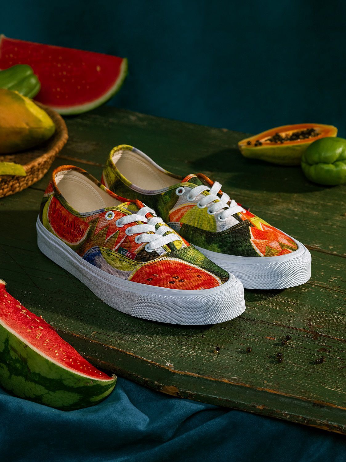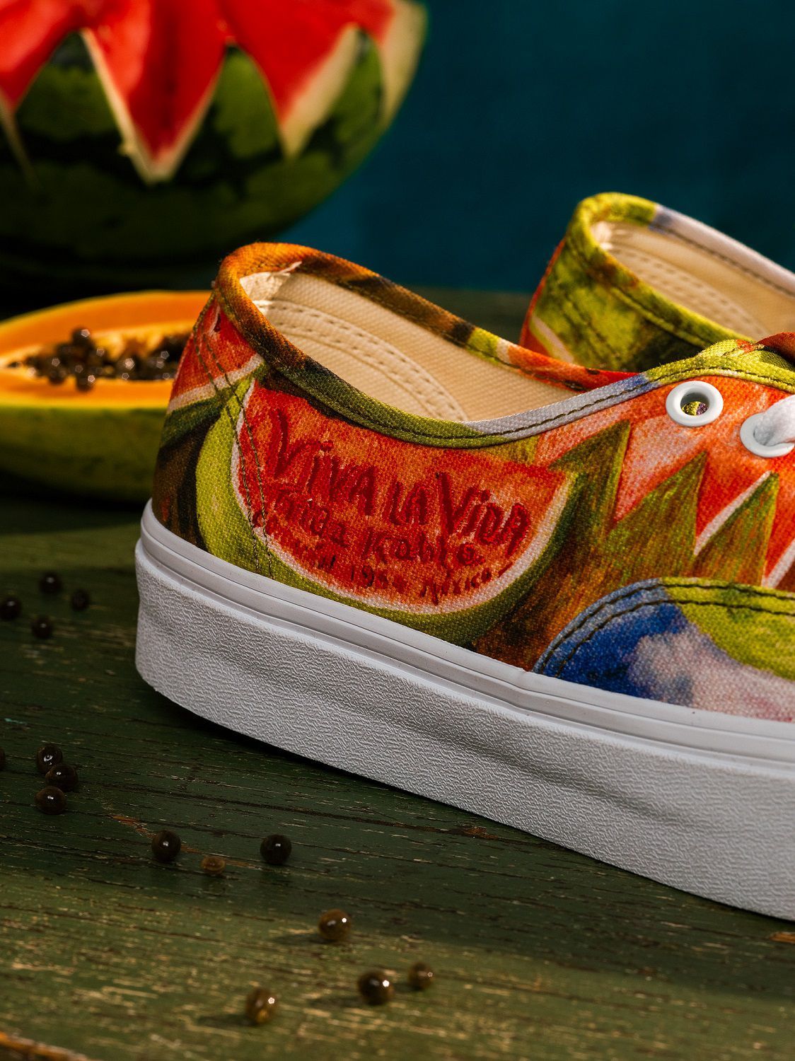 Protagonista del modello OG Authentic LX è una stampa all-over di angurie tagliate tratta da Viva la Vida, dipinto realizzato solo otto giorni prima della morte di Kahlo nel 1954. Completano il look la suola vulcanizzata bianca a contrasto e i lacci bianchi.