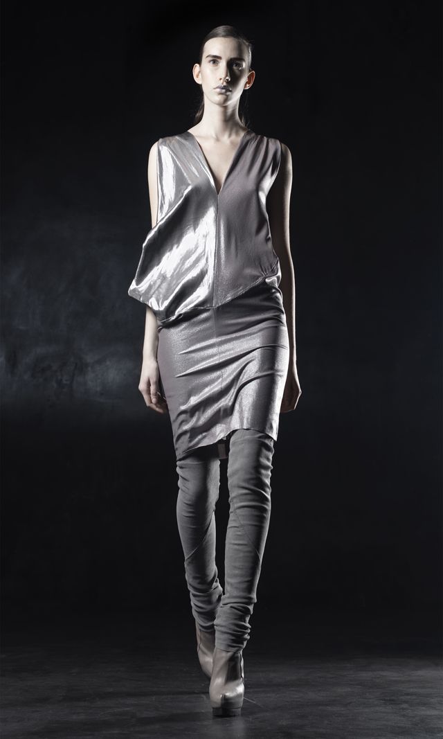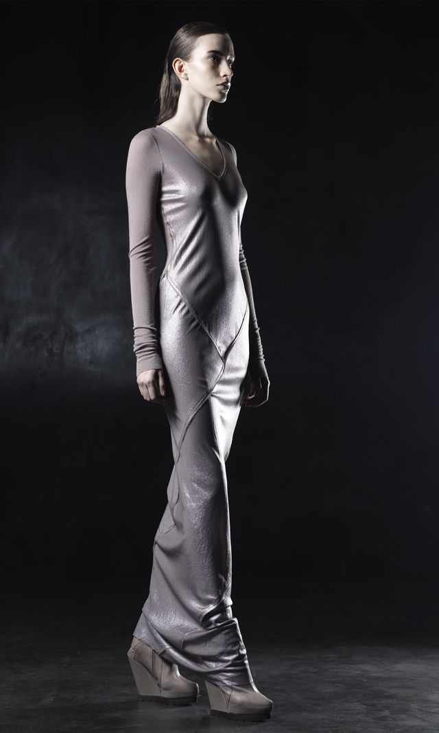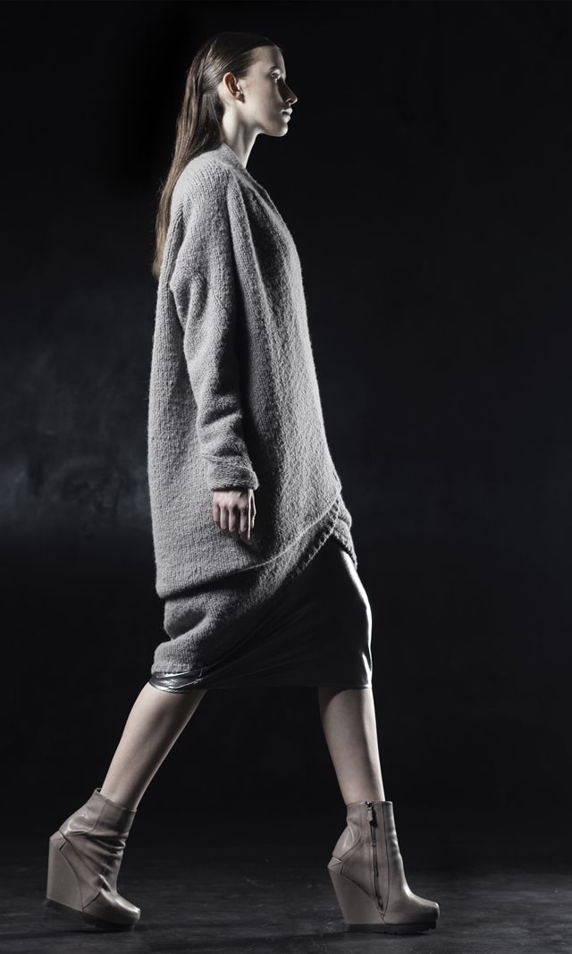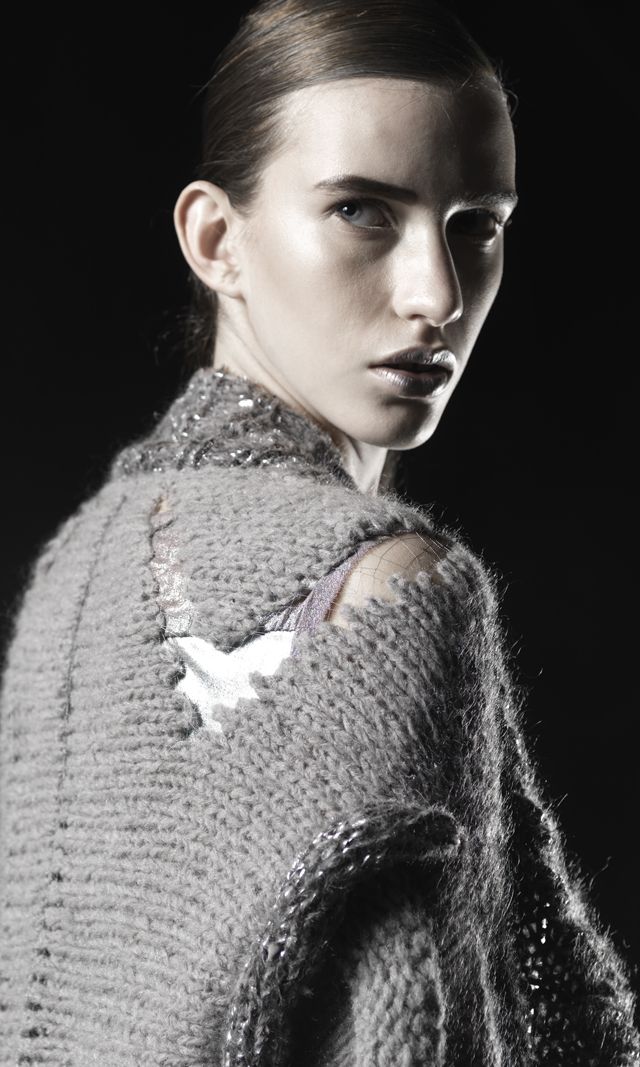 E' un viaggio interiore alla riscoperta dell'Io e di una intimità preziosa sollevata dall'inutilità degli orpelli, una disconnessione dal mondo circostante per calarsi in una sorta di gabbia dorata quale quella della "veste", con le sue porte chiuse verso l'esterno ma aperte su un corpo apparentemente calmo. Sulle note dei "Nike Cave and the Baad Seeds" l'abito inizia la sua lenta evoluzione: i tagli spirilizzati avvolgono l'intero corpo in una completa torsione partendo dalle maniche, quasi come in un prezioso raccoglimento dell'io su se stesso; la densa maglieria lavorata a mano, scivola su linee essenziali, in un fitto intreccio disfatto in punti focali ad intravedere minuziose rarefazioni metalliche per un'anima che traspare lucente dalle trame.
