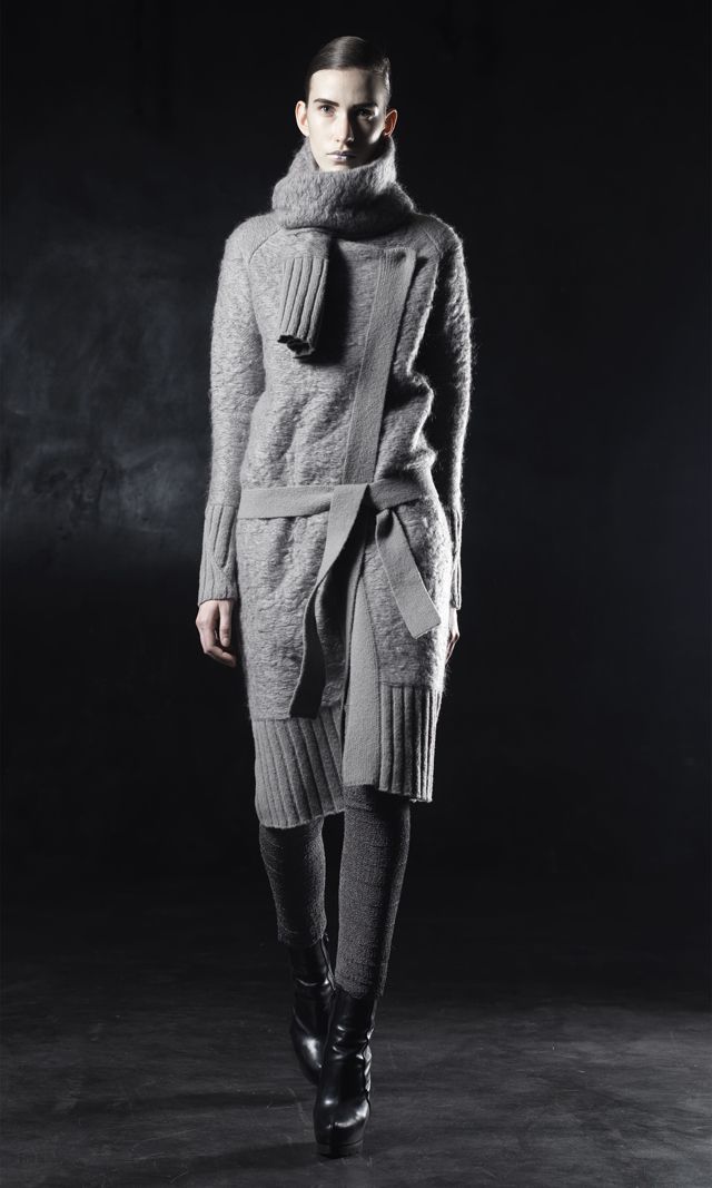 Alpaca e mohair, inserti di jersey ton sur ton, nastri metallici e lamine argento che esplodono nell'incontro con il raso o la georgette, morbidi movimenti enfatizzati da sinuosi effetti di chiaro-scuro ed elegante trasparenza o di riflessi specchiati.