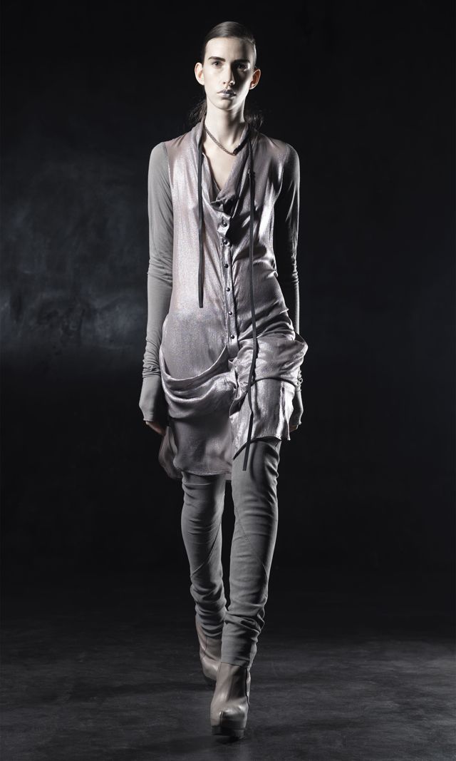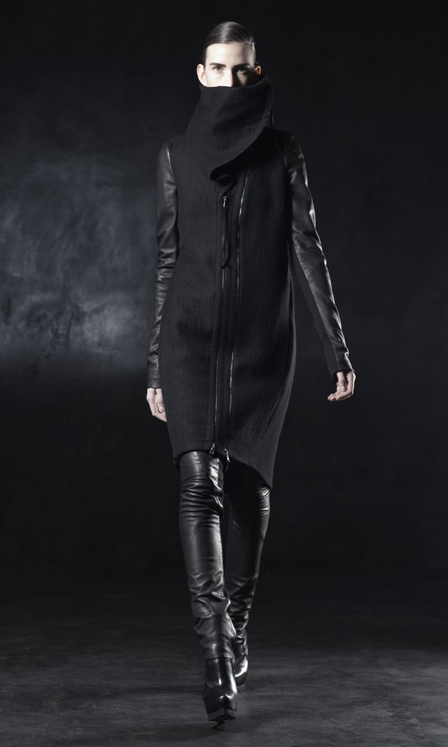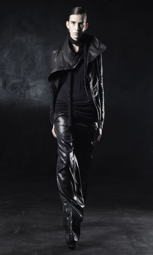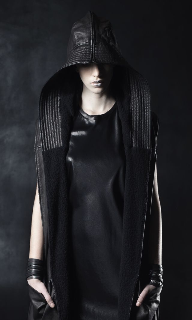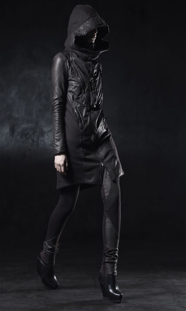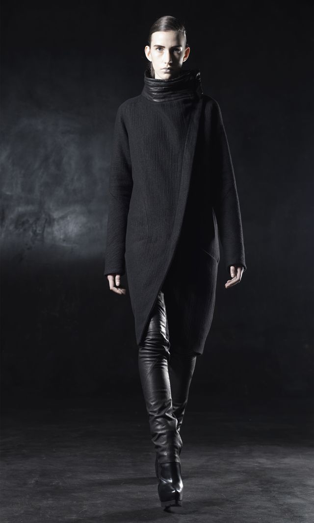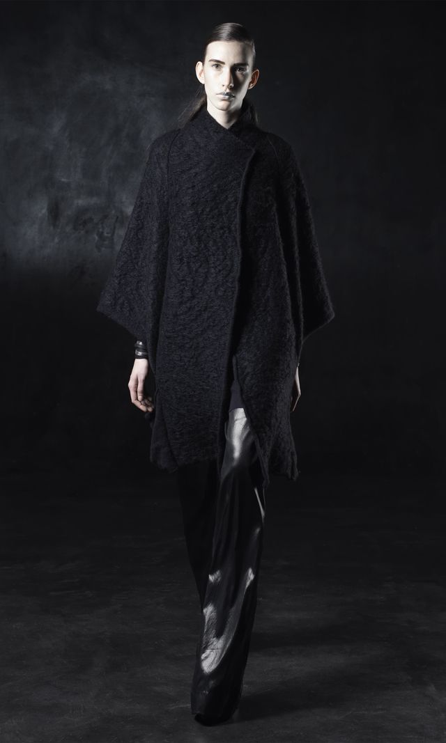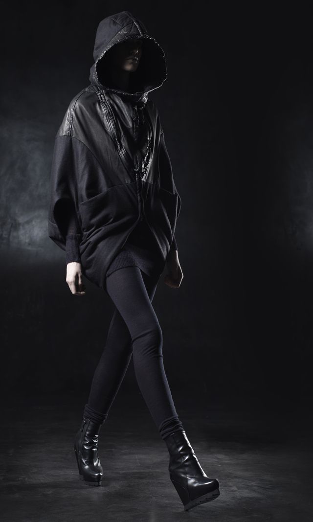 Importanti capospalla si innalzano intorno al corpo, lo circondano e lo proteggono in una corazza soft di pelle stretch o lavata a volte foderata di jersey infeltrito a donargli il confortevole calore di un guscio. Mantelle barocche rivisitate, new parka, colli ad imbuto, cappucci strutturati a celare apparentemente il volto ed ancora una pioggia di evidenti cerniere in un continuo scorrere lungo le linee morbide degli ampi volumi in evoluzione, aperture queste, pronte a schiudersi sulla realtà interiore dei fragili angeli urbani. Il tutto nelle tonalità del calce come protezione e del nero come potenza ad esaltare le sfumature dell'oro che incorniciano questa collezione, quasi a celebrare la centralità dell'Io stesso.
