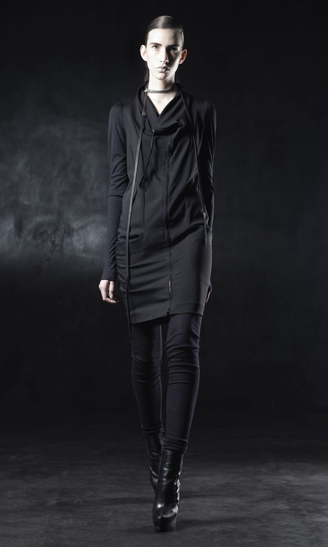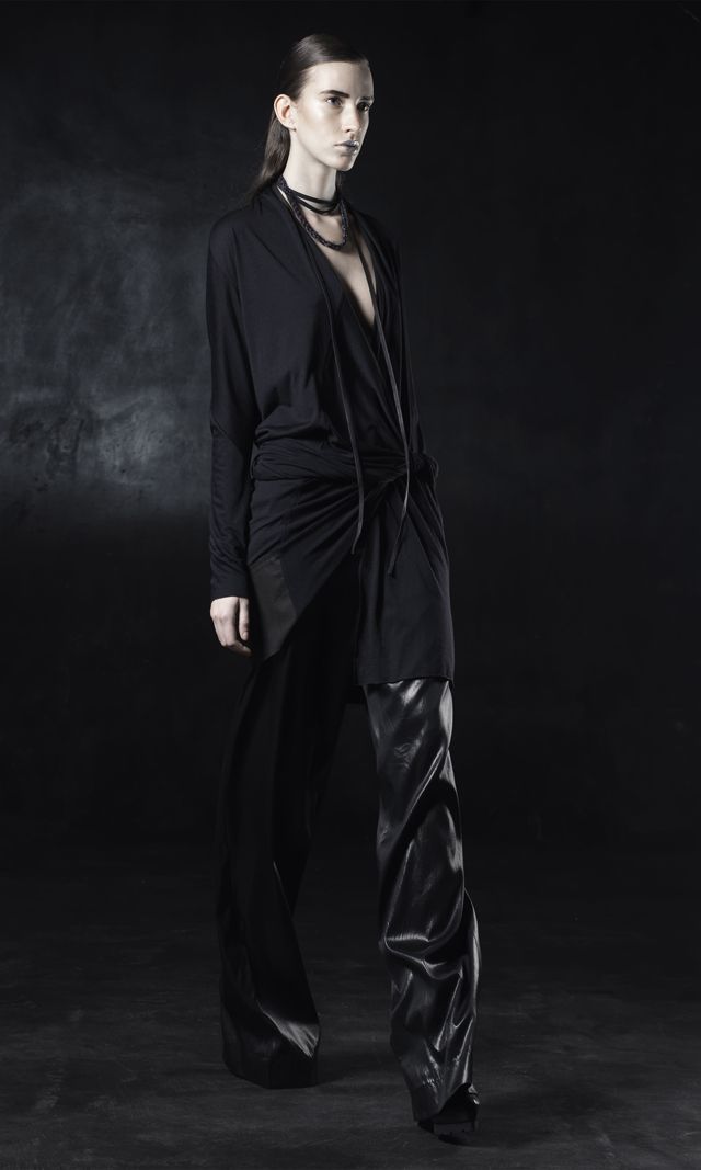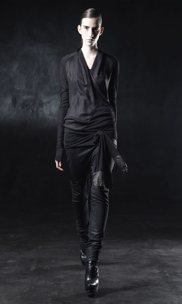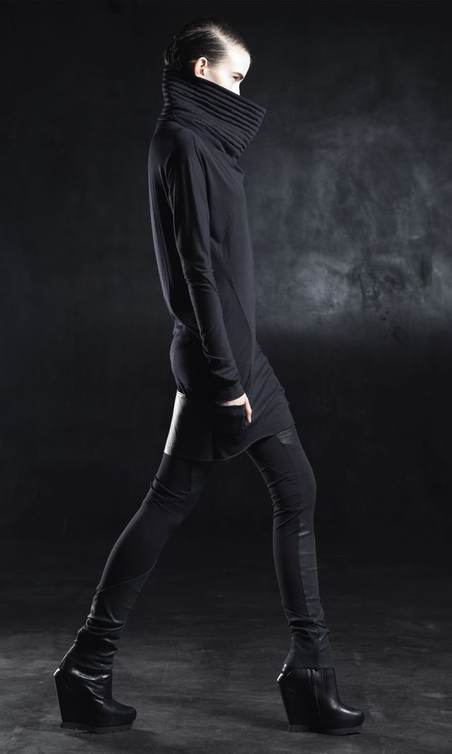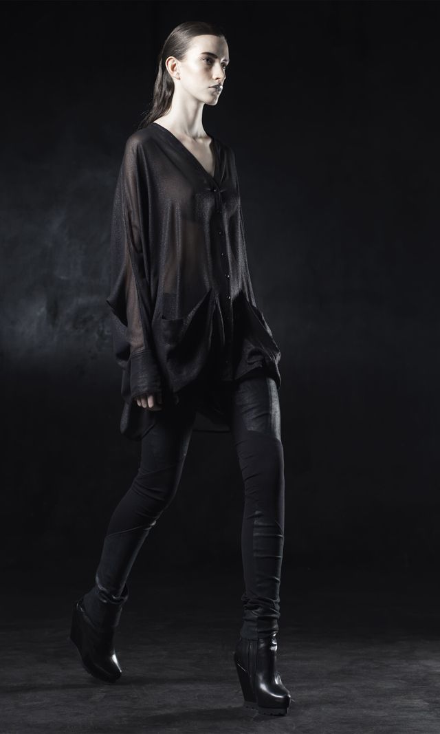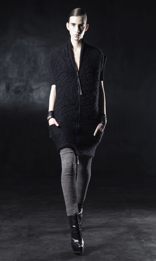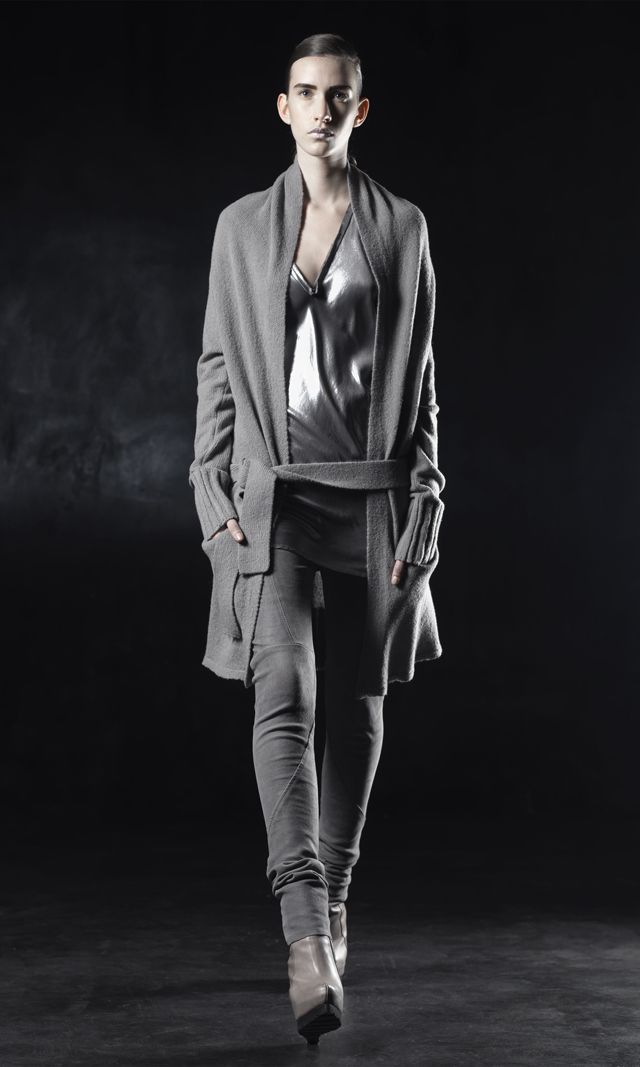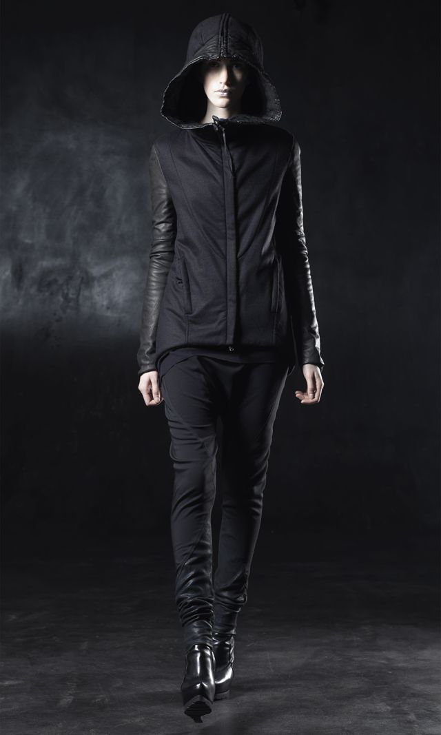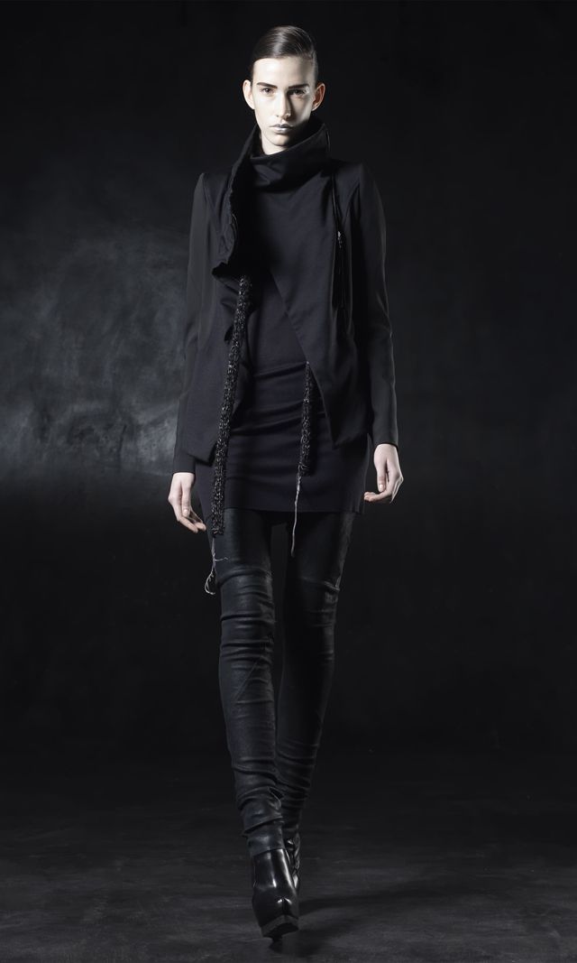 Importanti capospalla si innalzano intorno al corpo, lo circondano e lo proteggono in una corazza soft di pelle stretch o lavata a volte foderata di jersey infeltrito a donargli il confortevole calore di un guscio. Mantelle barocche rivisitate, new parka, colli ad imbuto, cappucci strutturati a celare apparentemente il volto ed ancora una pioggia di evidenti cerniere in un continuo scorrere lungo le linee morbide degli ampi volumi in evoluzione, aperture queste, pronte a schiudersi sulla realtà interiore dei fragili angeli urbani. Il tutto nelle tonalità del calce come protezione e del nero come potenza ad esaltare le sfumature dell'oro che incorniciano questa collezione, quasi a celebrare la centralità dell'Io stesso.