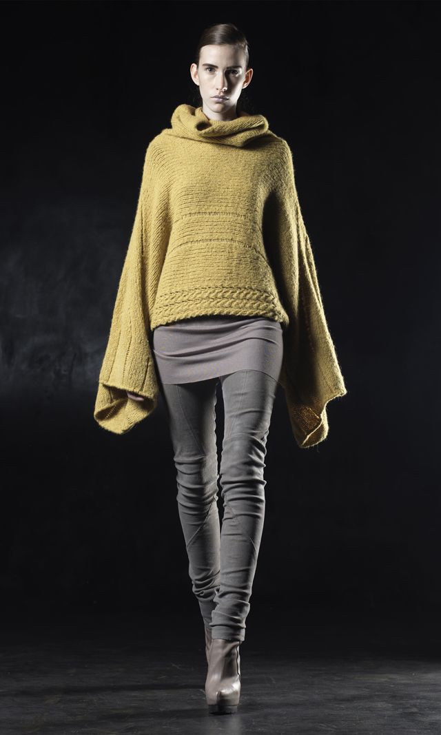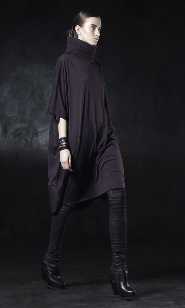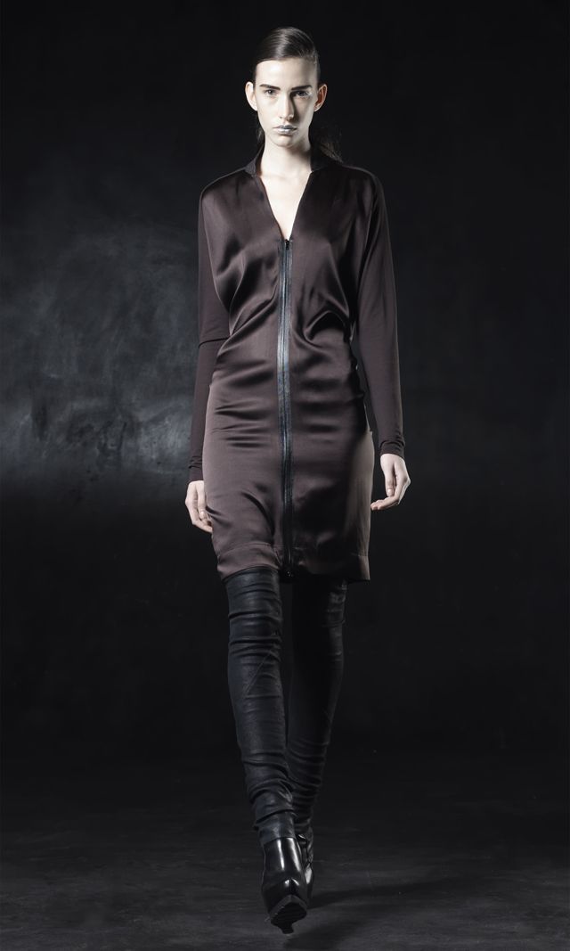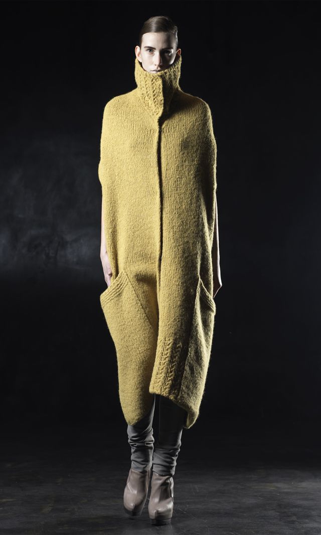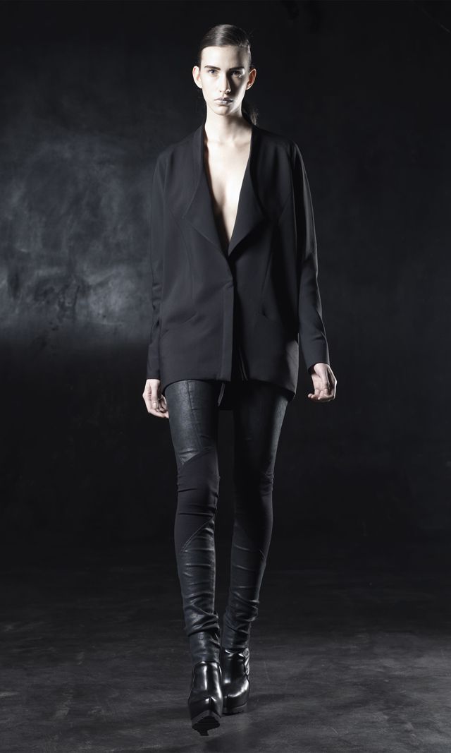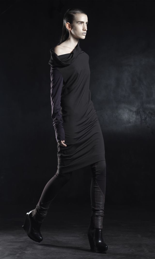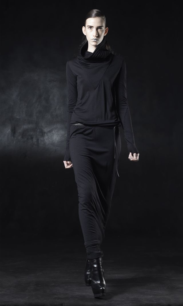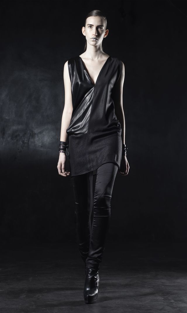 Importanti capospalla si innalzano intorno al corpo, lo circondano e lo proteggono in una corazza soft di pelle stretch o lavata a volte foderata di jersey infeltrito a donargli il confortevole calore di un guscio. Mantelle barocche rivisitate, new parka, colli ad imbuto, cappucci strutturati a celare apparentemente il volto ed ancora una pioggia di evidenti cerniere in un continuo scorrere lungo le linee morbide degli ampi volumi in evoluzione, aperture queste, pronte a schiudersi sulla realtà interiore dei fragili angeli urbani. Il tutto nelle tonalità del calce come protezione e del nero come potenza ad esaltare le sfumature dell'oro che incorniciano questa collezione, quasi a celebrare la centralità dell'Io stesso.