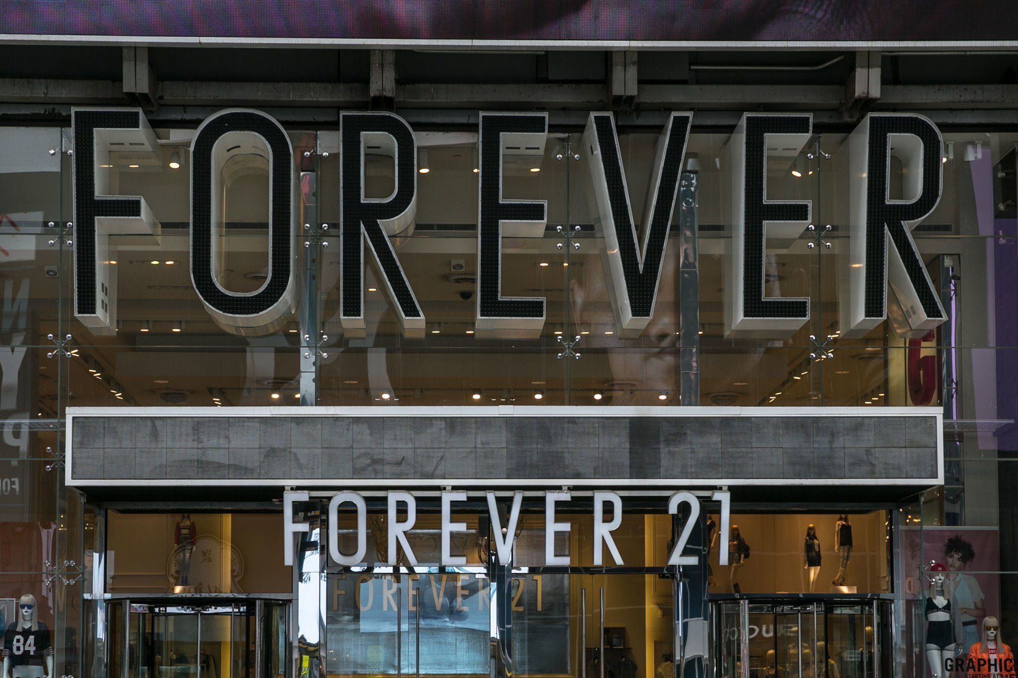 UPDATE: Domenica 29 settembre Forever 21 ha richiesto l'attivazione del "Chapter 11", ovvero la legge federale statunitense che consente alle imprese un risanamento a seguito di un grave dissesto finanziario. La catena americana ha annunciato la chiusura di 350 negozi in tutto il mondo, con la maggioranza in Asia e Europa. Per il momento il brand si concentrerà sulle attività più redditizie e rimarranno aperti solamente gli store negli Stati Uniti, America Latina e Messico
