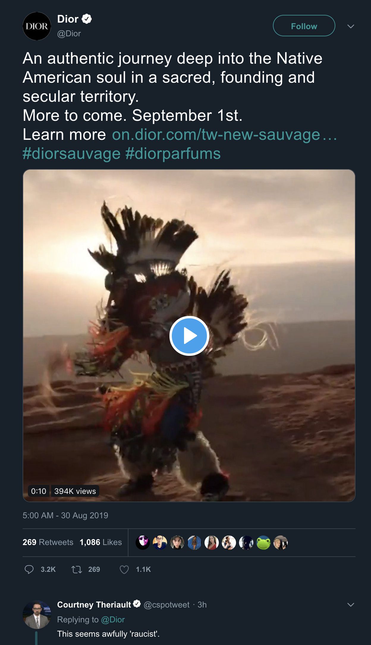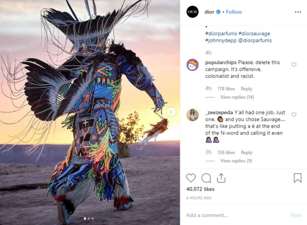 L'ultima Maison a subire l'ira dei critici di Twitter e Instagram è stata Dior, che durante il weekend appena trascorso ha presentato la campagna pubblicitaria per la sua nuova fragranza, chiamata Sauvage. Il progetto è stato immediatamente accusato di appropriazione culturale e razzismo, dato che il concept del video riguardava la cultura dei Nativi Americani. Il brand ha pubblicato sui propri canali il video che accompagna la campagna e che ha come protagonista l'attore Johnny Depp, con la caption Un viaggio autentico nell'anima dei nativi americani in un territorio sacro, fondatore e secolare.