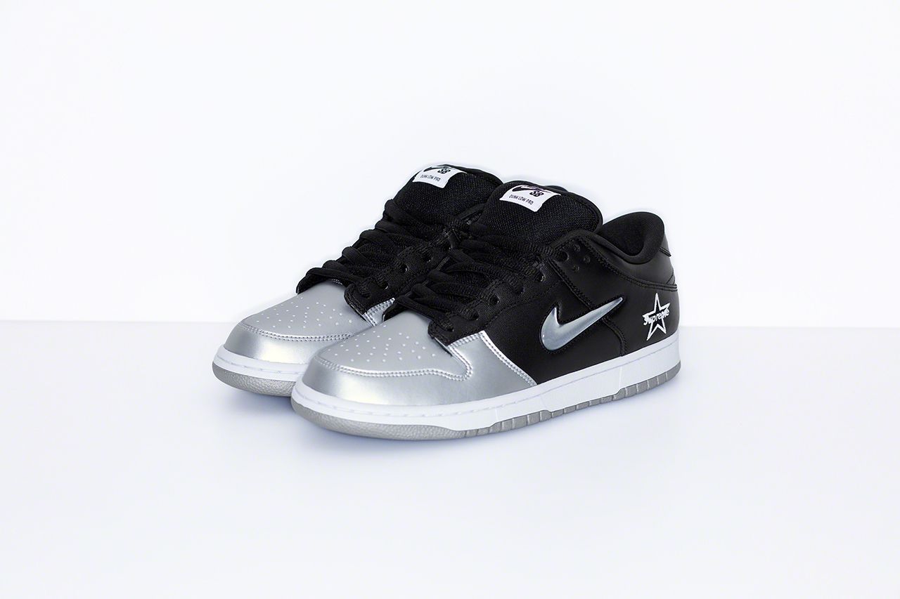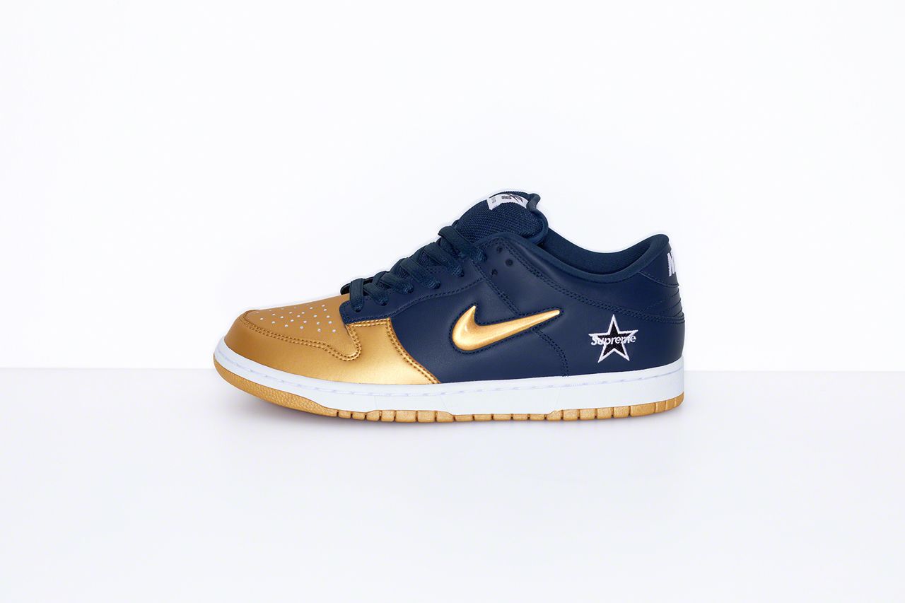Questa stagione la Dunk Low è declinata in pelle, in tre diverse colorazioni: white/red, black/silver, e navy/gold. La sneaker è arricchita da uno Swoosh jewel, oltre ad una stelle cucita sulla parte laterale della scarpa.