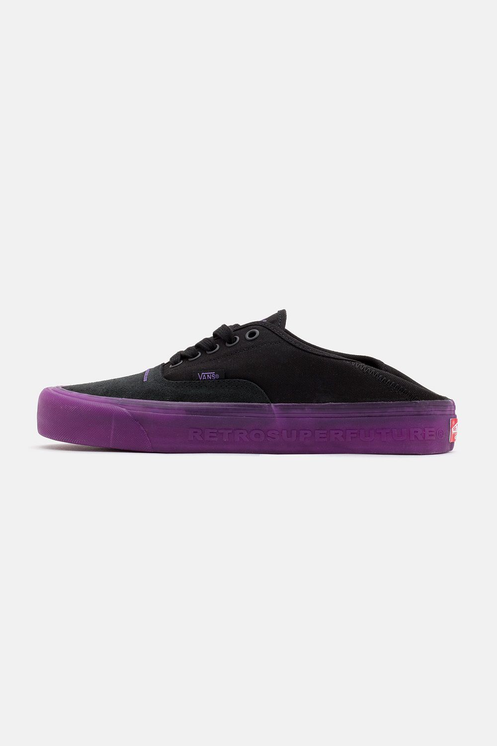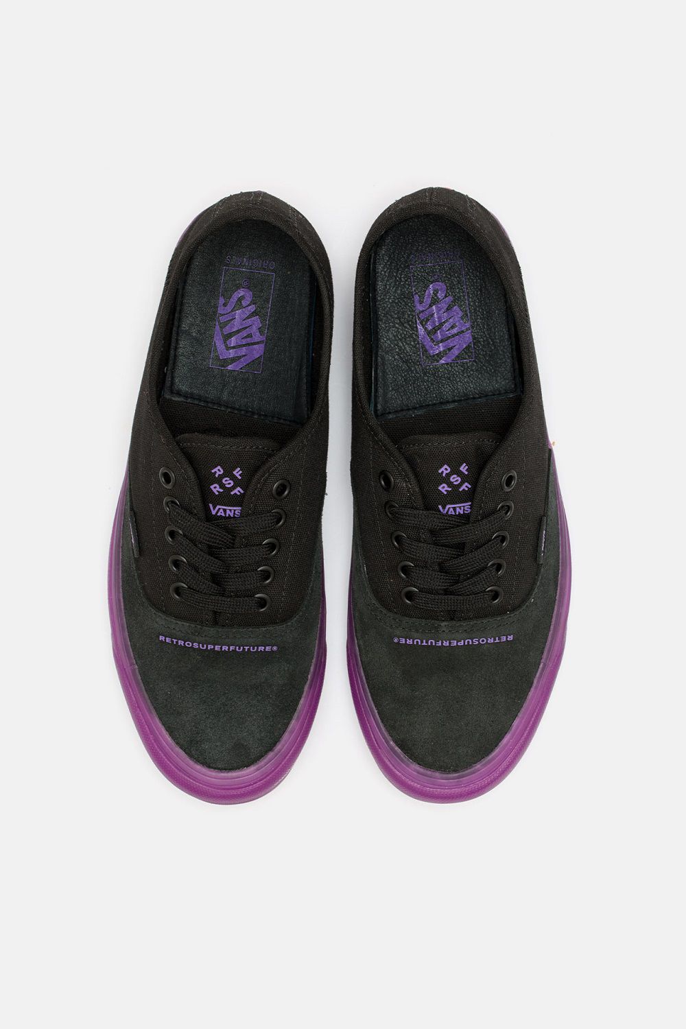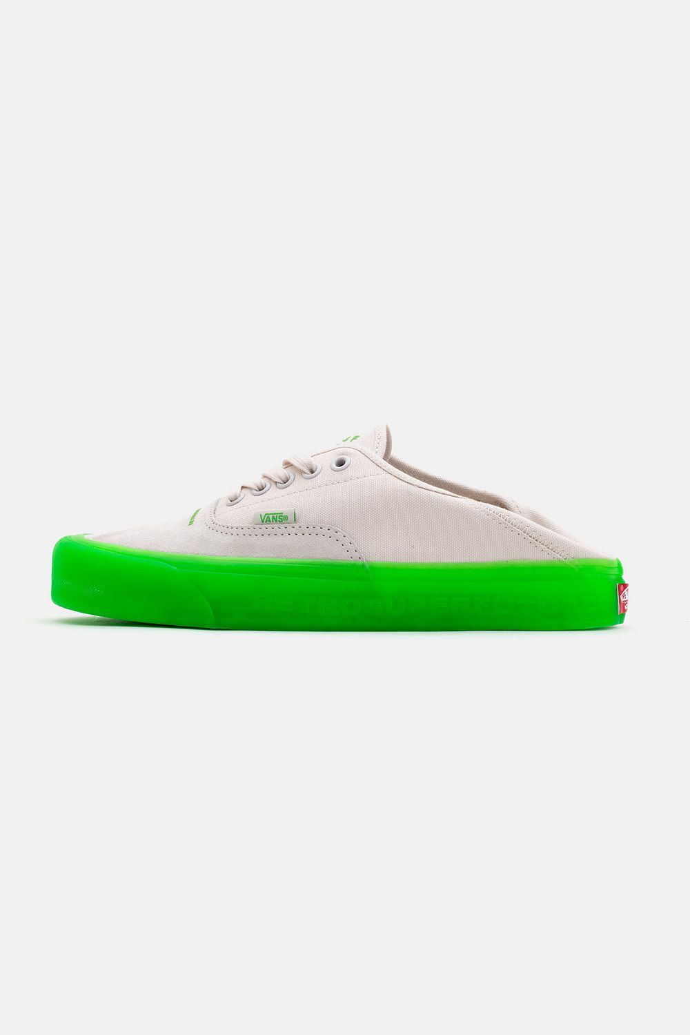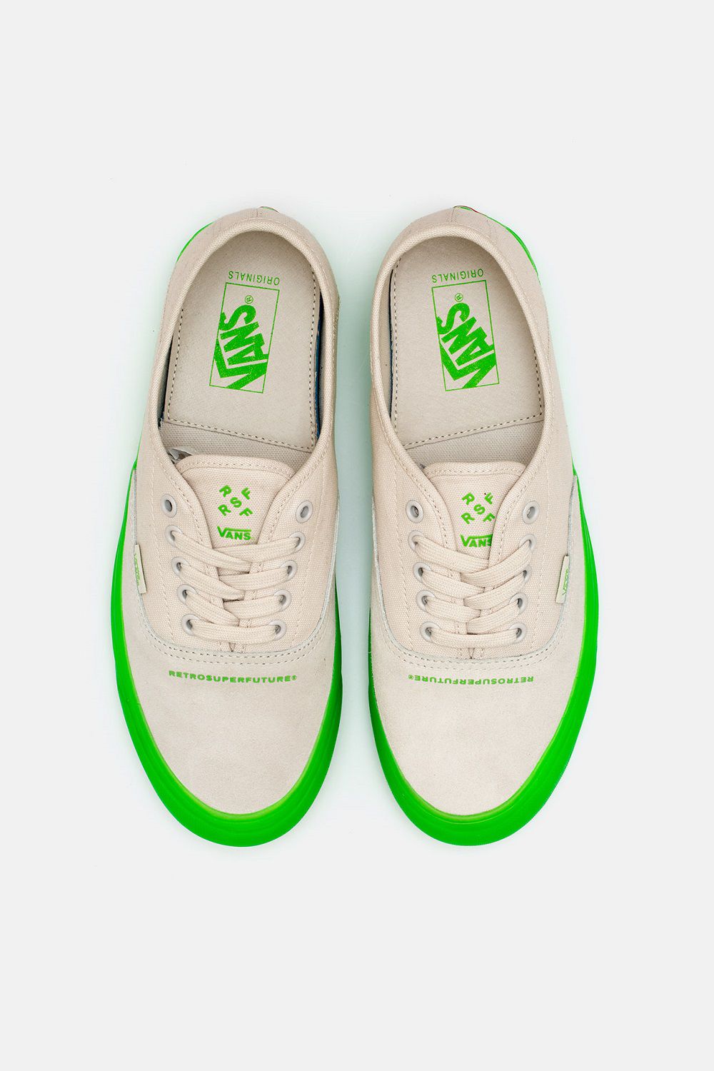 Trait d’union di ogni pezzo è una palette basata sul contrasto tra colori classici e sfumature neon, in particolare il kaki è accoppiato con il verde acido ed il nero con un vibrante viola. Gli stessi contrasti cromatici caratterizzano le due versioni di OG Style 43 XL di Vans, vero must have della capsule. La sneaker mantiene la classica costruzione in tela, ma la mixa con la pelle scamosciata sulla punta della scarpa per donare al design un elegante un tocco di robustezza. La tomaia completamente bianca o nera acquista un twist giocoso grazie alle suole semitrasparenti verdi e viola, impreziosite dal branding RETROSUPERFUTURE che impreziosisce i lati, la parte anteriore delle calzatura e la linguetta.