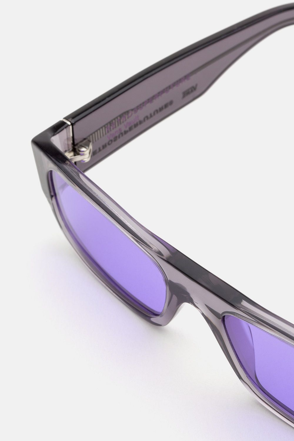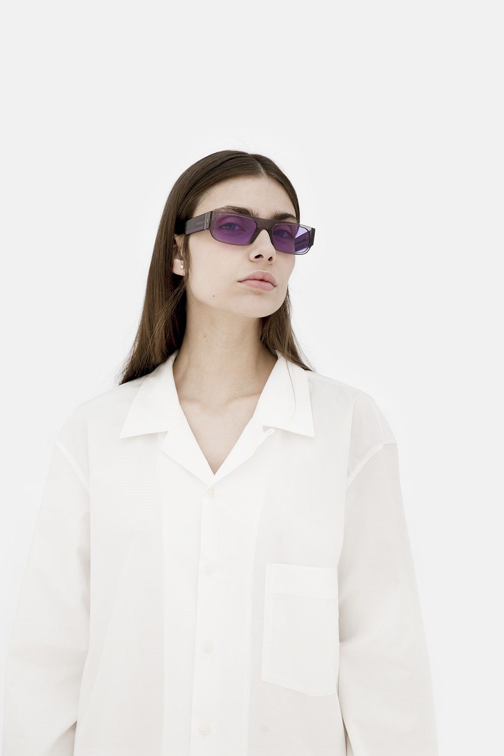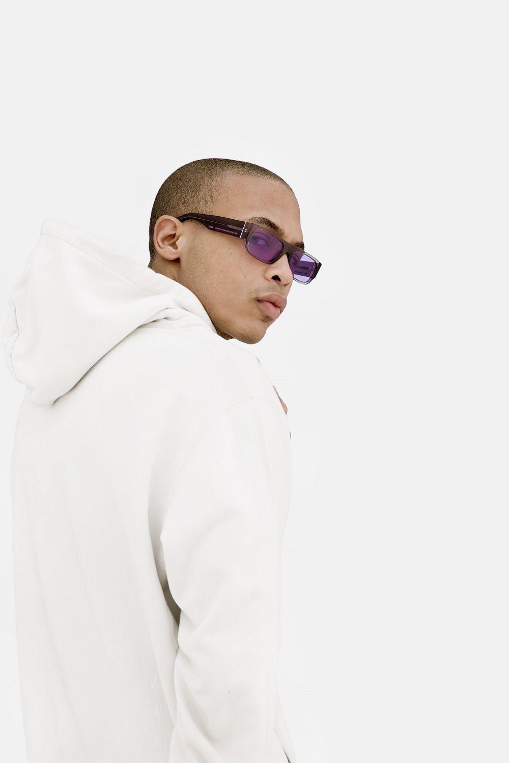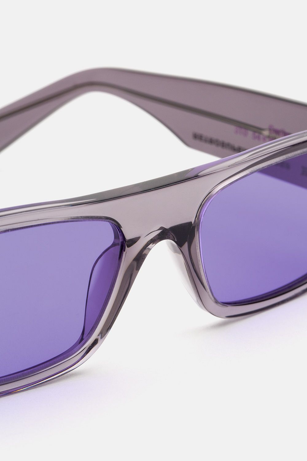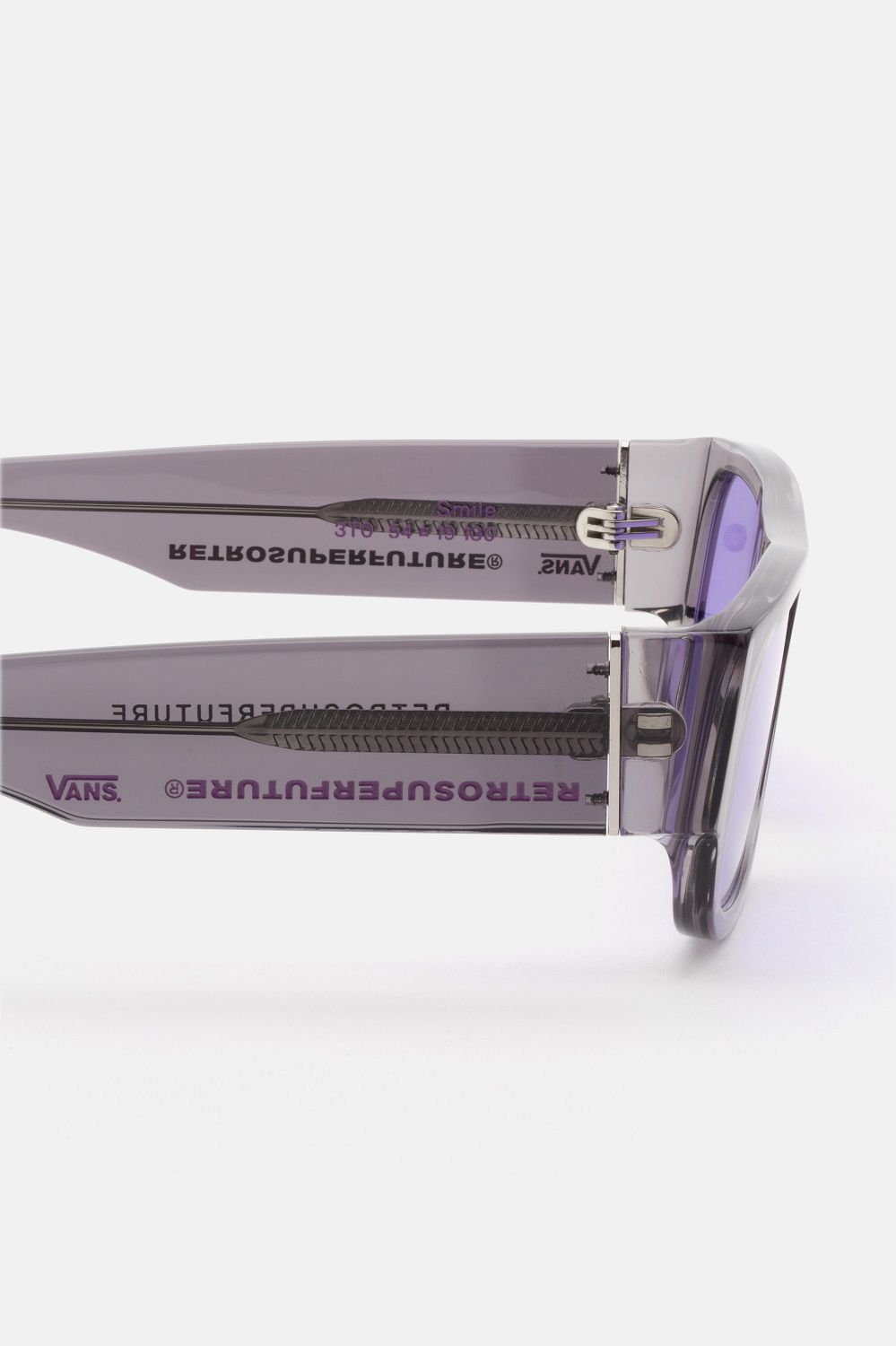 La nuova versione di RSF Smile, ispirata alle classiche icone street, presenta un design unico anni '90, con profilo basso e spesse stanghette, abbinate a lenti viola o lime e un cristallo di acetato nero o kaki. Completano il look scritte grafiche sull'esterno del telaio.