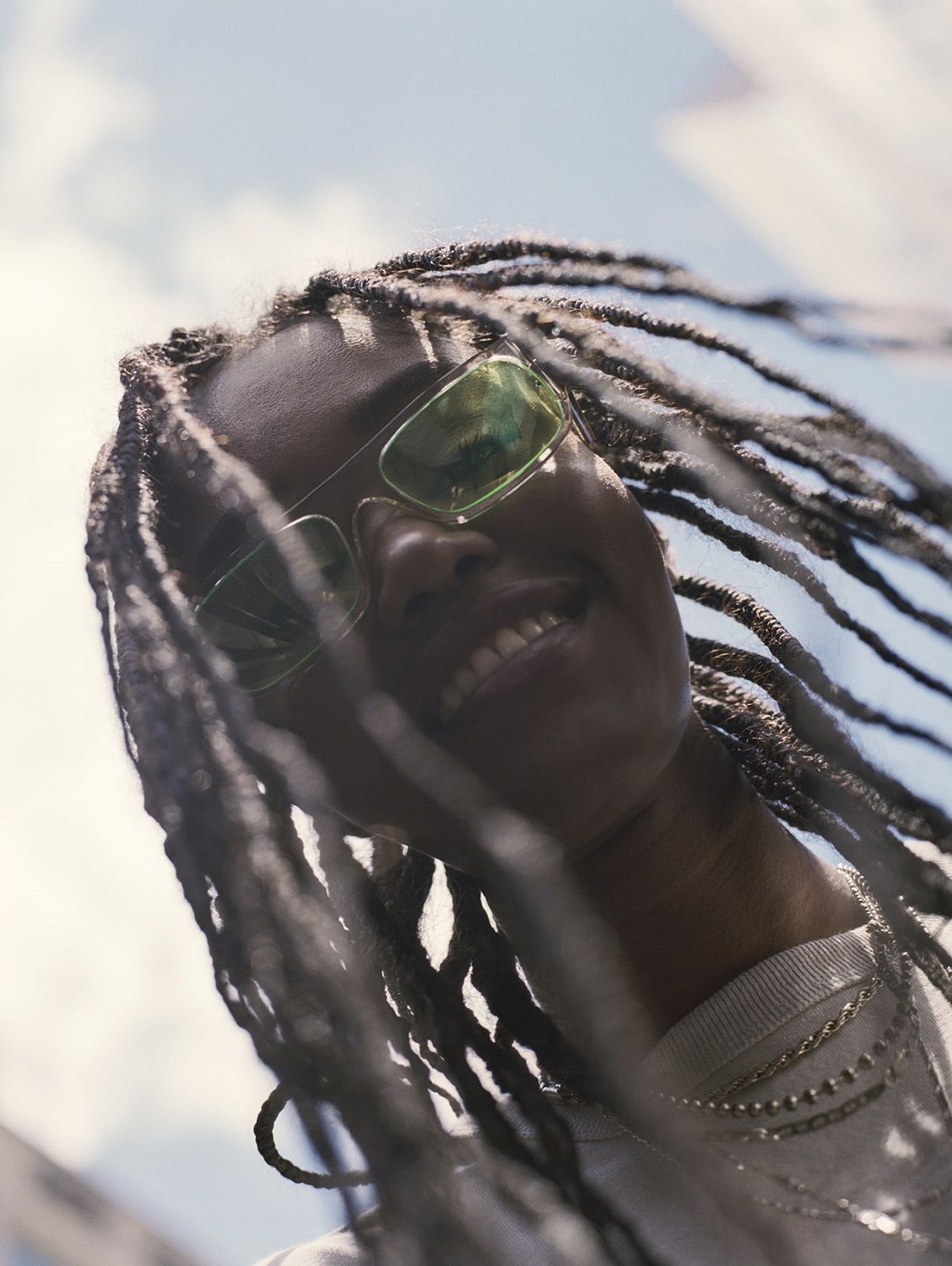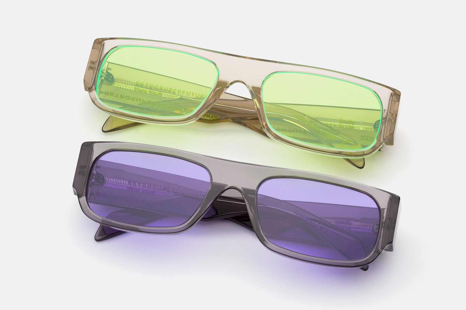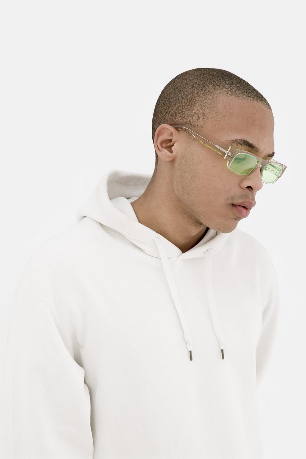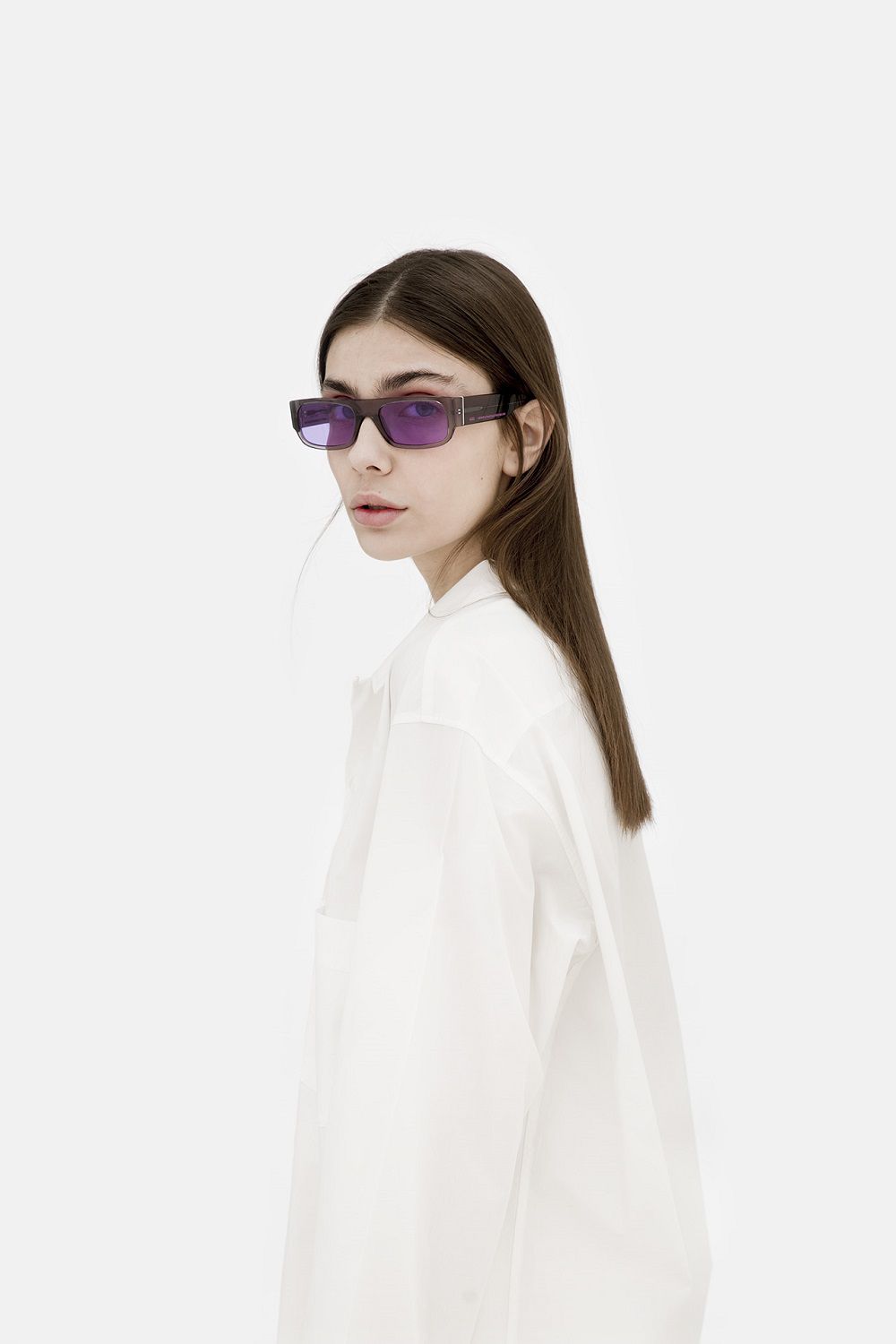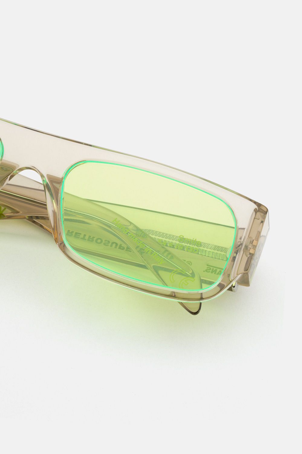 La nuova versione di RSF Smile, ispirata alle classiche icone street, presenta un design unico anni '90, con profilo basso e spesse stanghette, abbinate a lenti viola o lime e un cristallo di acetato nero o kaki. Completano il look scritte grafiche sull'esterno del telaio.