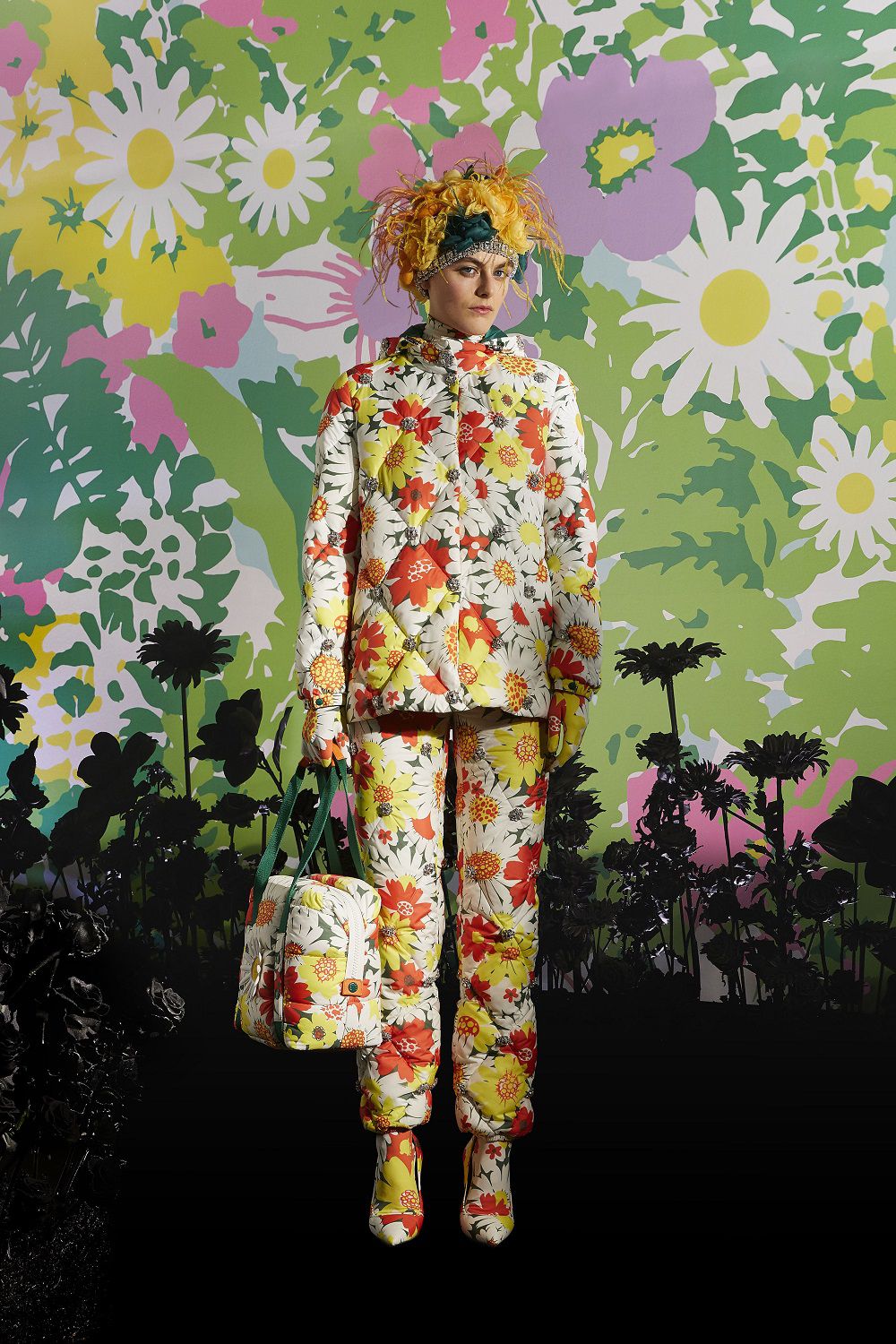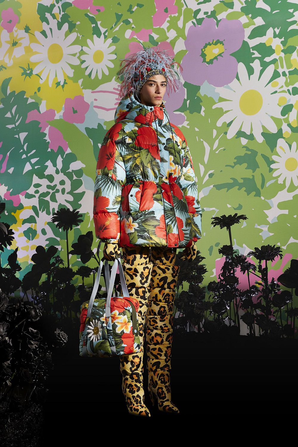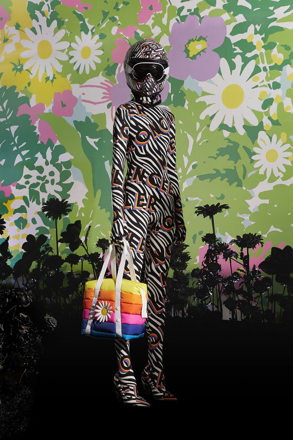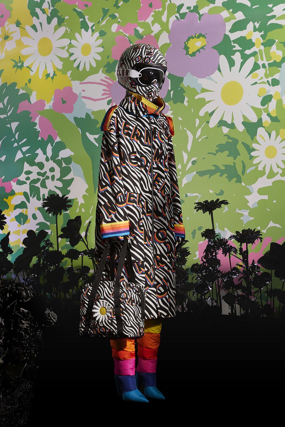 Il risultato, ispirato all'eleganza della couture degli anni '50 e '60, è una combinazione di outerwear accattivante, tute stampate e cuissard imbottiti. Un mix'n'match di stampe vibranti invade ogni capo: dalle giacche imbottite in piuma con maniche a bracciale e chiusura diamantata ai bodysuit, dai pajamas suit trapuntati con bottoni gioiello ai piumini oversize in versione animalier, dai piumini con la scritta Moncler a caratteri cubitali dal mood eighties ai cuissard con tacco a banana.