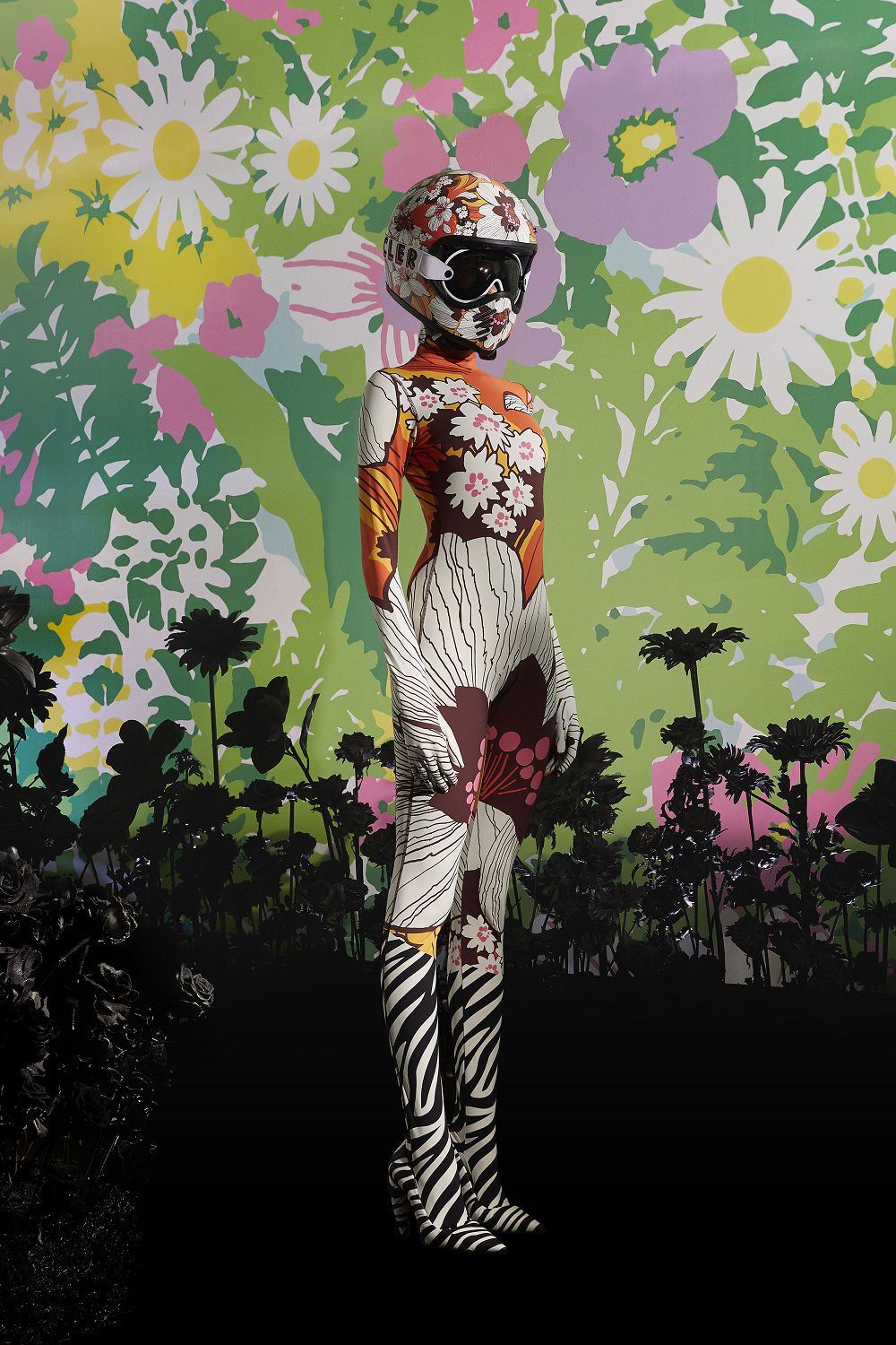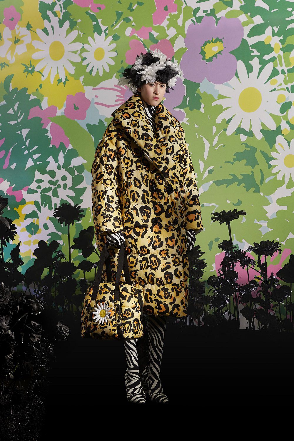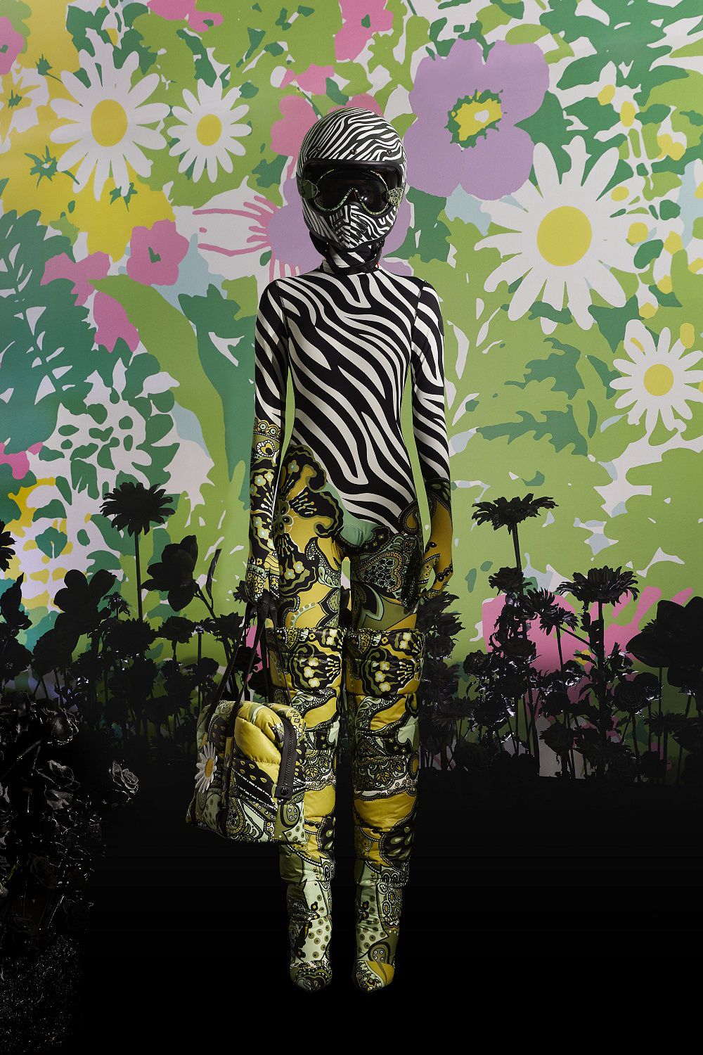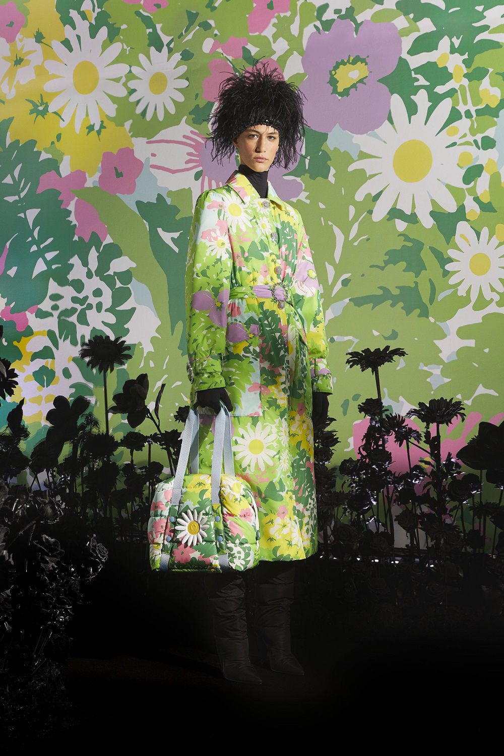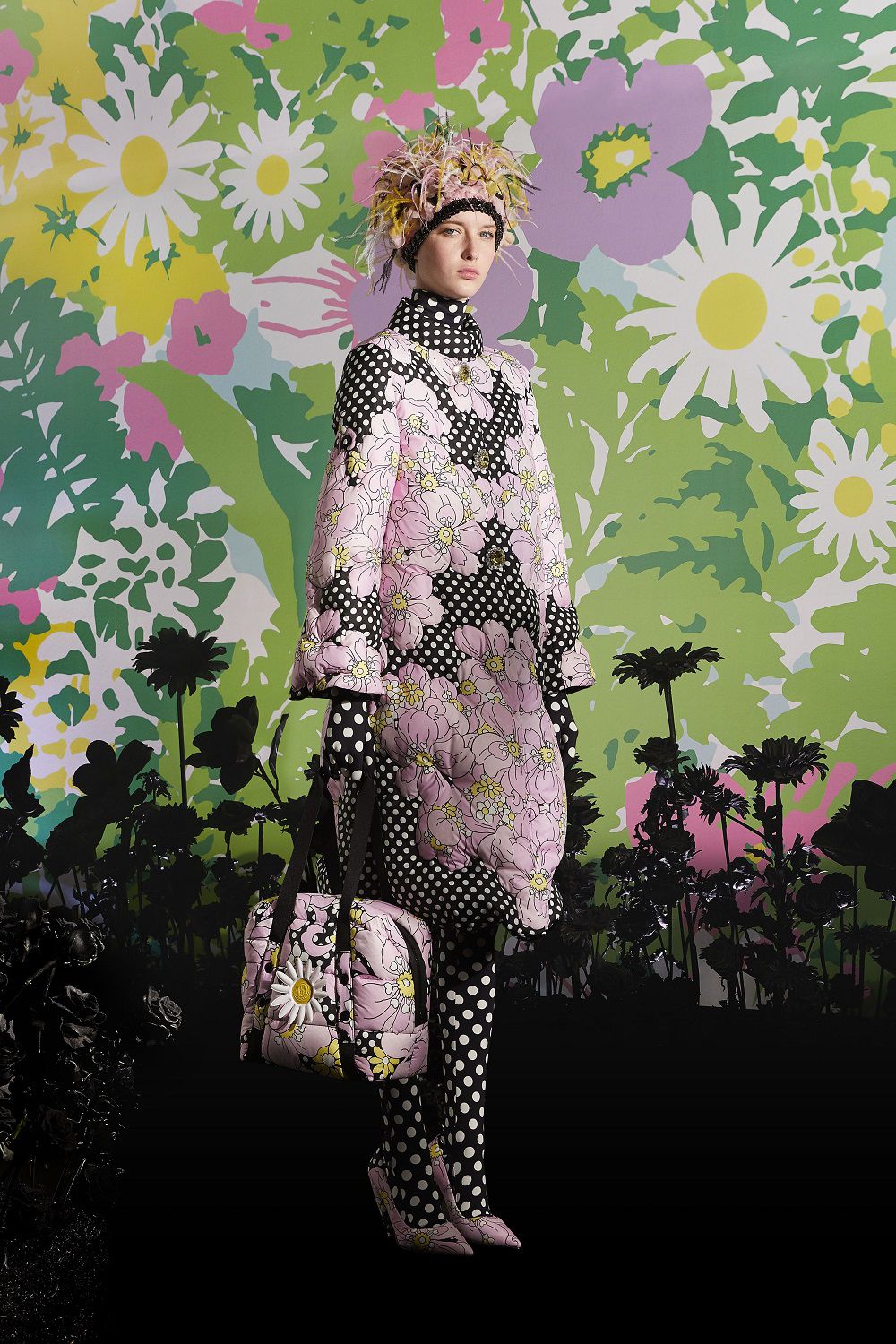 Il risultato, ispirato all'eleganza della couture degli anni '50 e '60, è una combinazione di outerwear accattivante, tute stampate e cuissard imbottiti. Un mix'n'match di stampe vibranti invade ogni capo: dalle giacche imbottite in piuma con maniche a bracciale e chiusura diamantata ai bodysuit, dai pajamas suit trapuntati con bottoni gioiello ai piumini oversize in versione animalier, dai piumini con la scritta Moncler a caratteri cubitali dal mood eighties ai cuissard con tacco a banana.