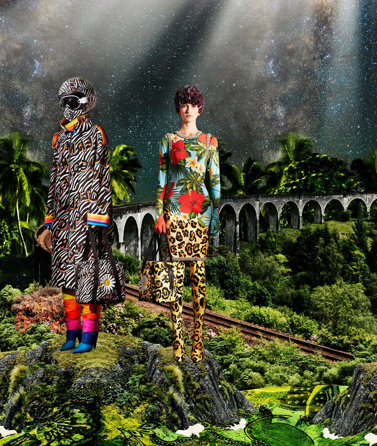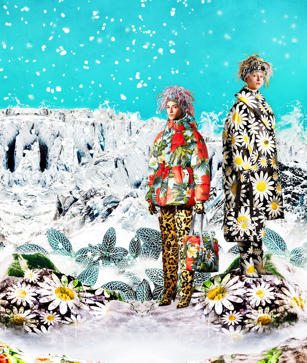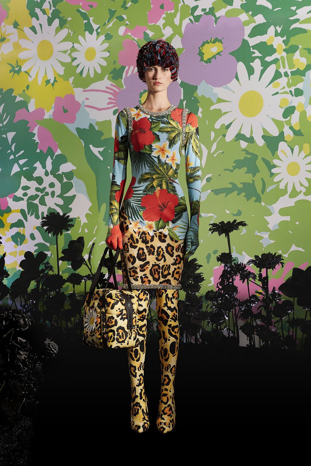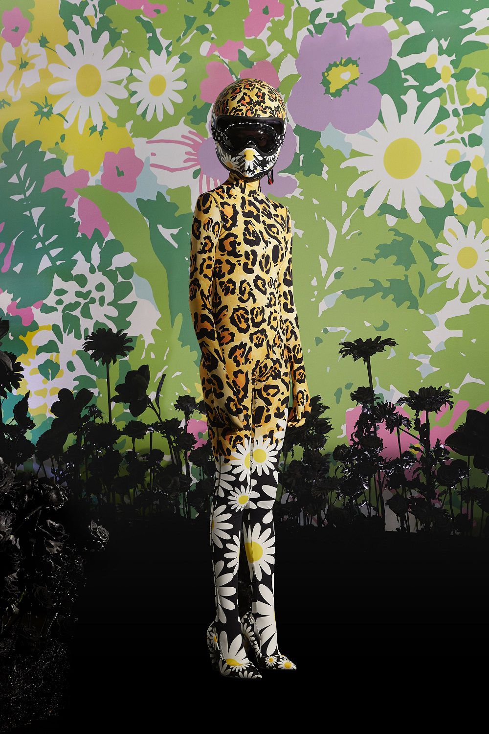 Il risultato, ispirato all'eleganza della couture degli anni '50 e '60, è una combinazione di outerwear accattivante, tute stampate e cuissard imbottiti. Un mix'n'match di stampe vibranti invade ogni capo: dalle giacche imbottite in piuma con maniche a bracciale e chiusura diamantata ai bodysuit, dai pajamas suit trapuntati con bottoni gioiello ai piumini oversize in versione animalier, dai piumini con la scritta Moncler a caratteri cubitali dal mood eighties ai cuissard con tacco a banana.